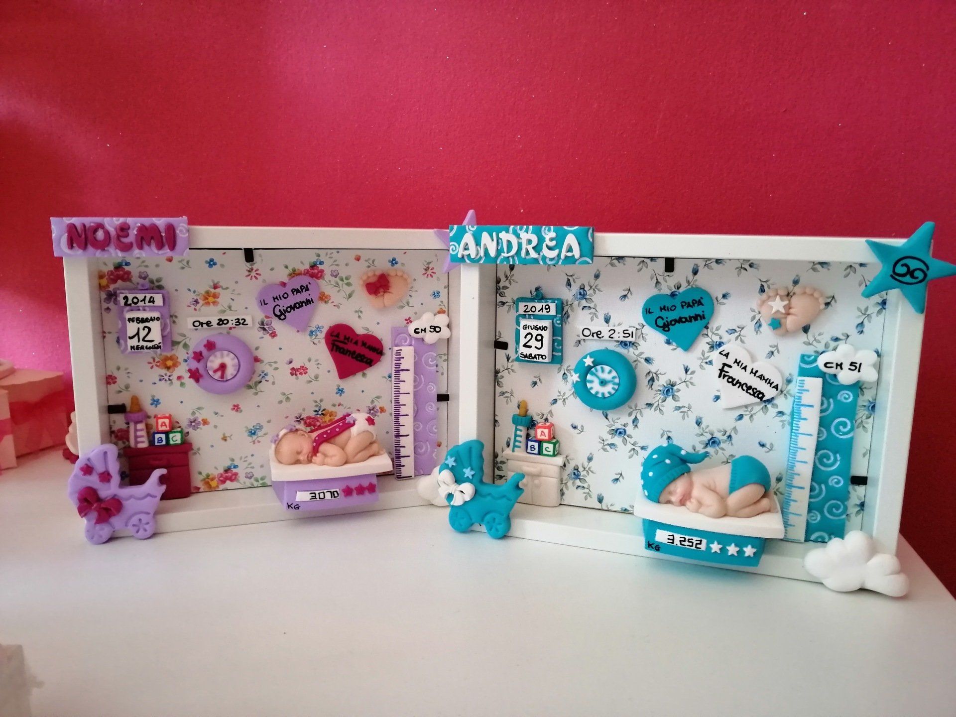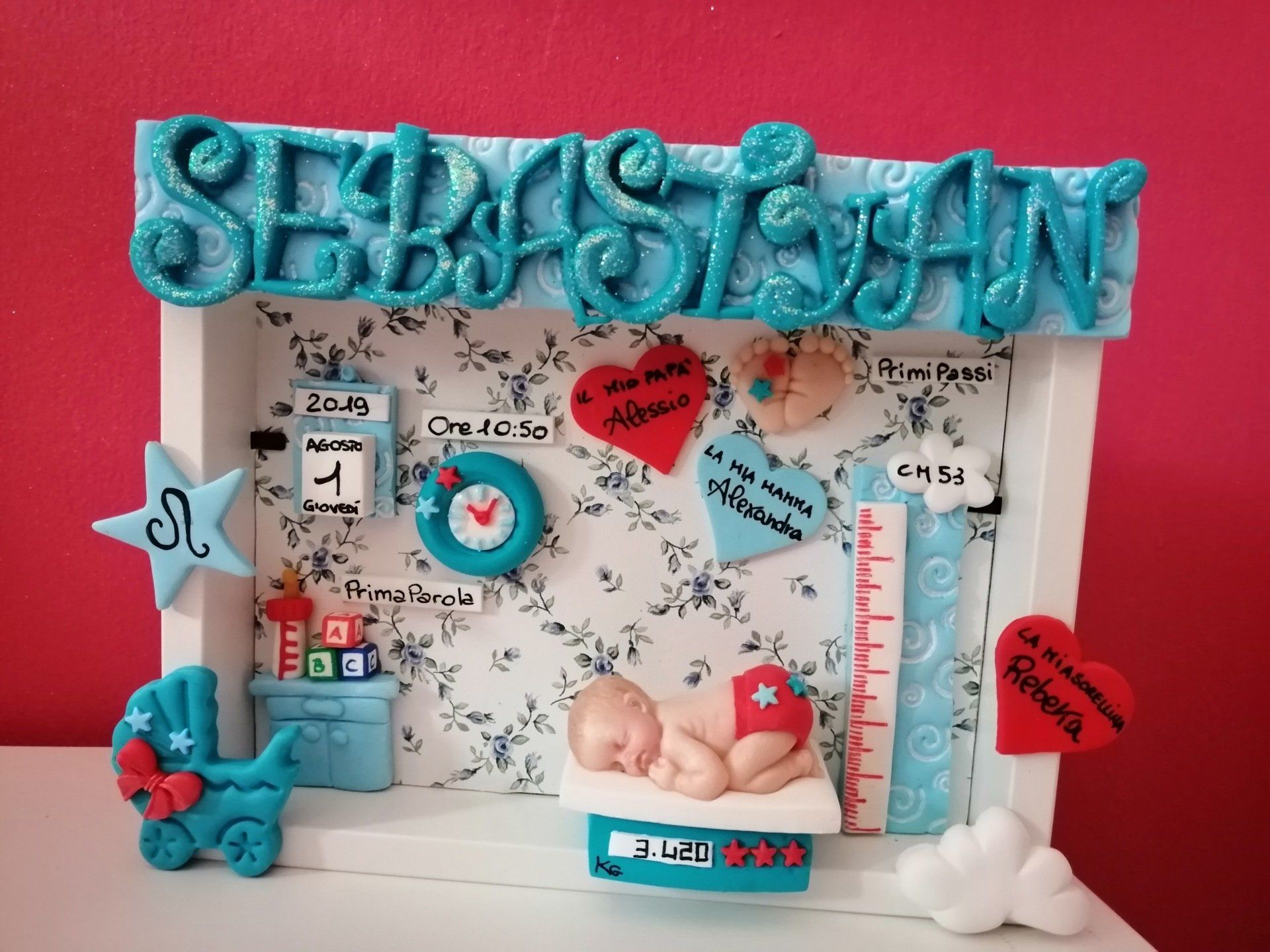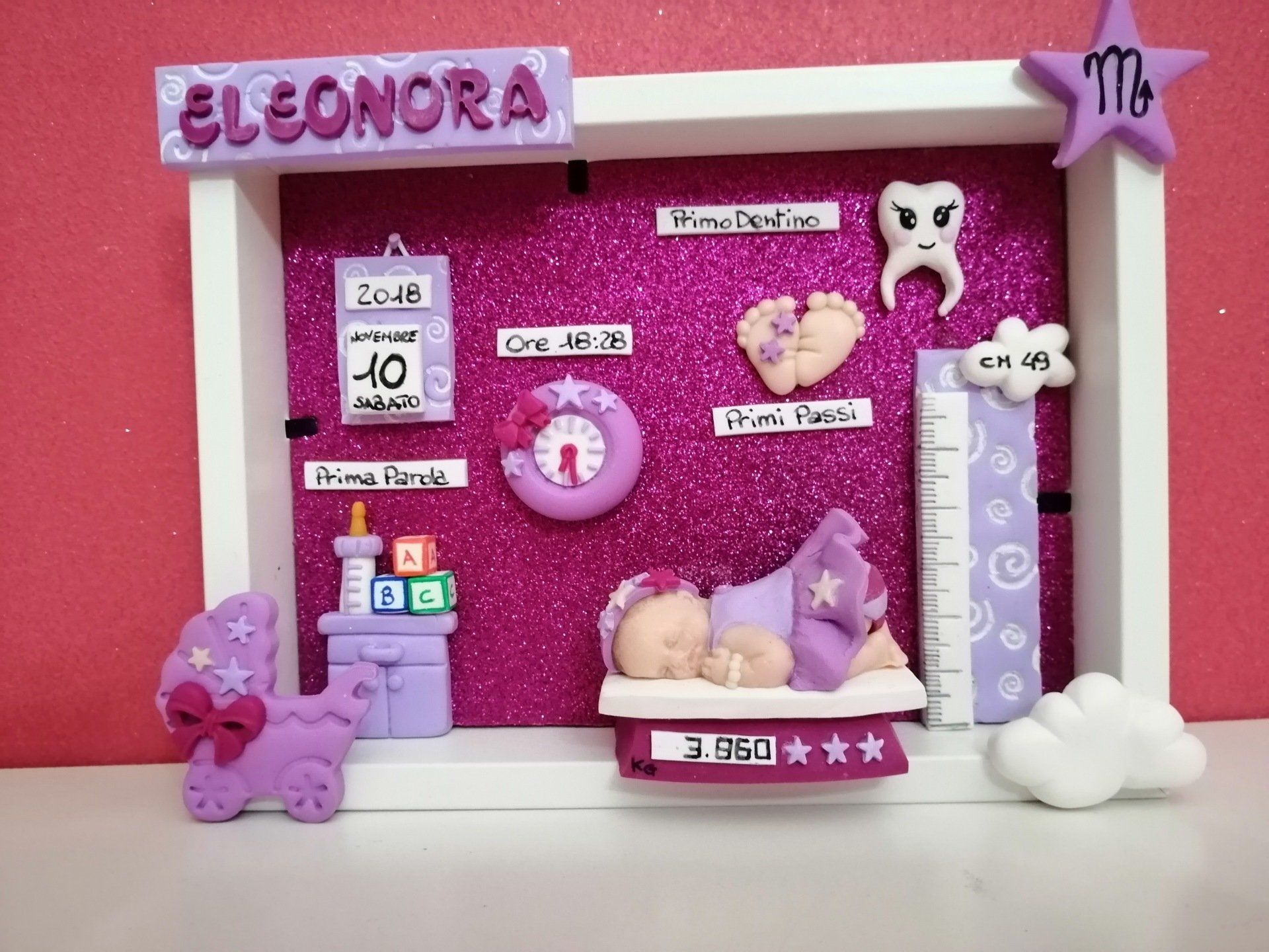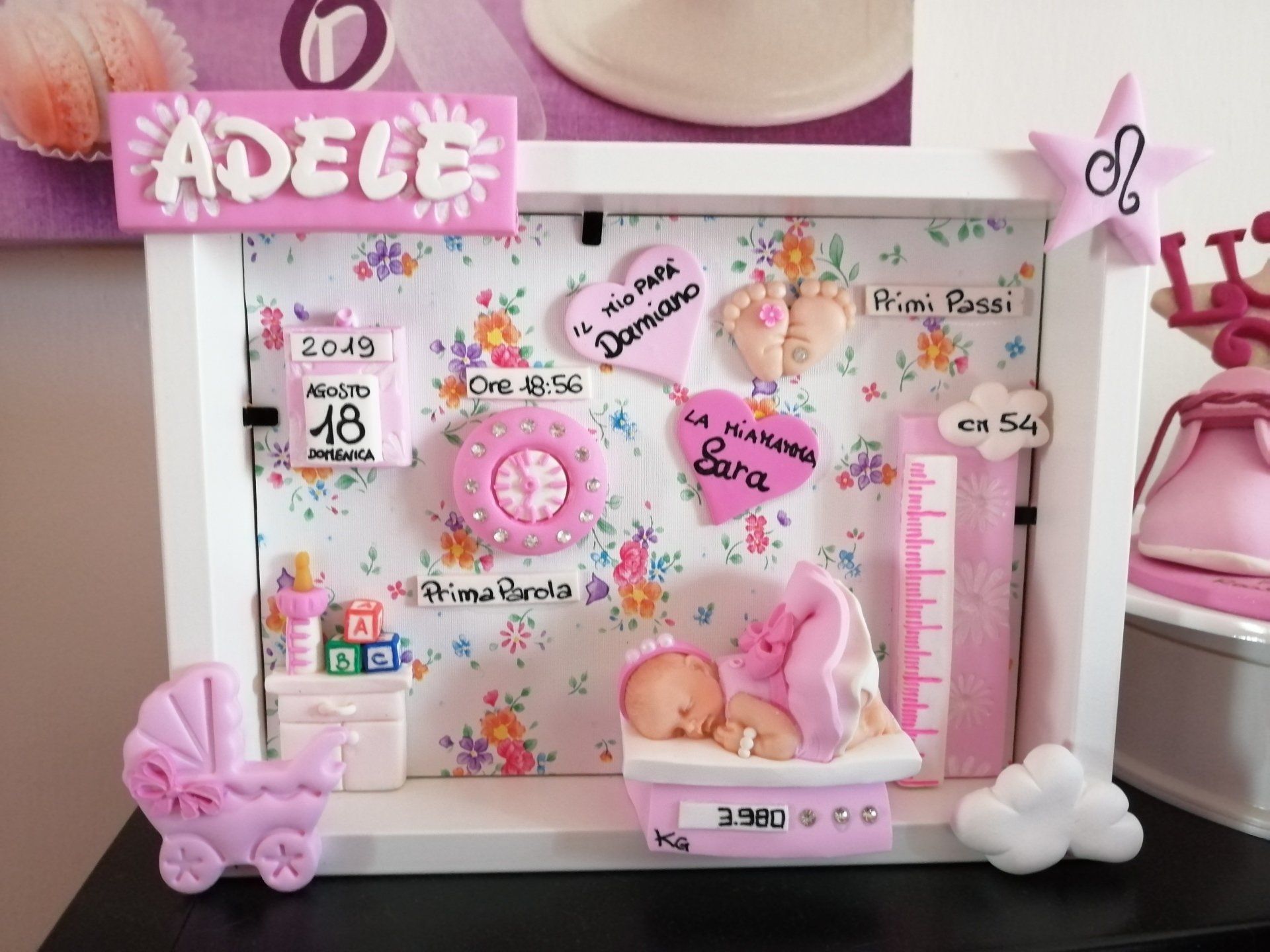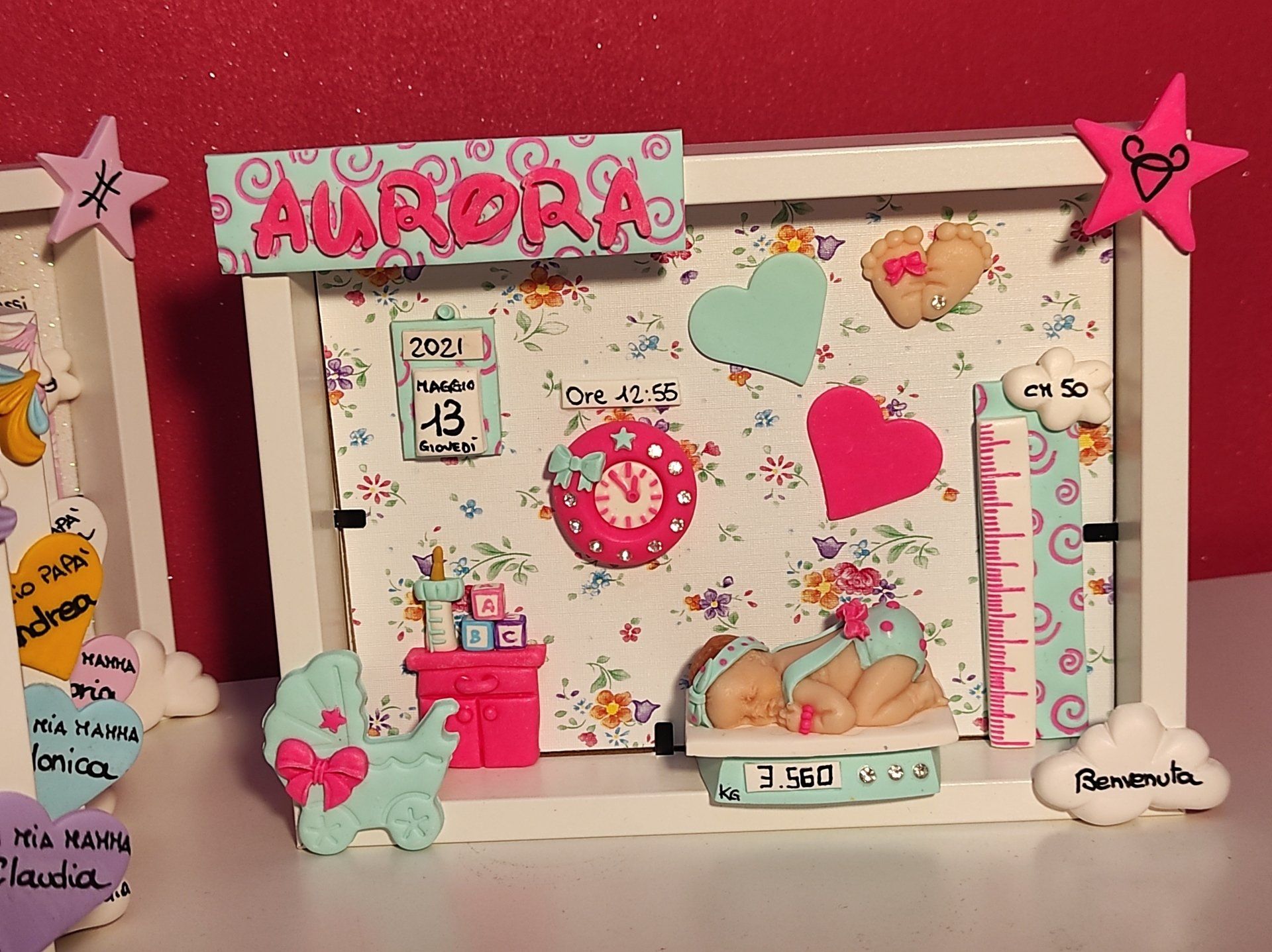 Quadretti nascita con nome,data, peso, altezza, segno zodiacale, primi passi, prima parola ... il formato big é un po' più grande del classico sia nel formato che nel nome e ha al suo interno i cuori per aggiungere il nome di mamma e papà oppure nonni, zii, padrino e madrina, o in alternativa potrete optare per il modello con primo dentino, in entrambe i casi un bel regalo adatto a tutti.
