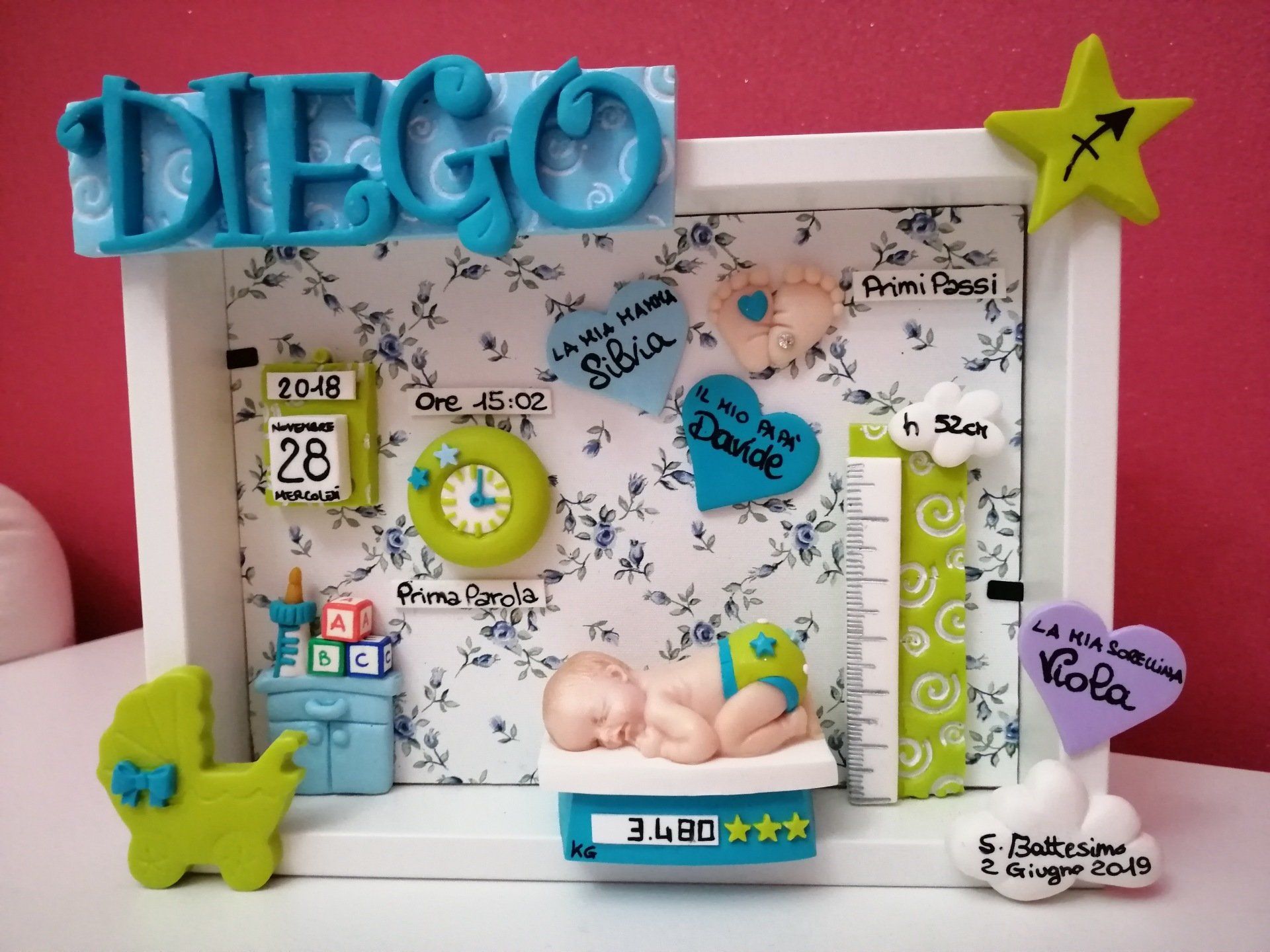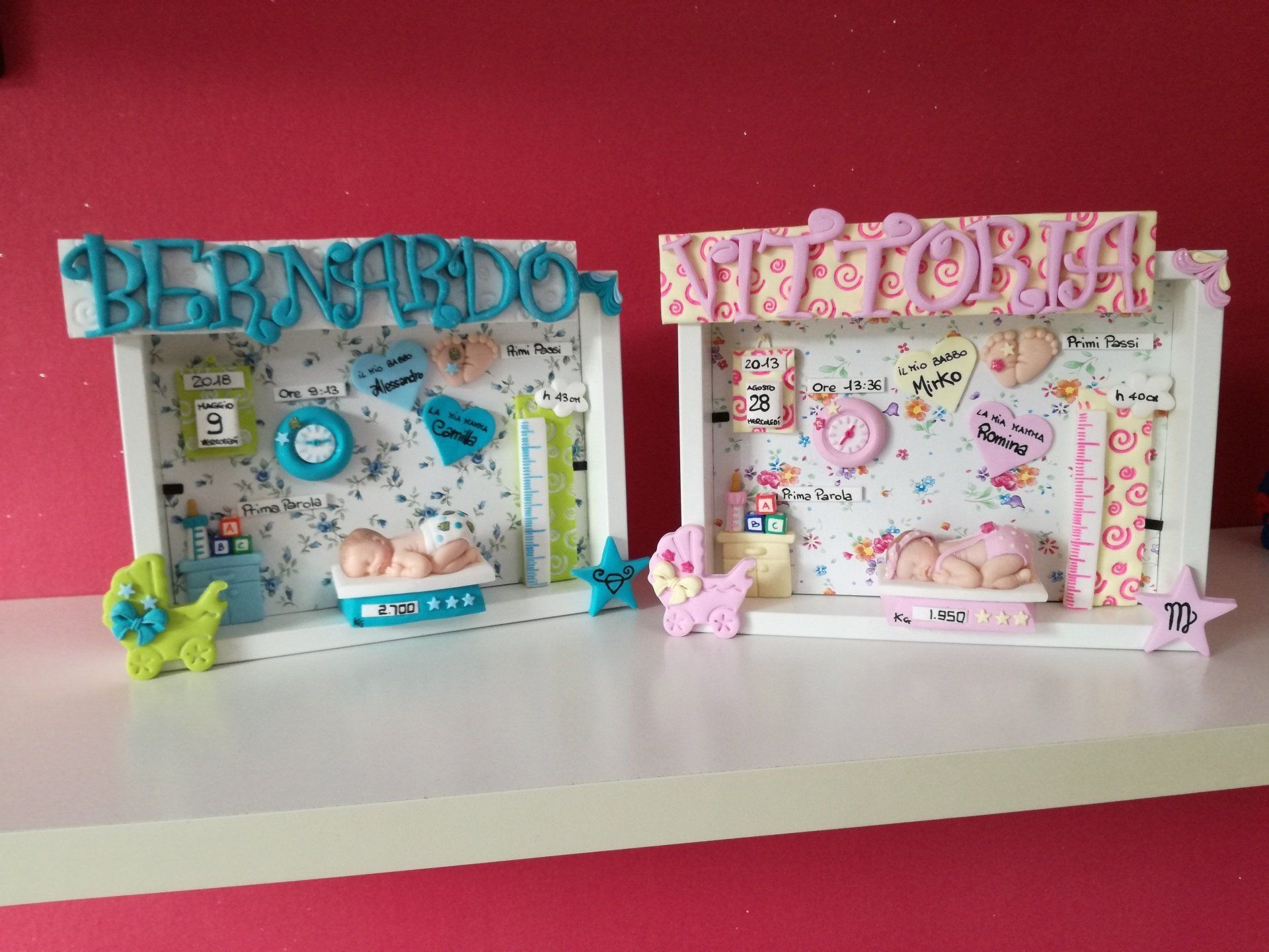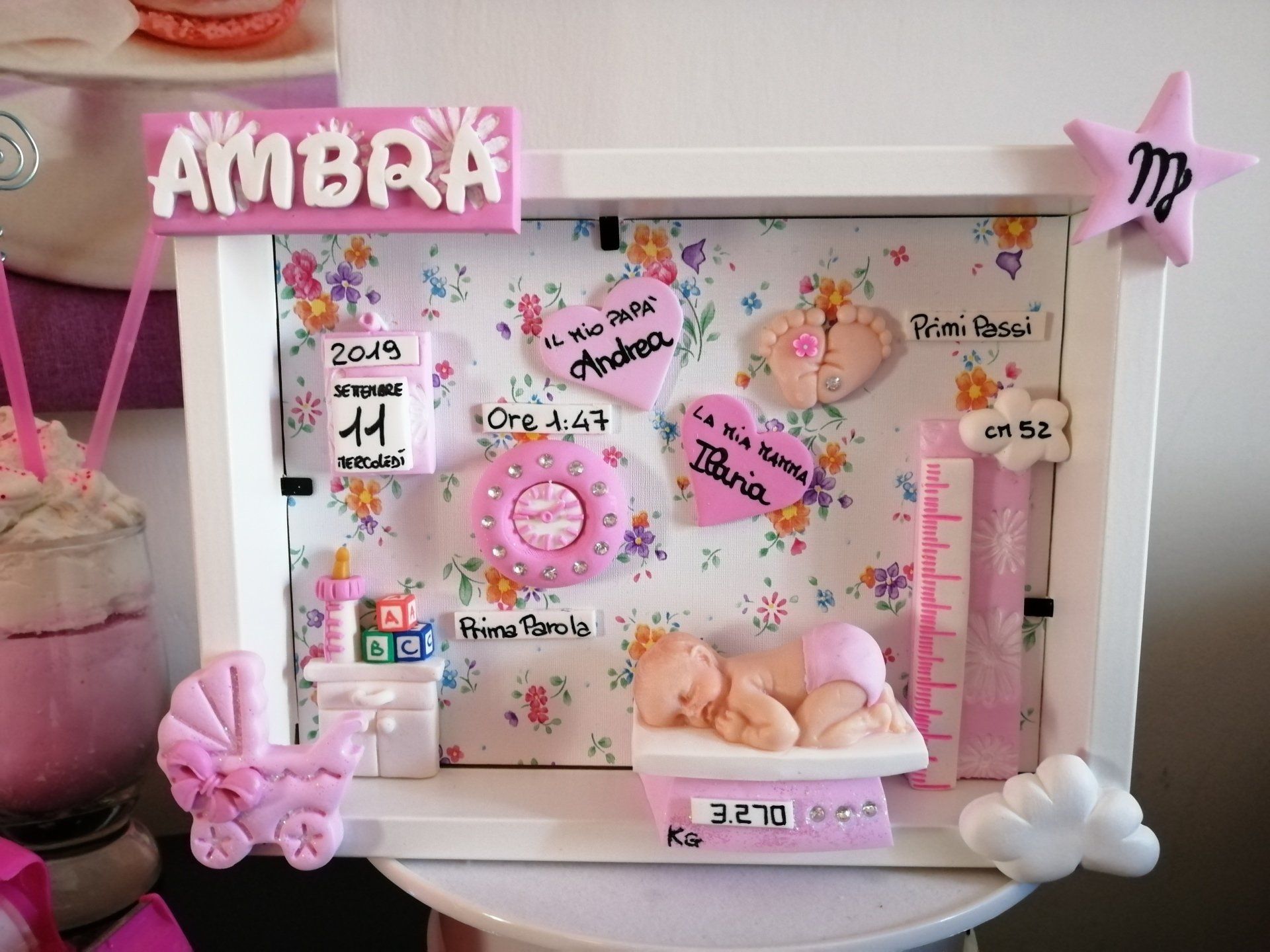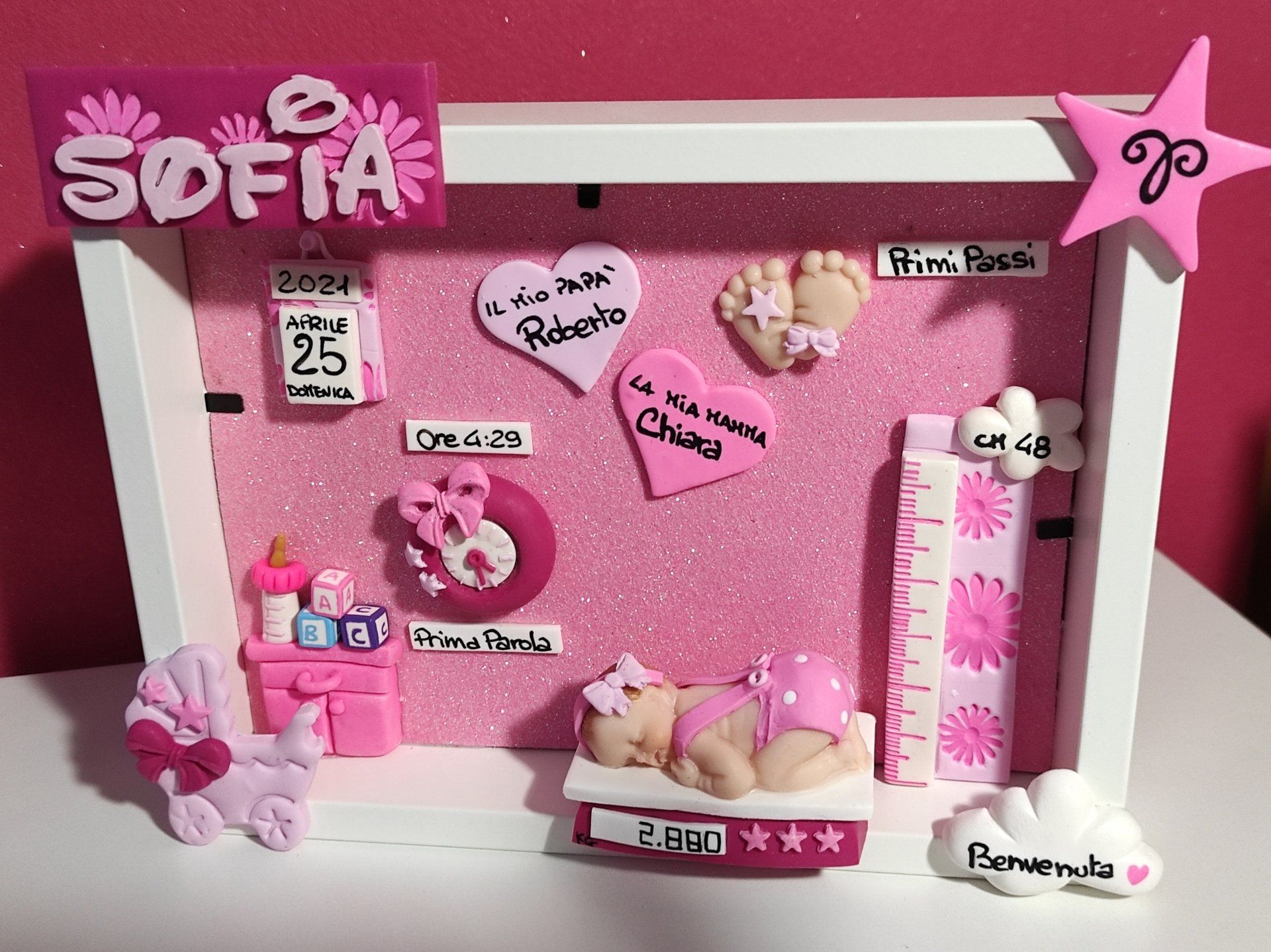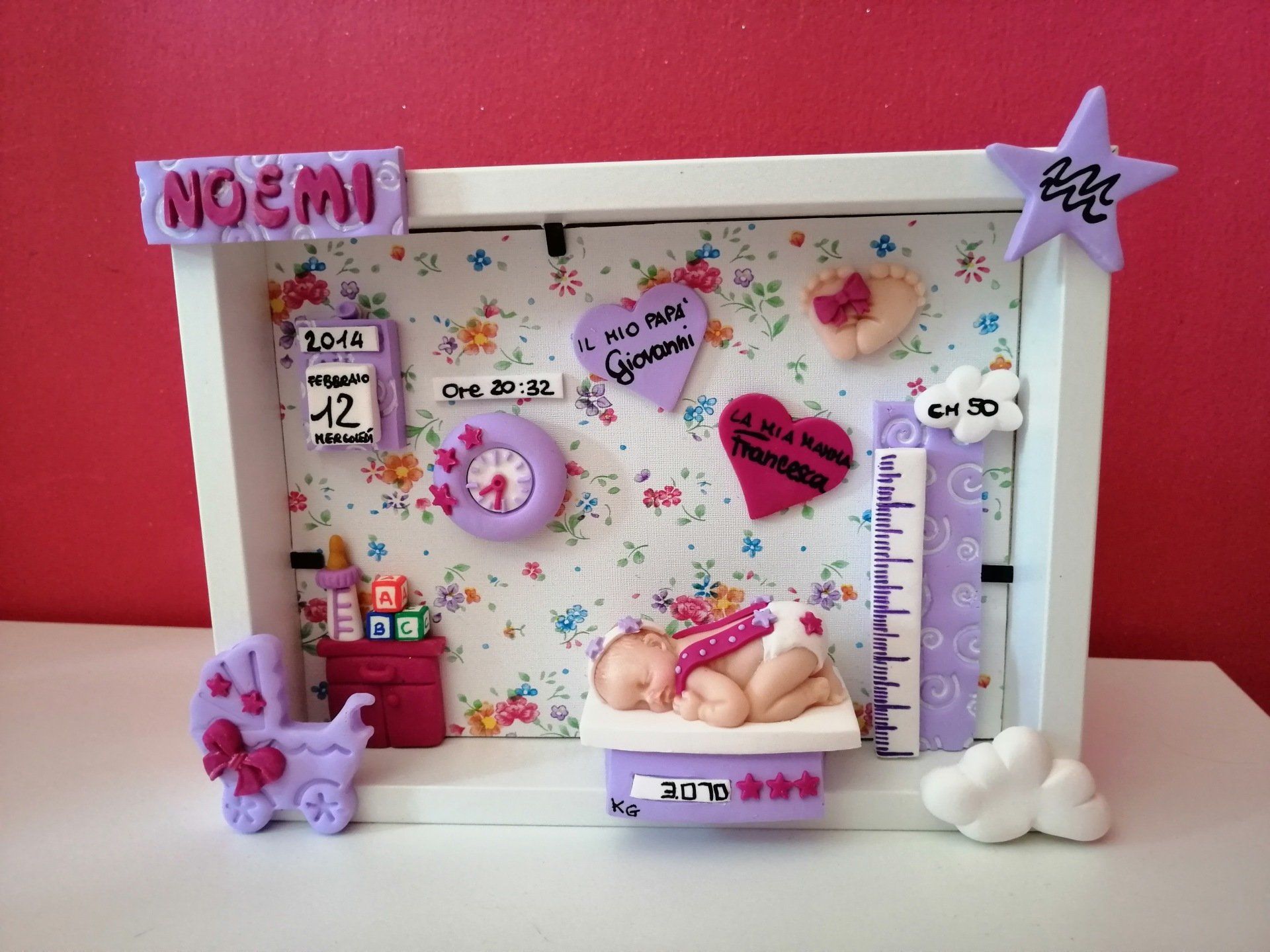 Quadretti nascita con nome,data, peso, altezza, segno zodiacale, primi passi, prima parola ... il formato big é un po' più grande del classico sia nel formato che nel nome e ha al suo interno i cuori per aggiungere il nome di mamma e papà oppure nonni, zii, padrino e madrina, o in alternativa potrete optare per il modello con primo dentino, in entrambe i casi un bel regalo adatto a tutti.