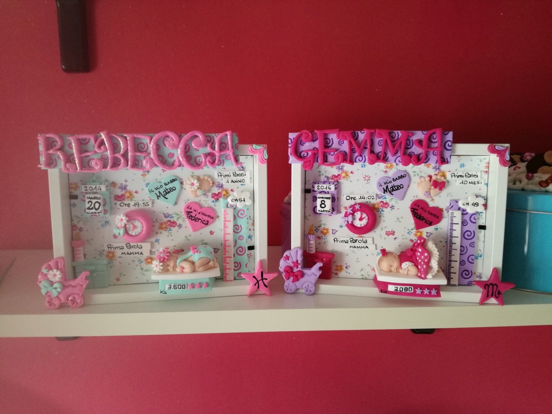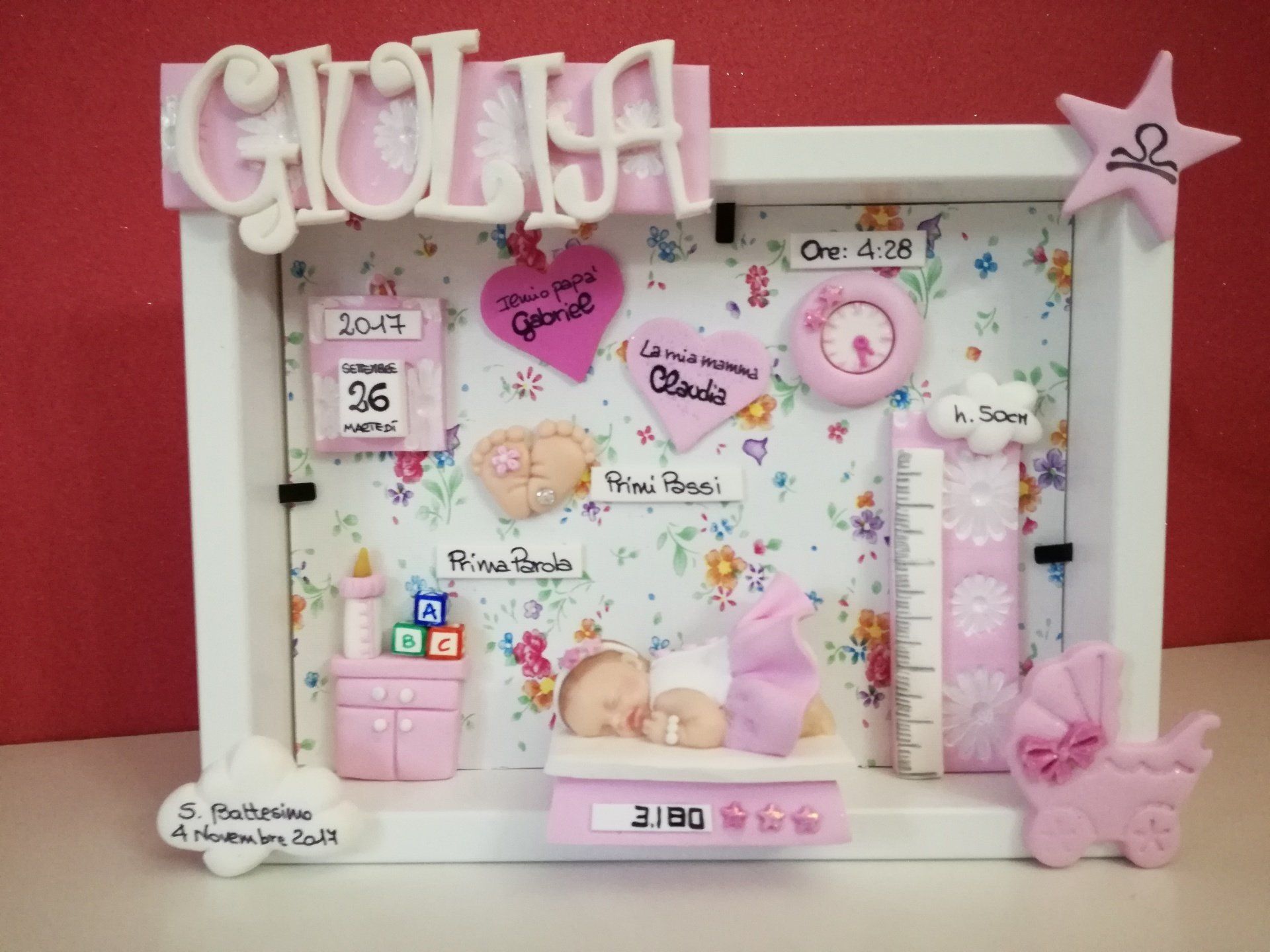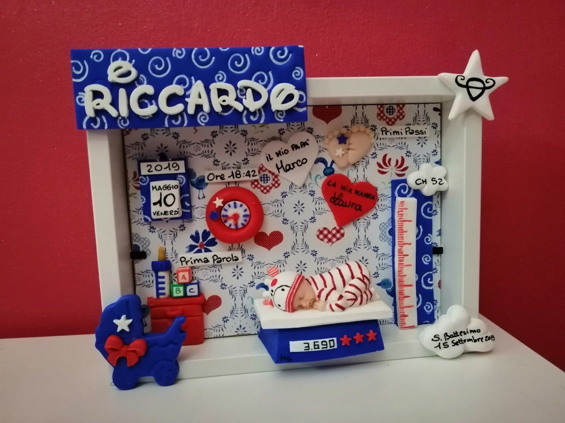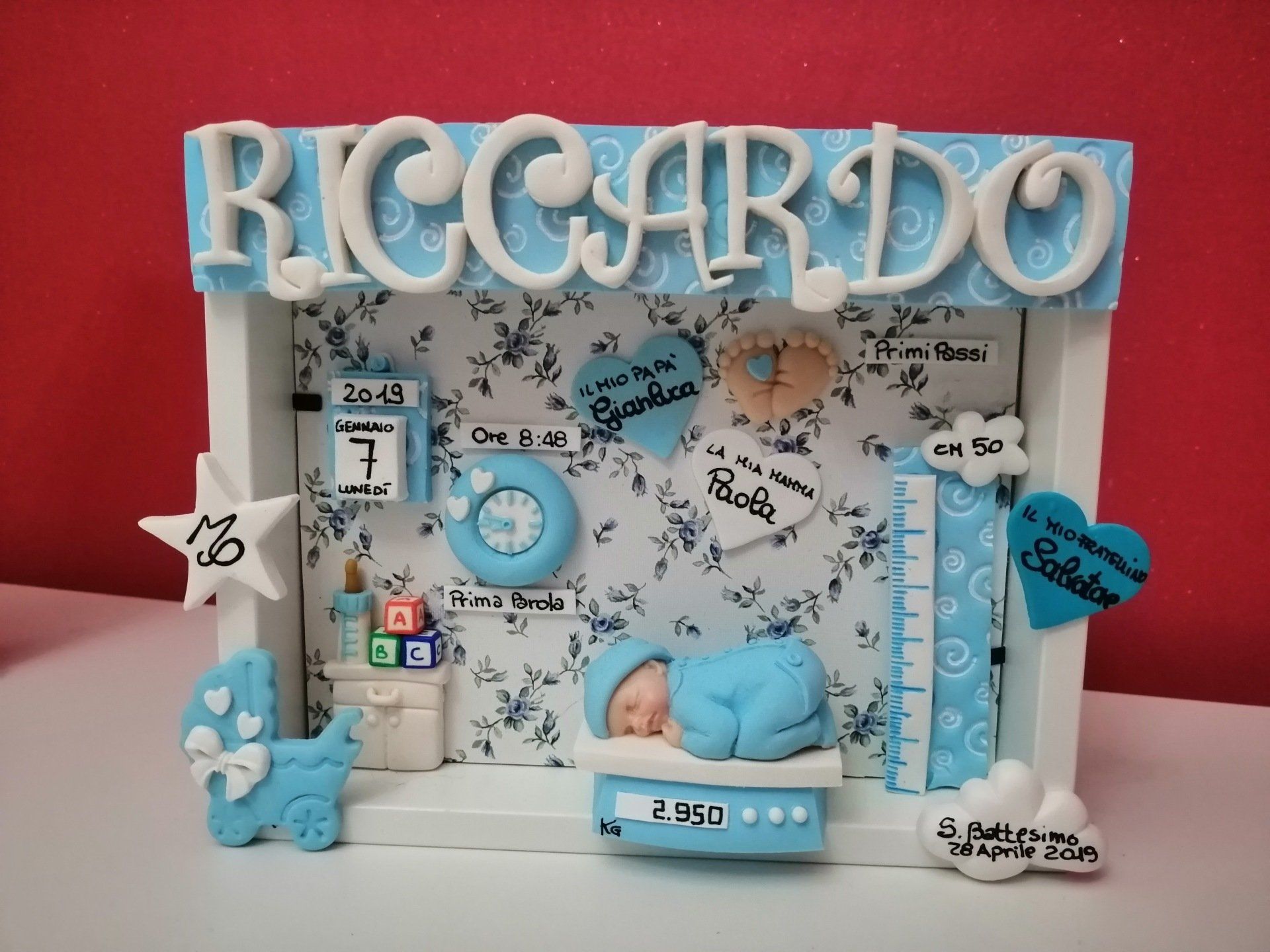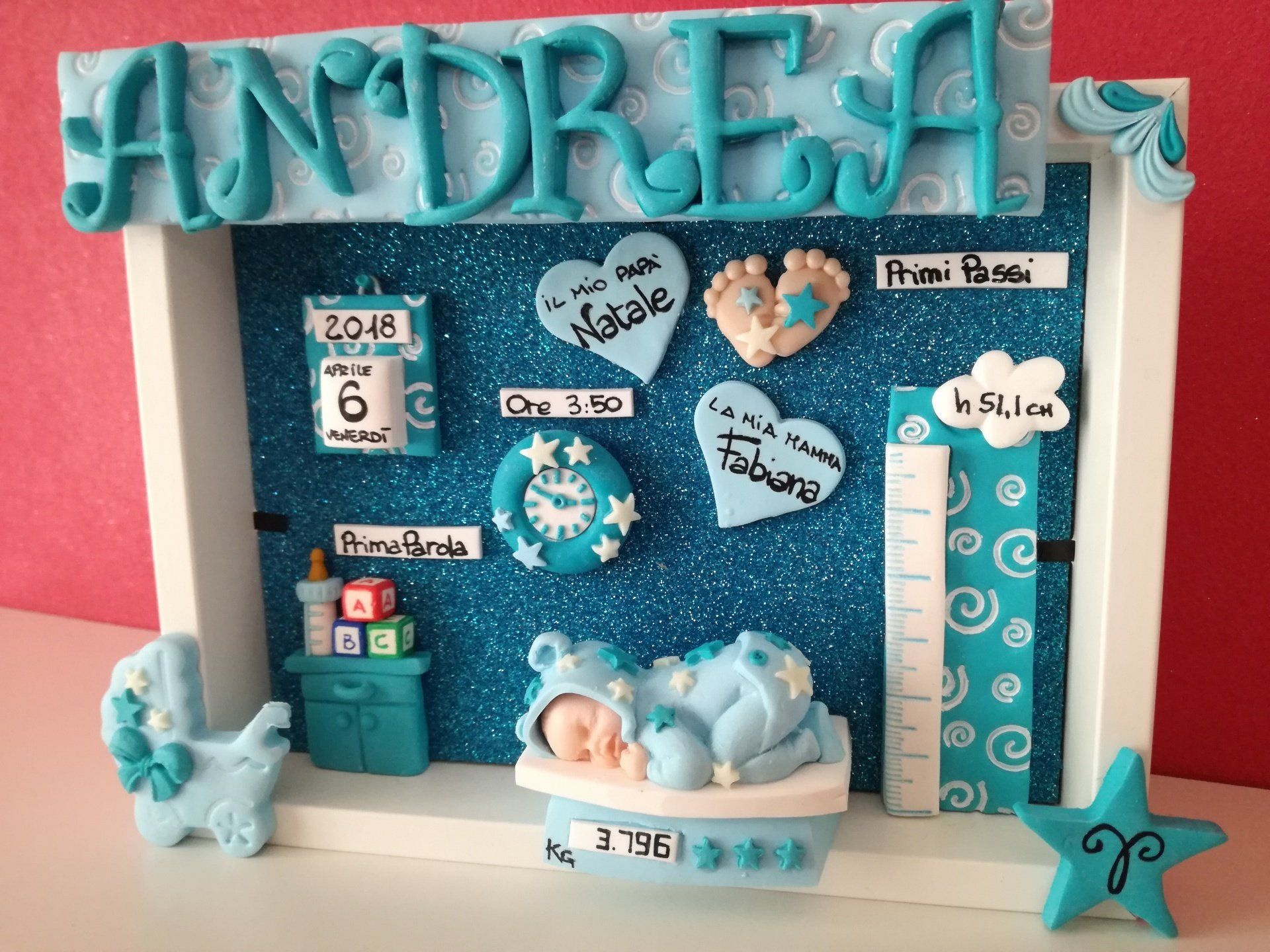 Quadretti nascita con nome,data, peso, altezza, segno zodiacale, primi passi, prima parola ... il formato big é un po' più grande del classico sia nel formato che nel nome e ha al suo interno i cuori per aggiungere il nome di mamma e papà oppure nonni, zii, padrino e madrina, o in alternativa potrete optare per il modello con primo dentino, in entrambe i casi un bel regalo adatto a tutti.