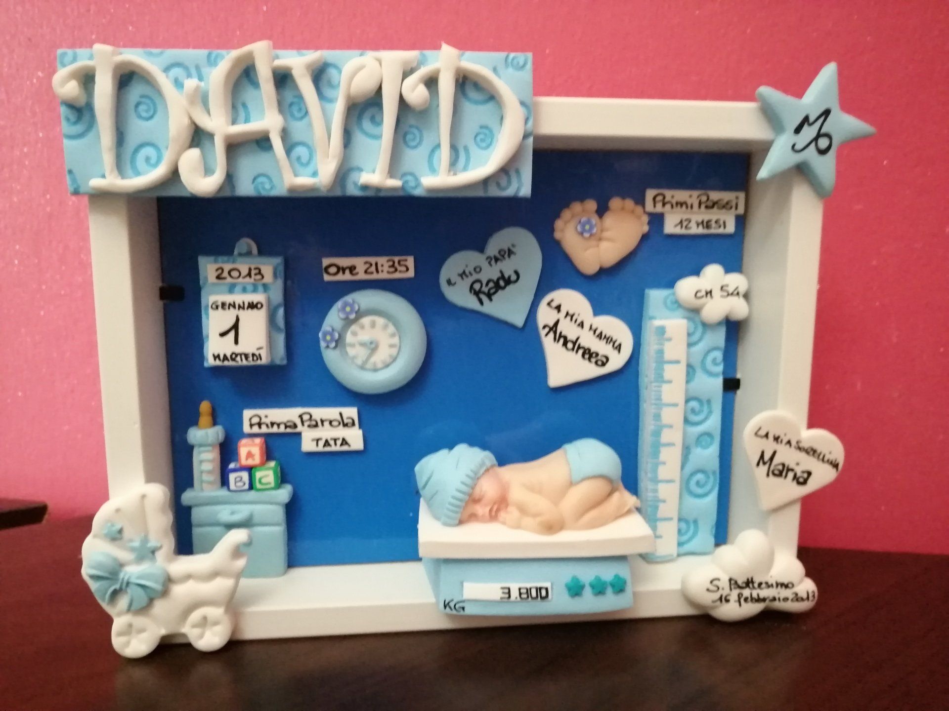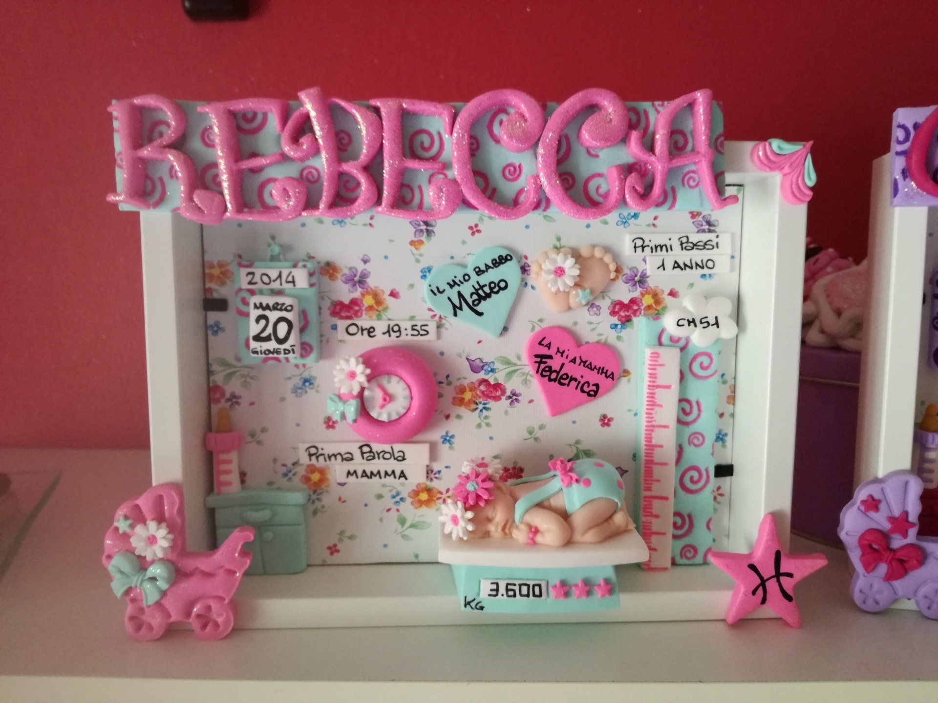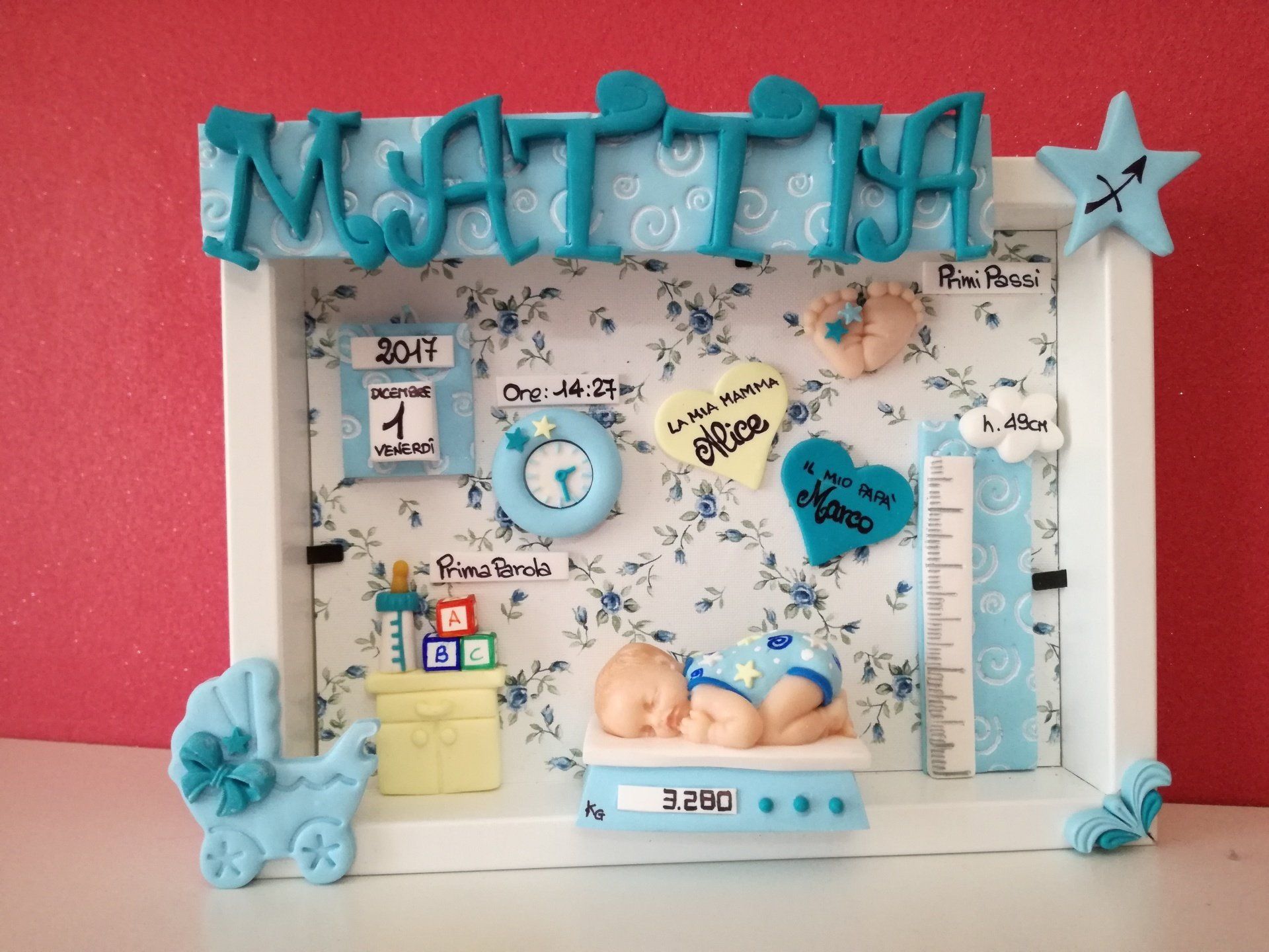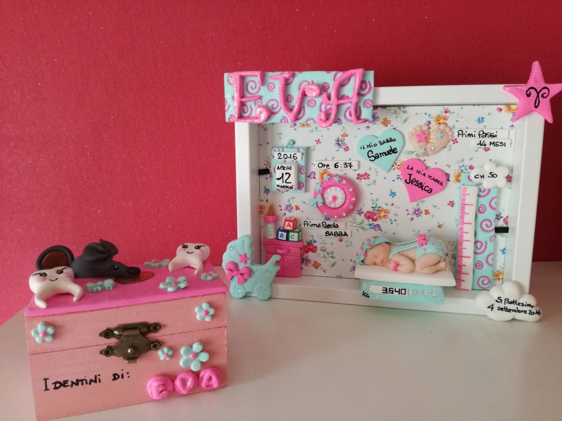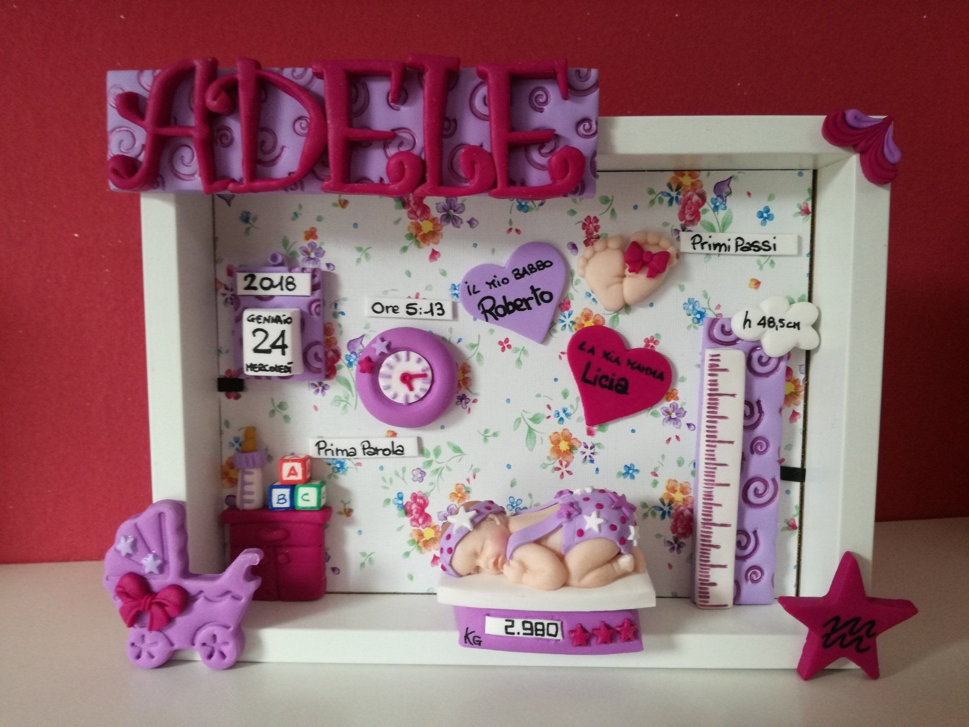 Quadretti nascita con nome,data, peso, altezza, segno zodiacale, primi passi, prima parola ... il formato big é un po' più grande del classico sia nel formato che nel nome e ha al suo interno i cuori per aggiungere il nome di mamma e papà oppure nonni, zii, padrino e madrina, o in alternativa potrete optare per il modello con primo dentino, in entrambe i casi un bel regalo adatto a tutti.
