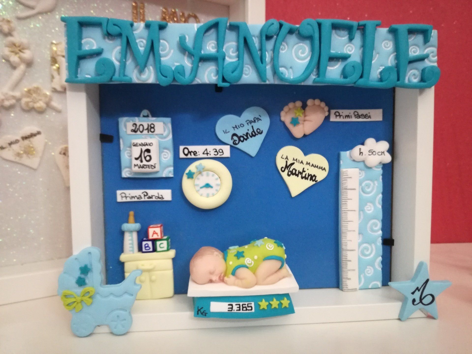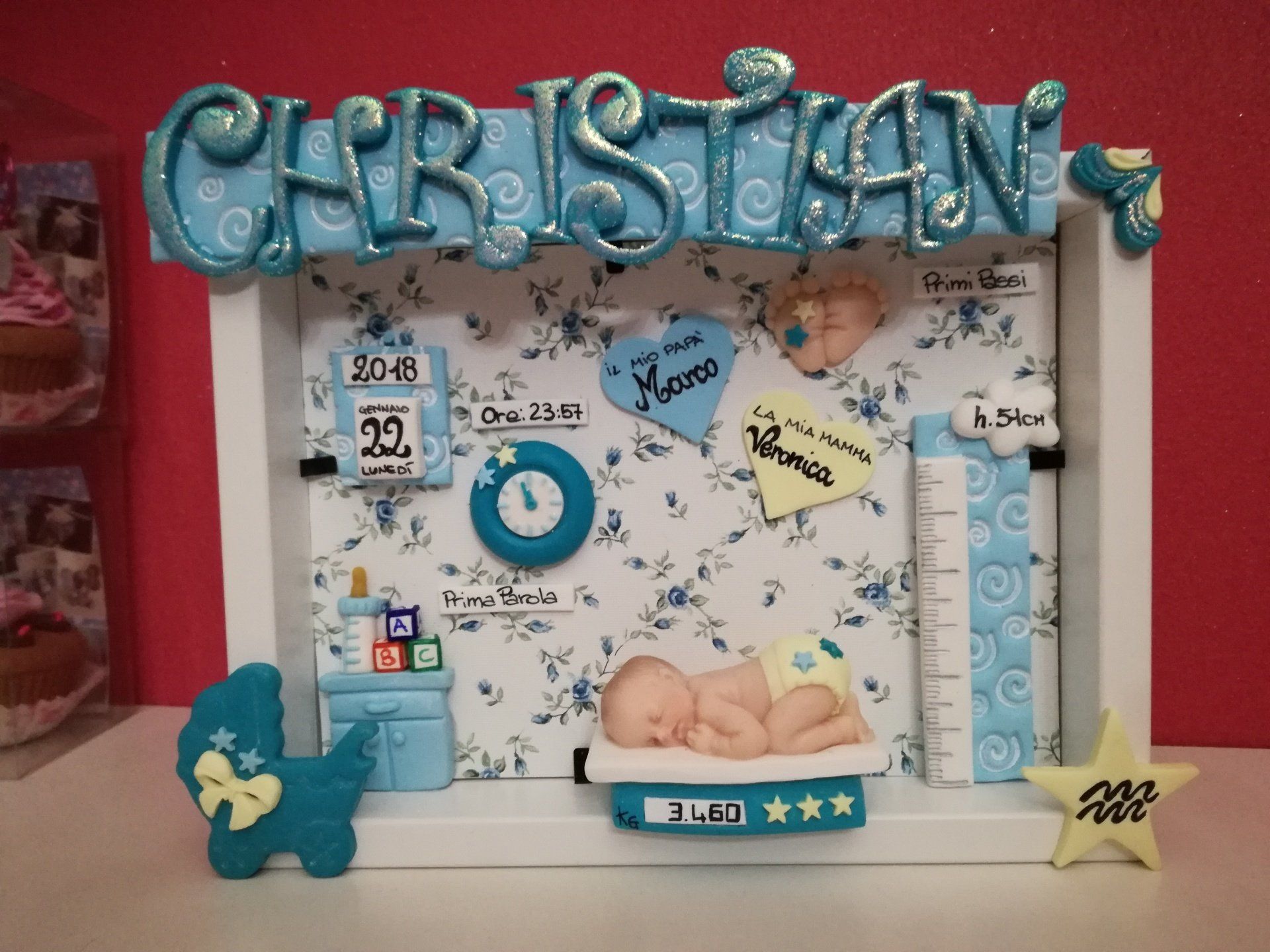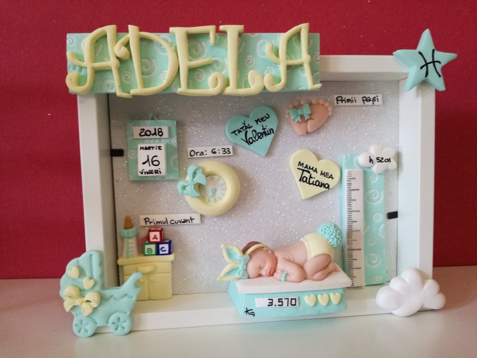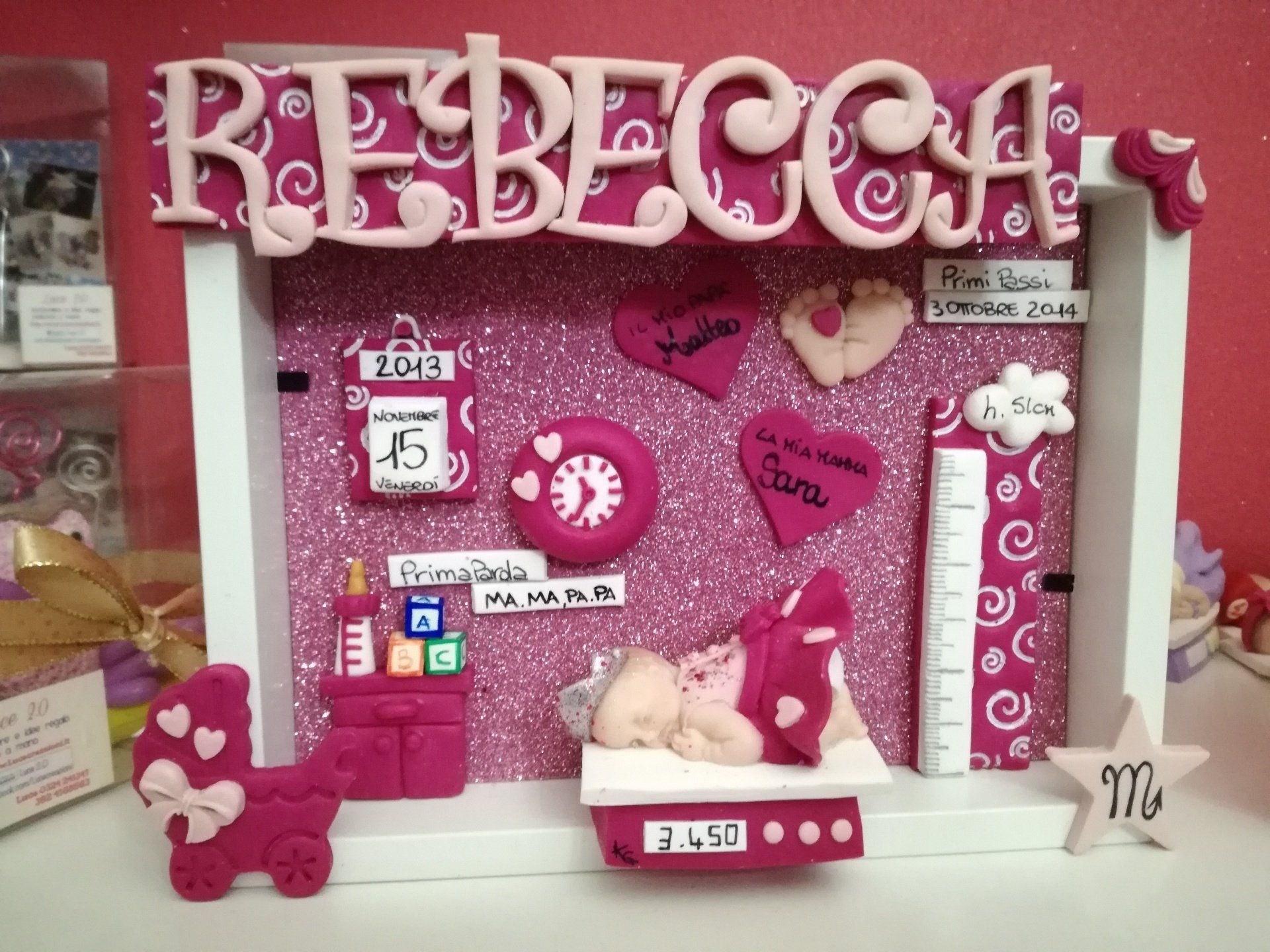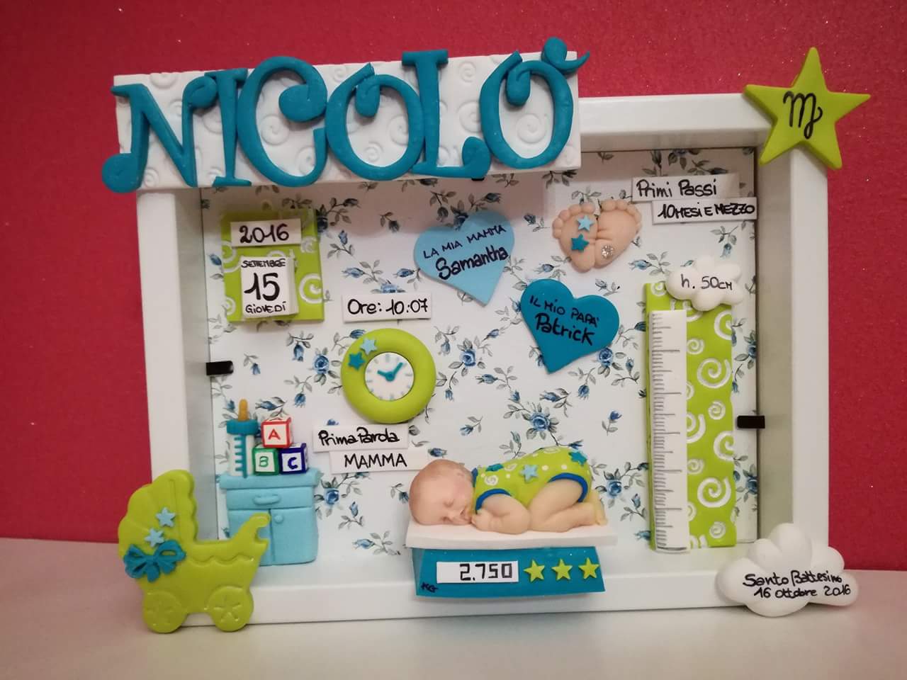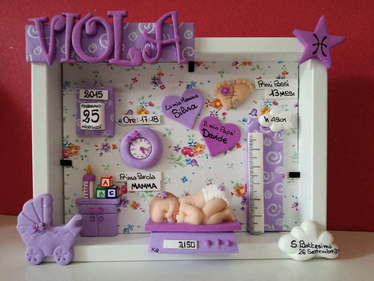 Quadretti nascita con nome,data, peso, altezza, segno zodiacale, primi passi, prima parola ... il formato big é un po' più grande del classico sia nel formato che nel nome e ha al suo interno i cuori per aggiungere il nome di mamma e papà oppure nonni, zii, padrino e madrina, o in alternativa potrete optare per il modello con primo dentino, in entrambe i casi un bel regalo adatto a tutti.