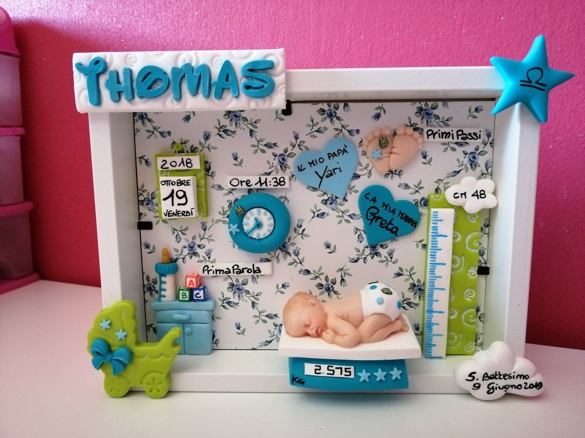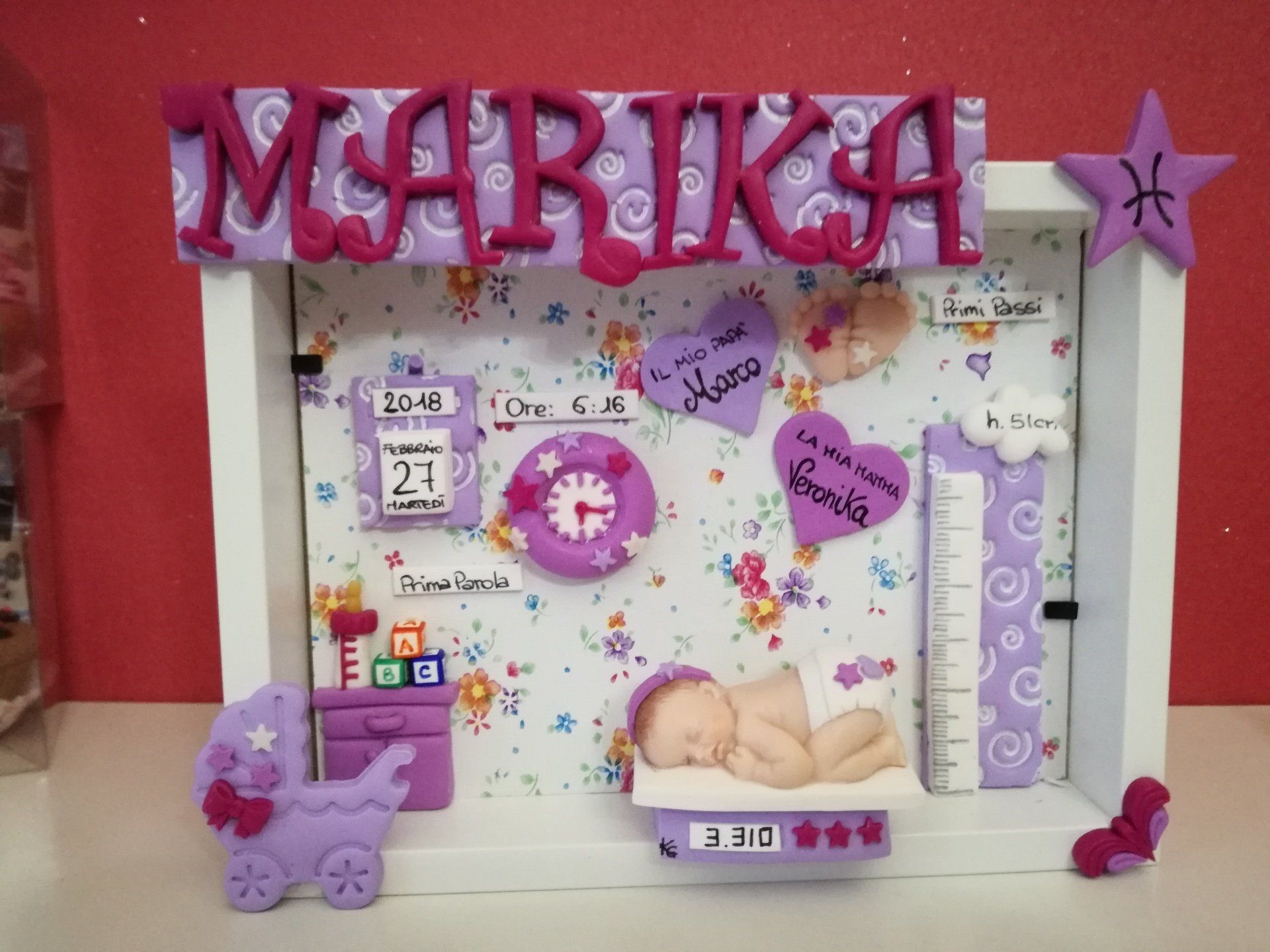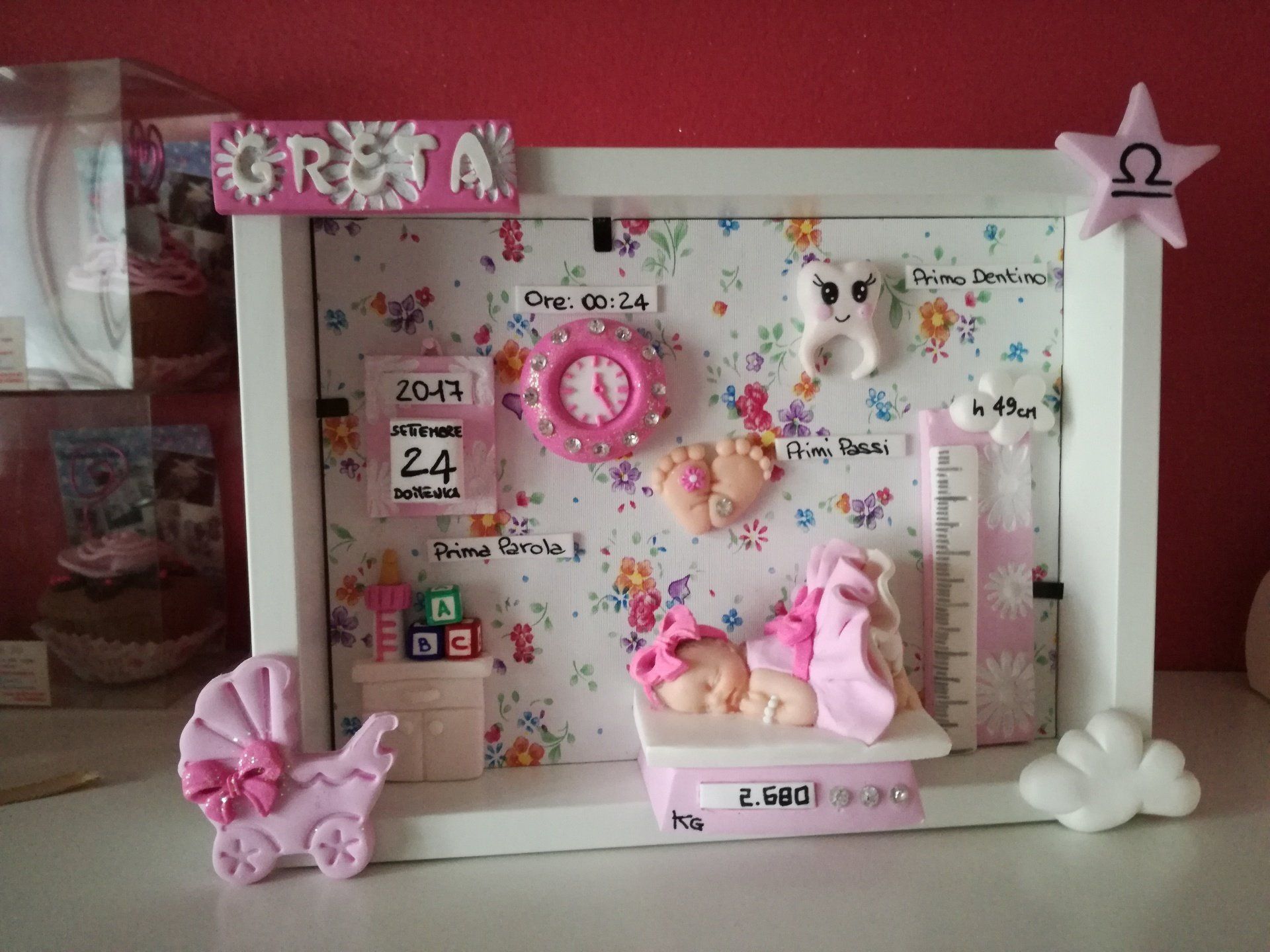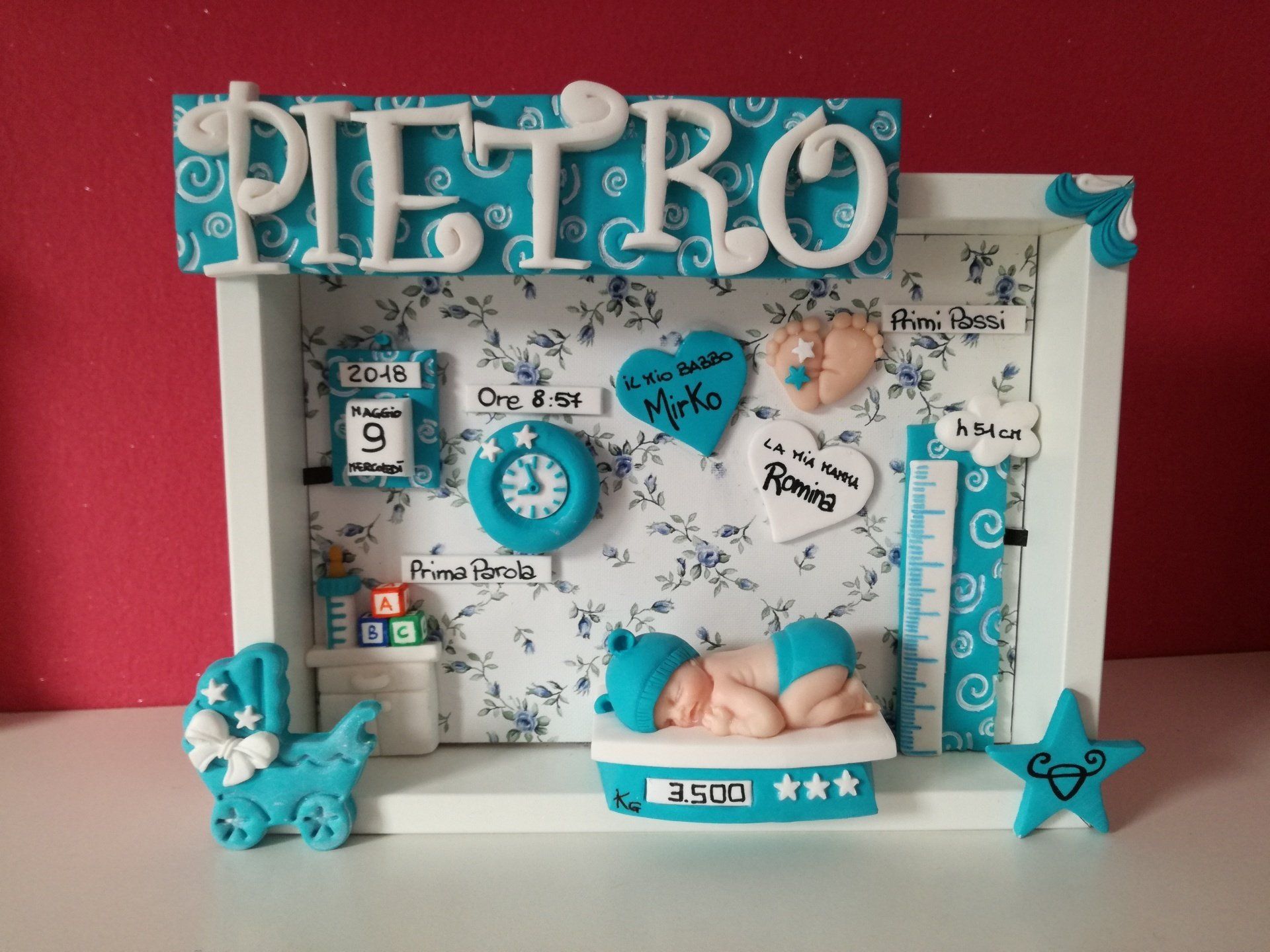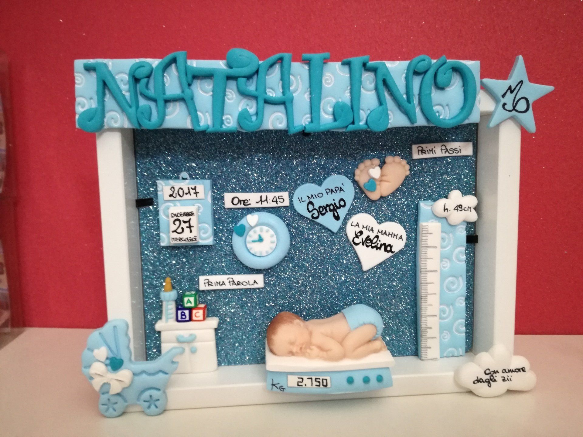Quadretti nascita con nome,data, peso, altezza, segno zodiacale, primi passi, prima parola ... il formato big é un po' più grande del classico sia nel formato che nel nome e ha al suo interno i cuori per aggiungere il nome di mamma e papà oppure nonni, zii, padrino e madrina, o in alternativa potrete optare per il modello con primo dentino, in entrambe i casi un bel regalo adatto a tutti.