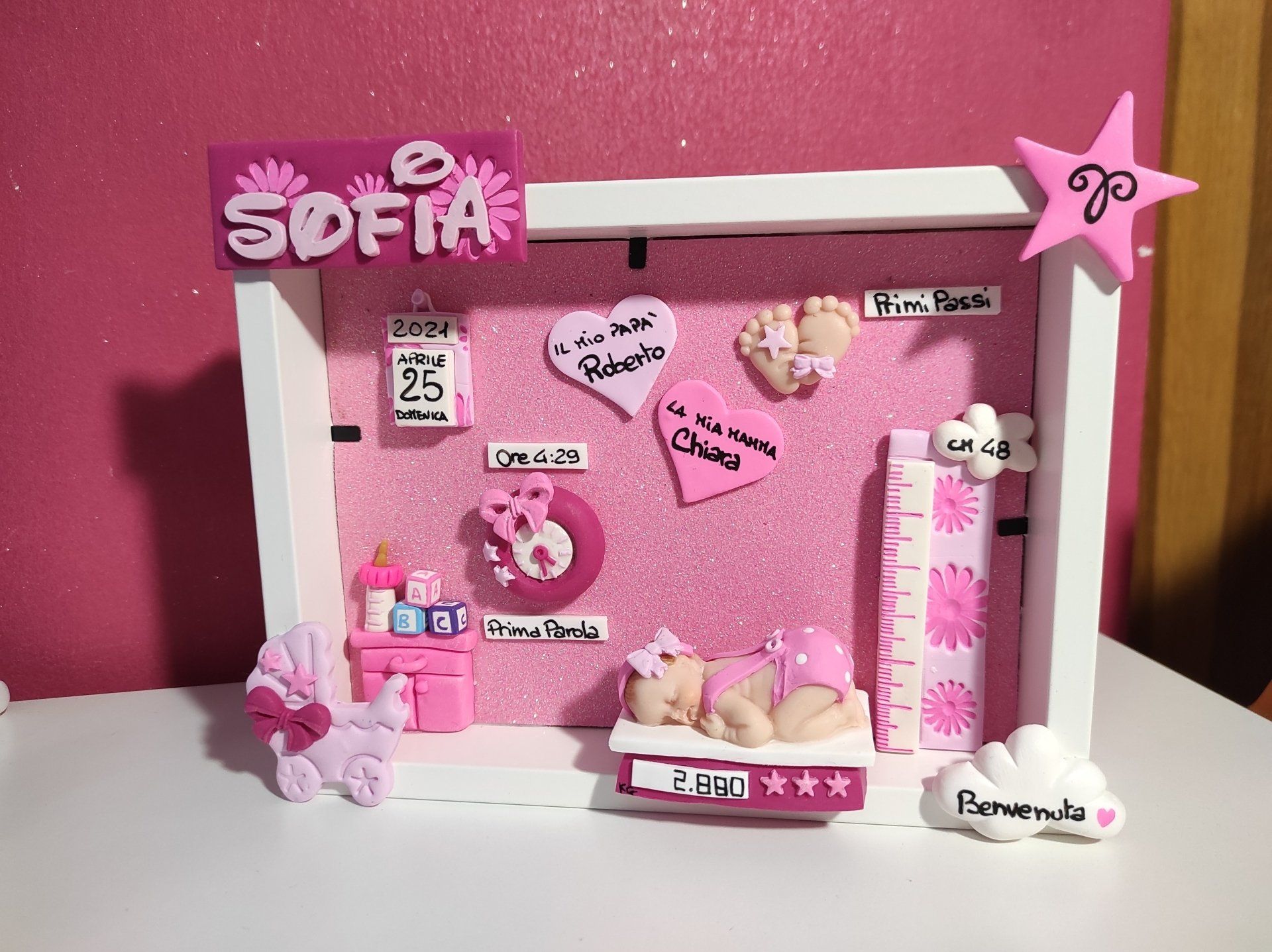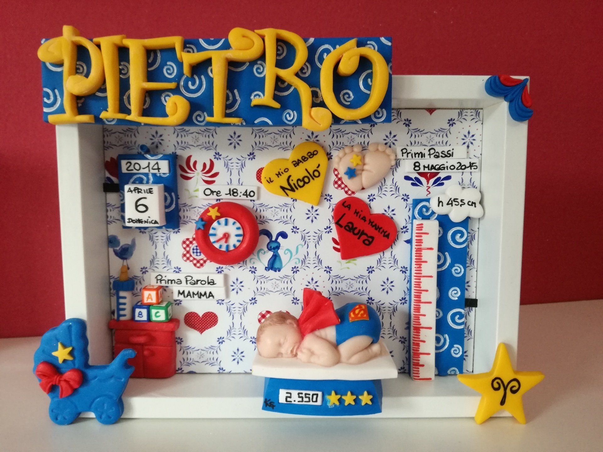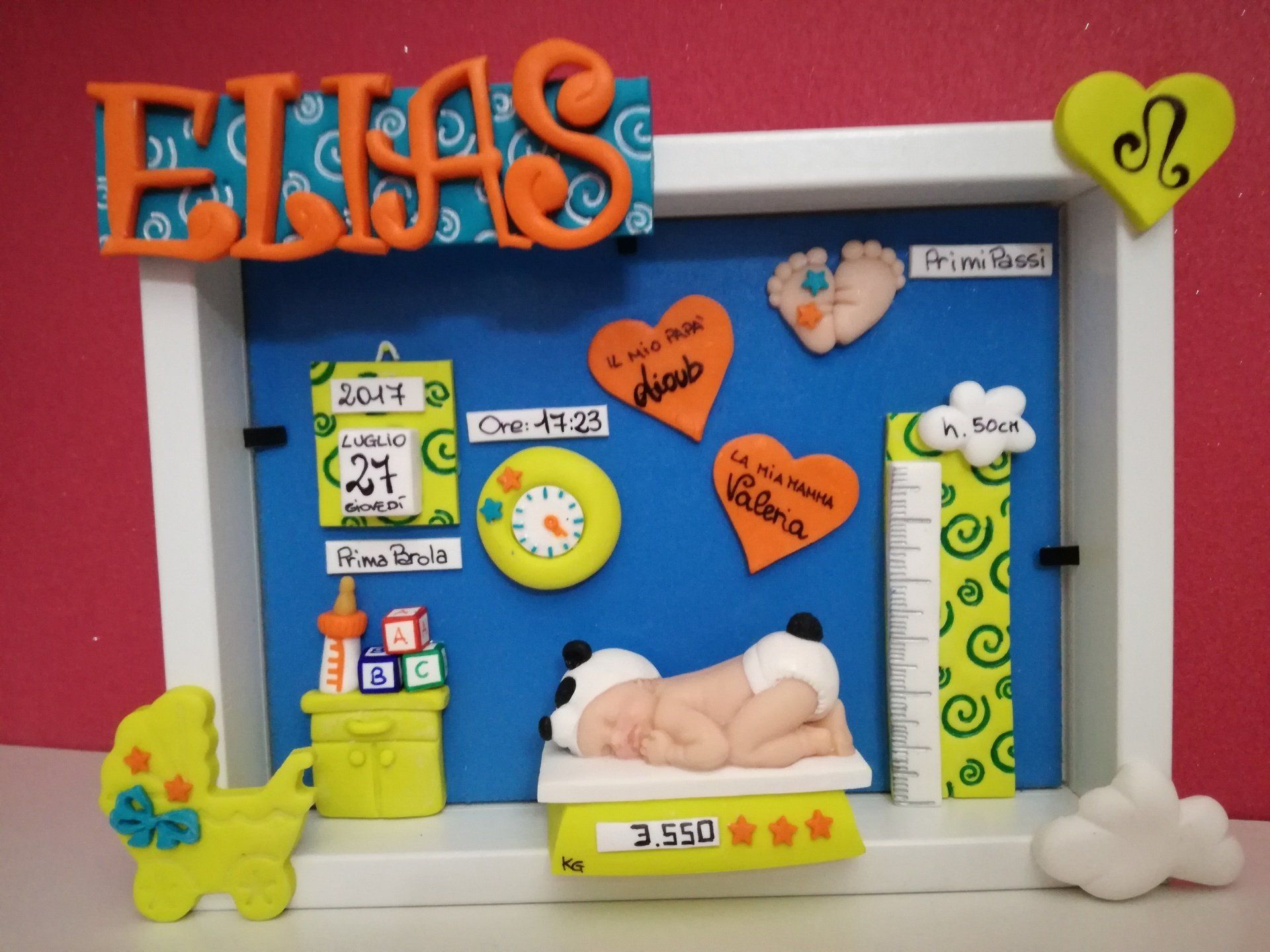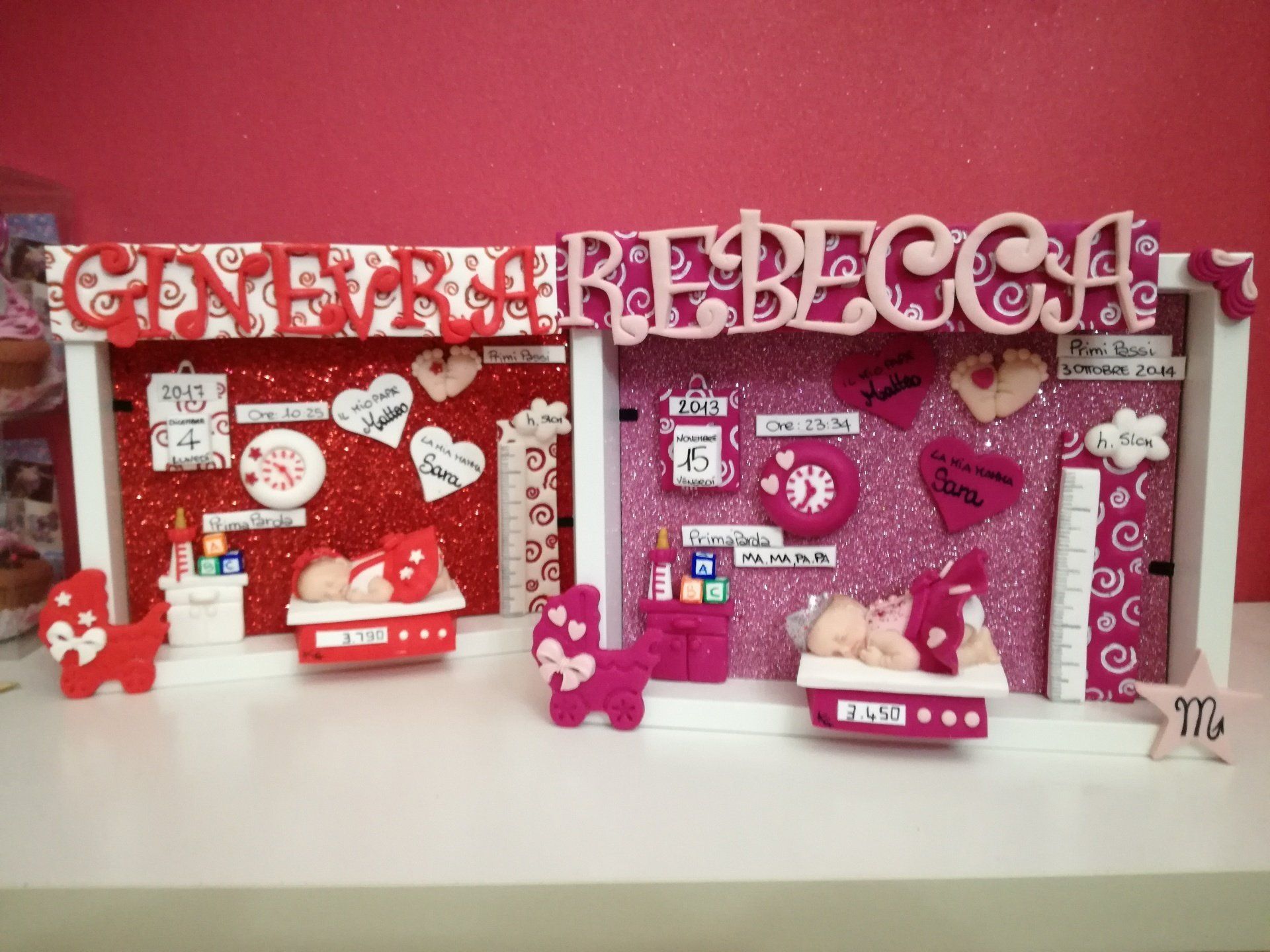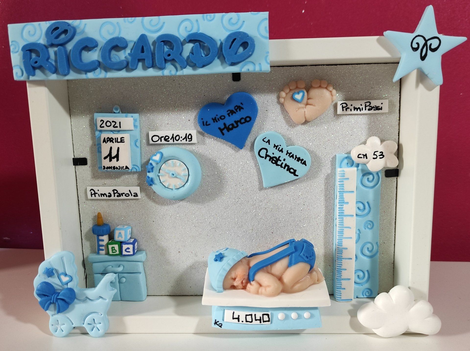 Quadretti nascita con nome,data, peso, altezza, segno zodiacale, primi passi, prima parola ... il formato big é un po' più grande del classico sia nel formato che nel nome e ha al suo interno i cuori per aggiungere il nome di mamma e papà oppure nonni, zii, padrino e madrina, o in alternativa potrete optare per il modello con primo dentino, in entrambe i casi un bel regalo adatto a tutti.