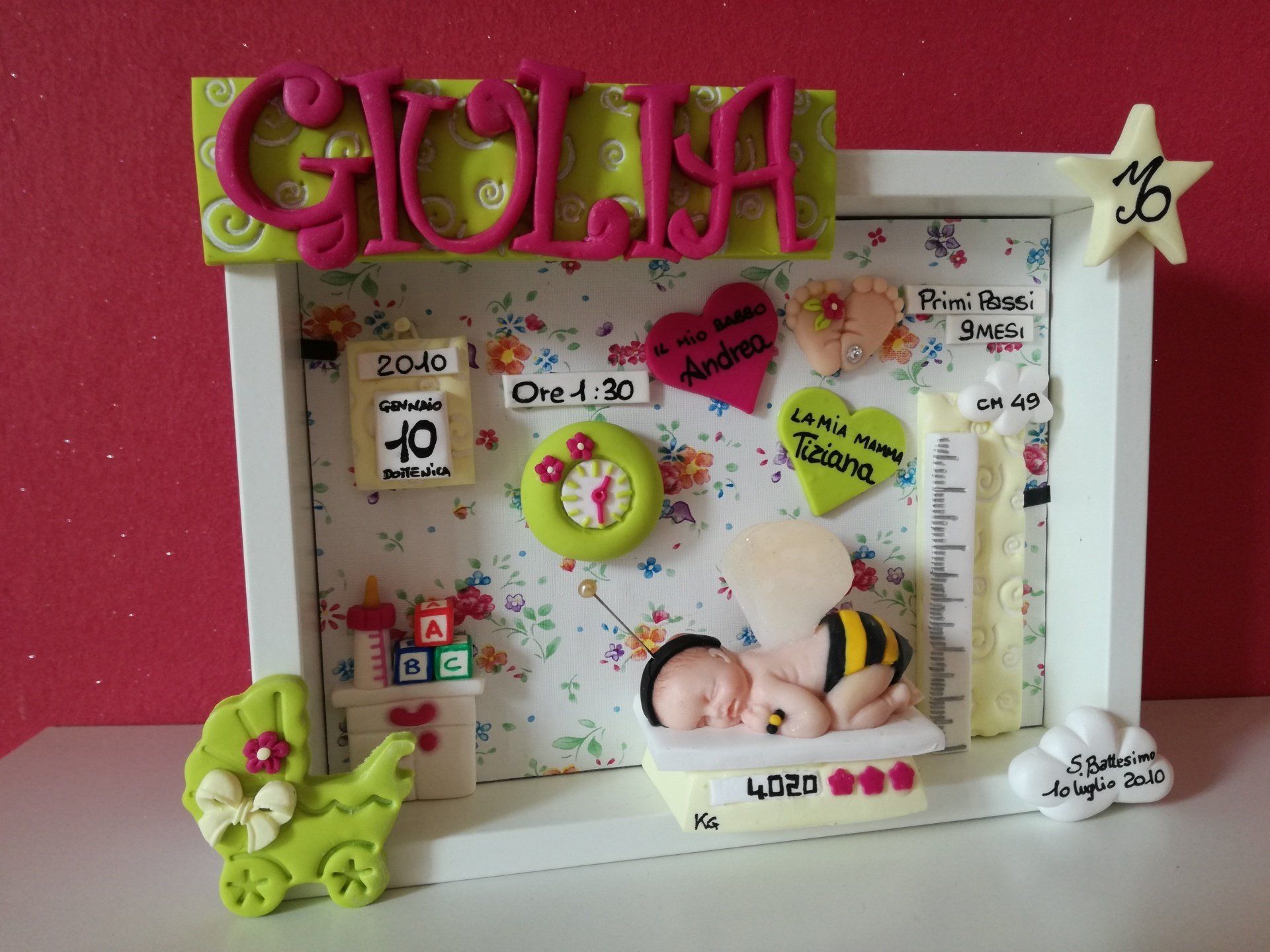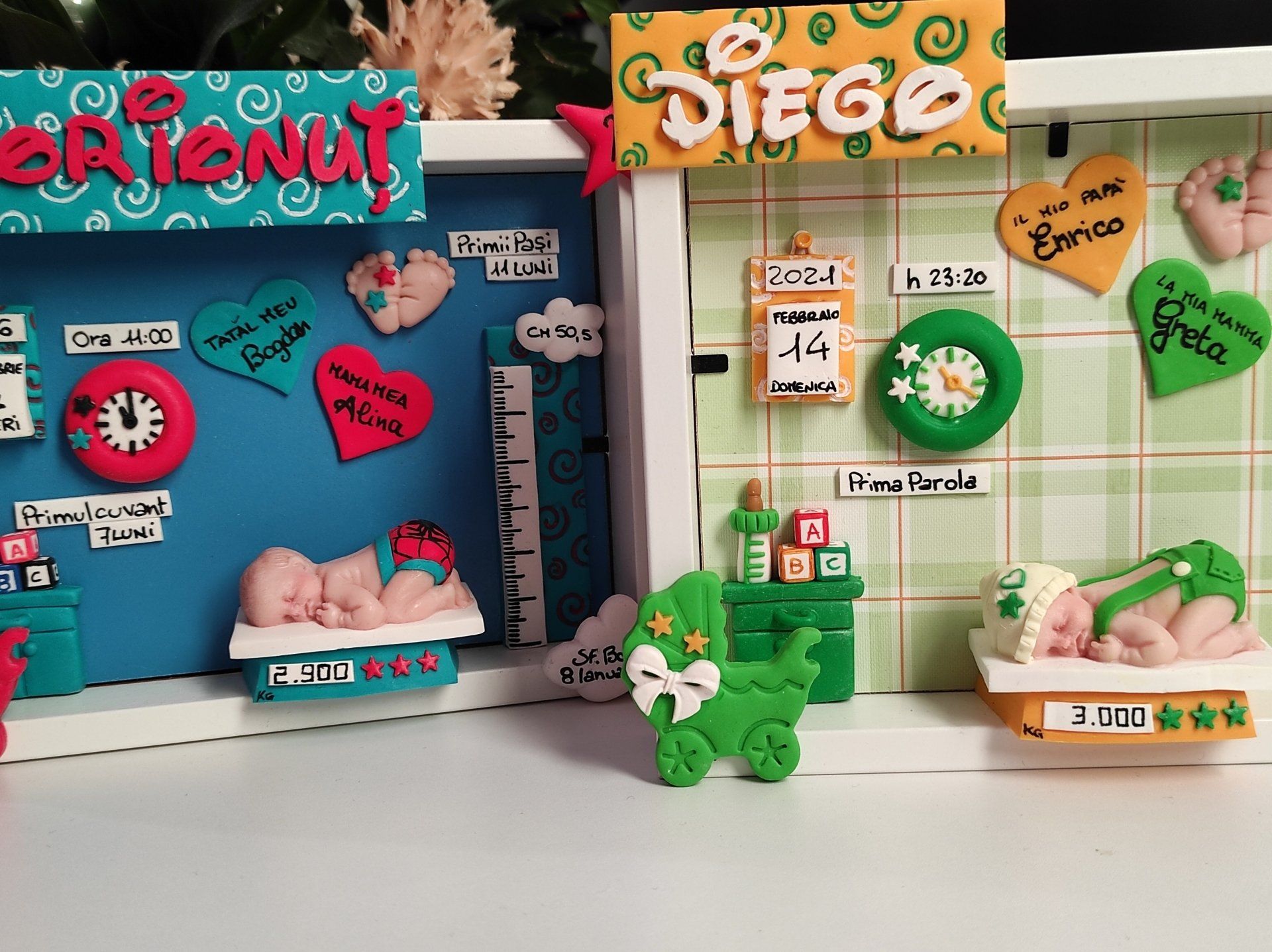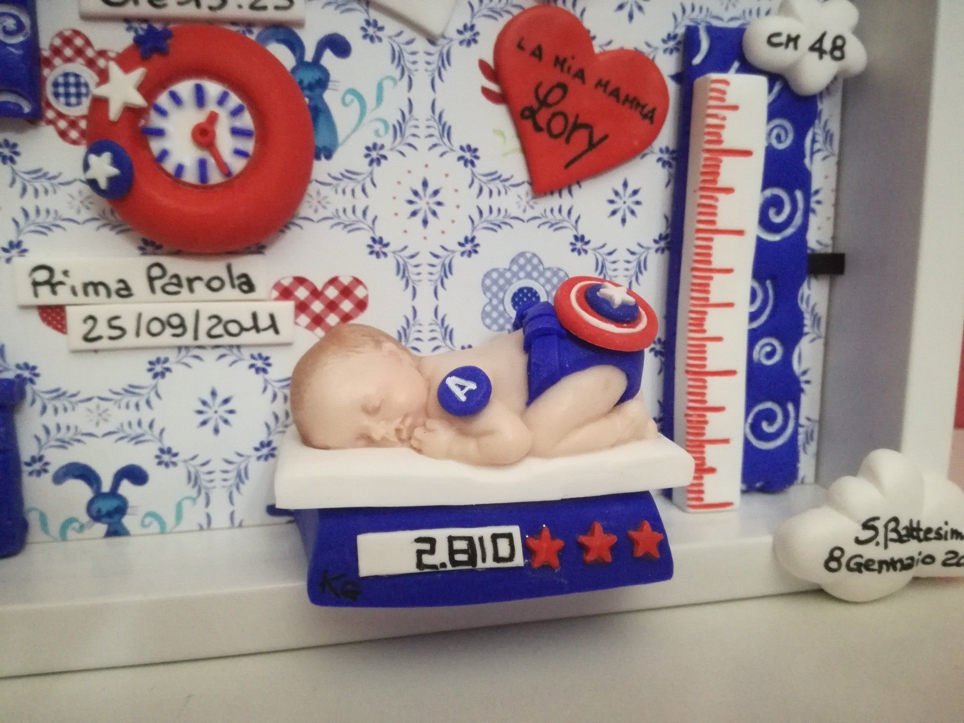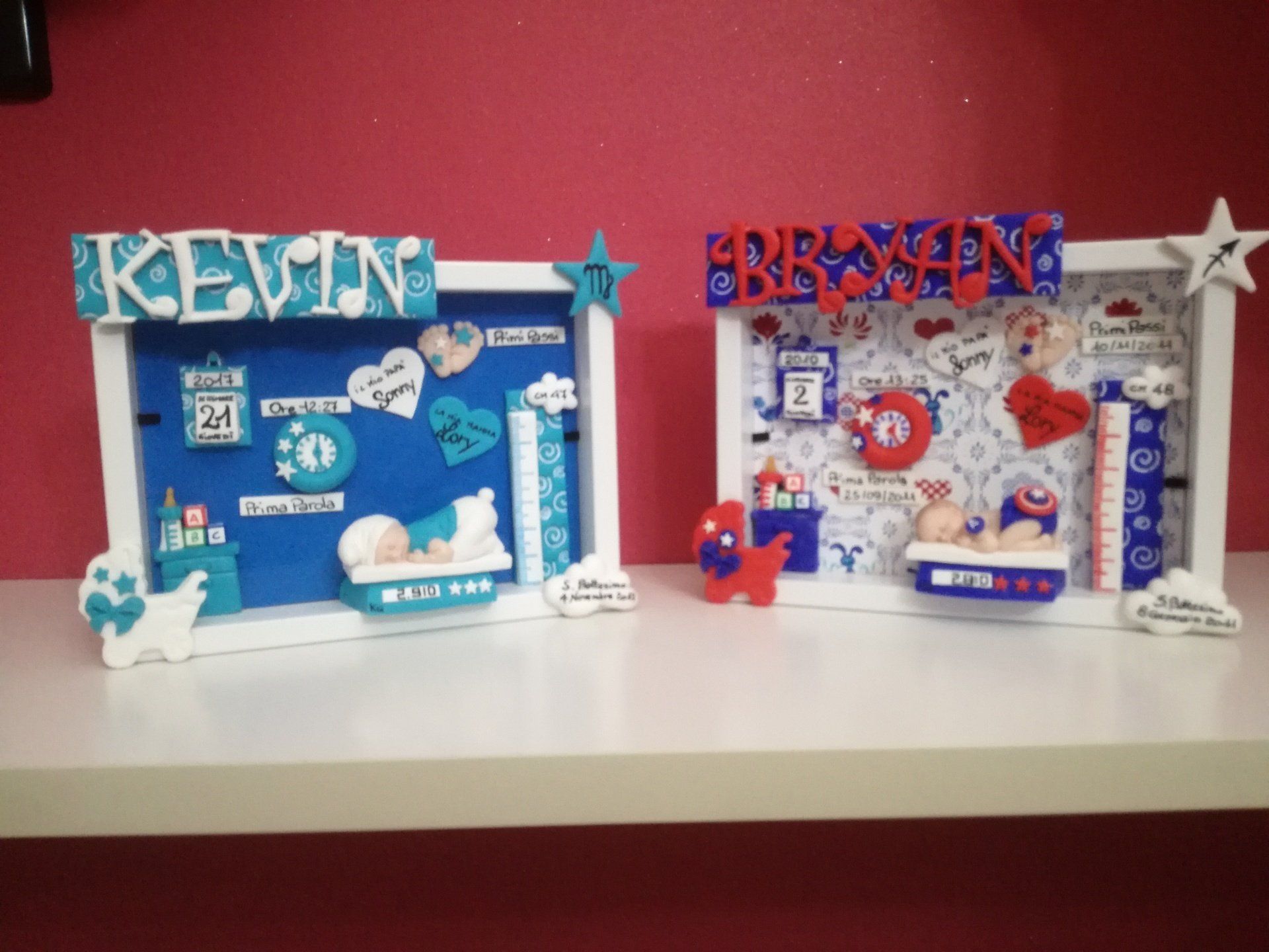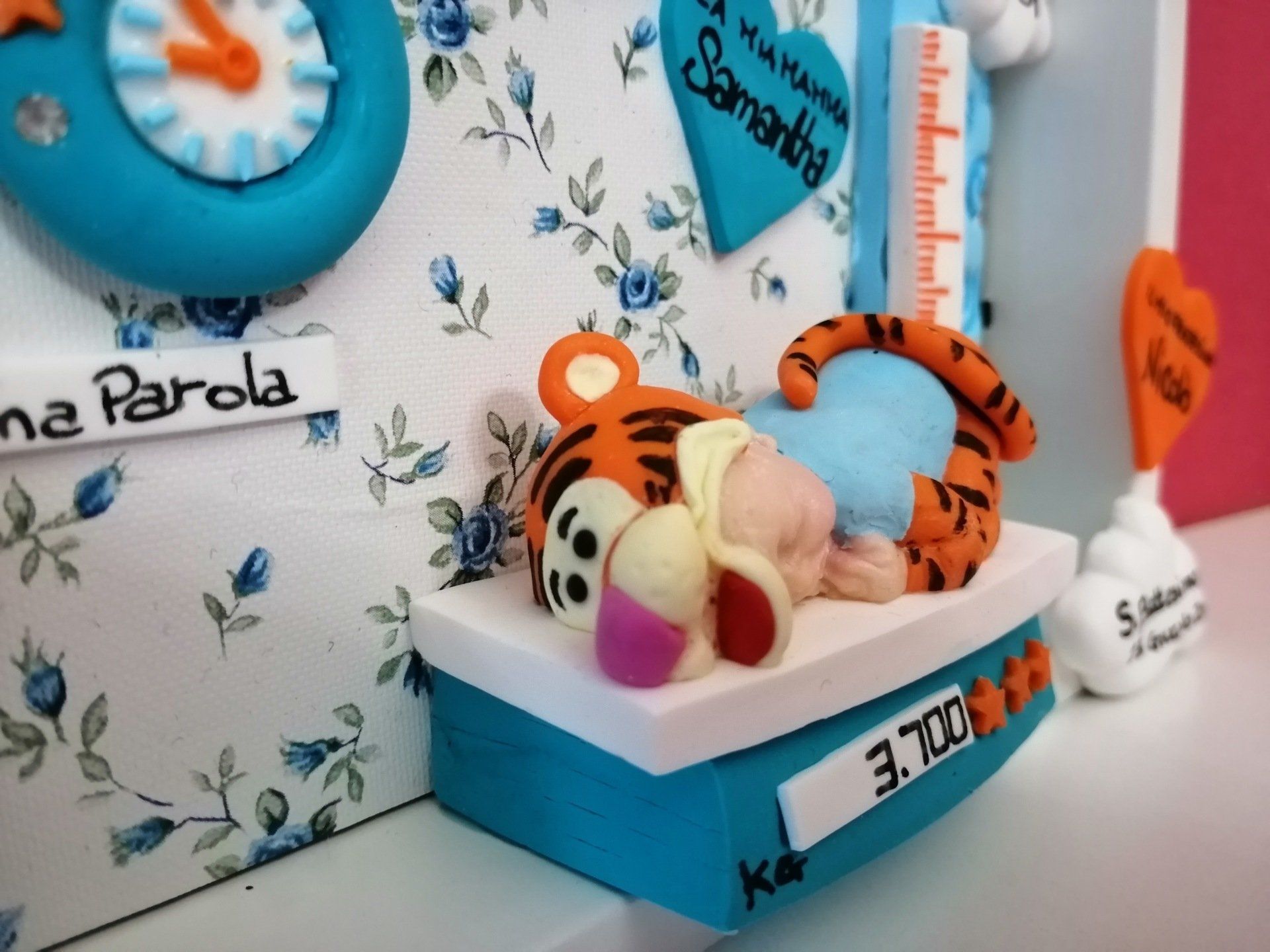 Quadretti nascita con nome,data, peso, altezza, segno zodiacale, primi passi, prima parola ... il formato big é un po' più grande del classico sia nel formato che nel nome e ha al suo interno i cuori per aggiungere il nome di mamma e papà oppure nonni, zii, padrino e madrina, o in alternativa potrete optare per il modello con primo dentino, in entrambe i casi un bel regalo adatto a tutti.