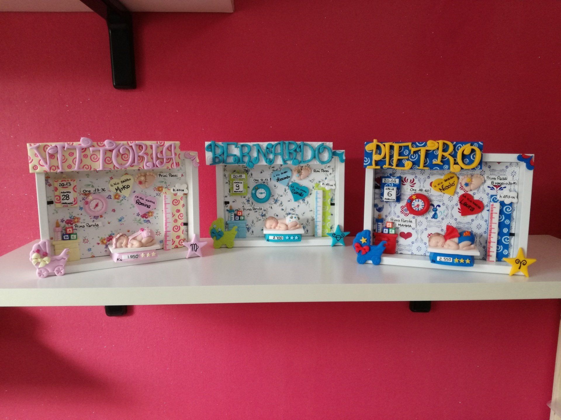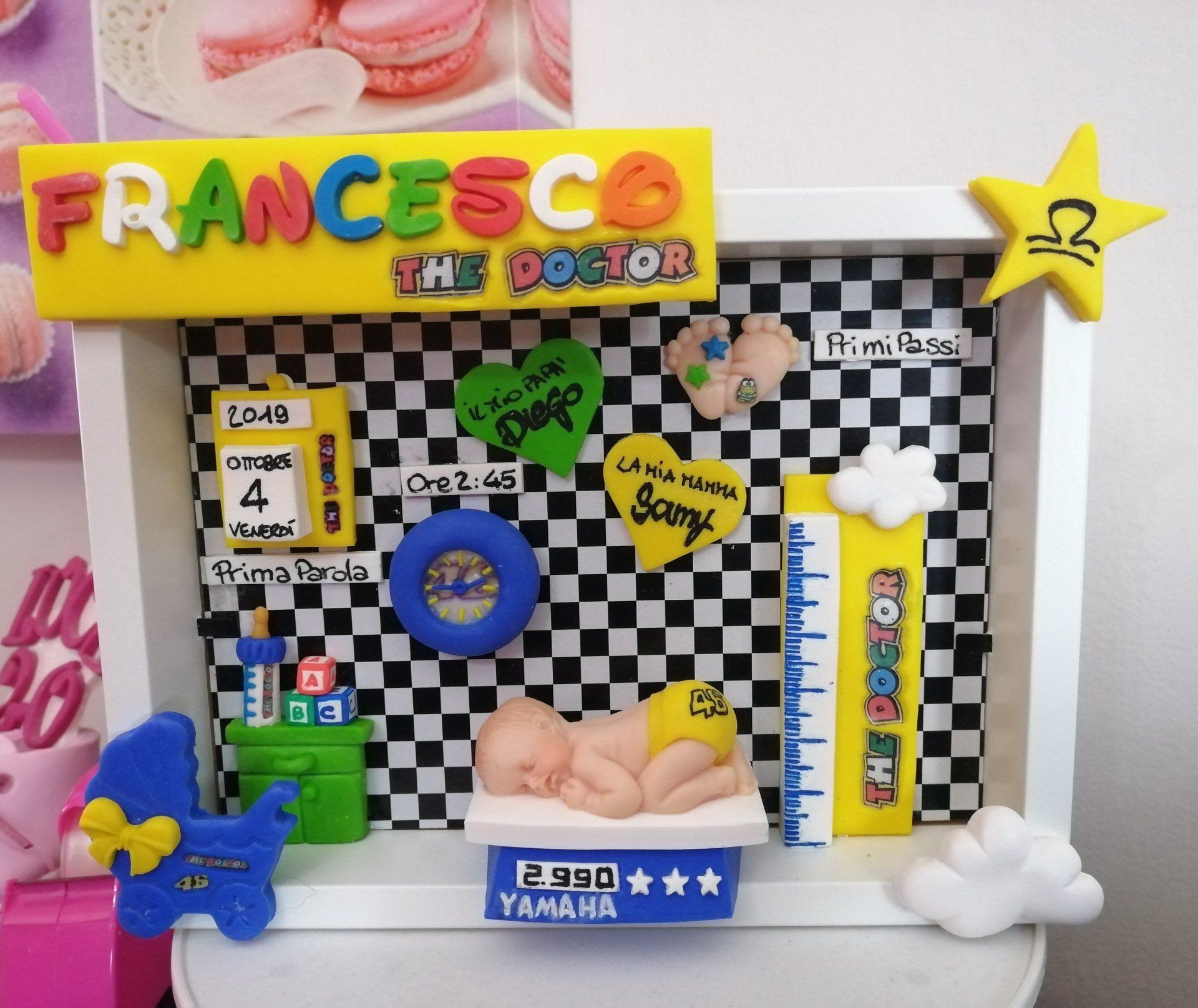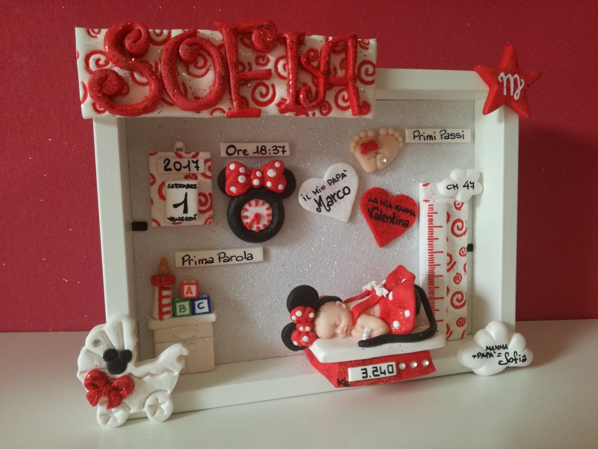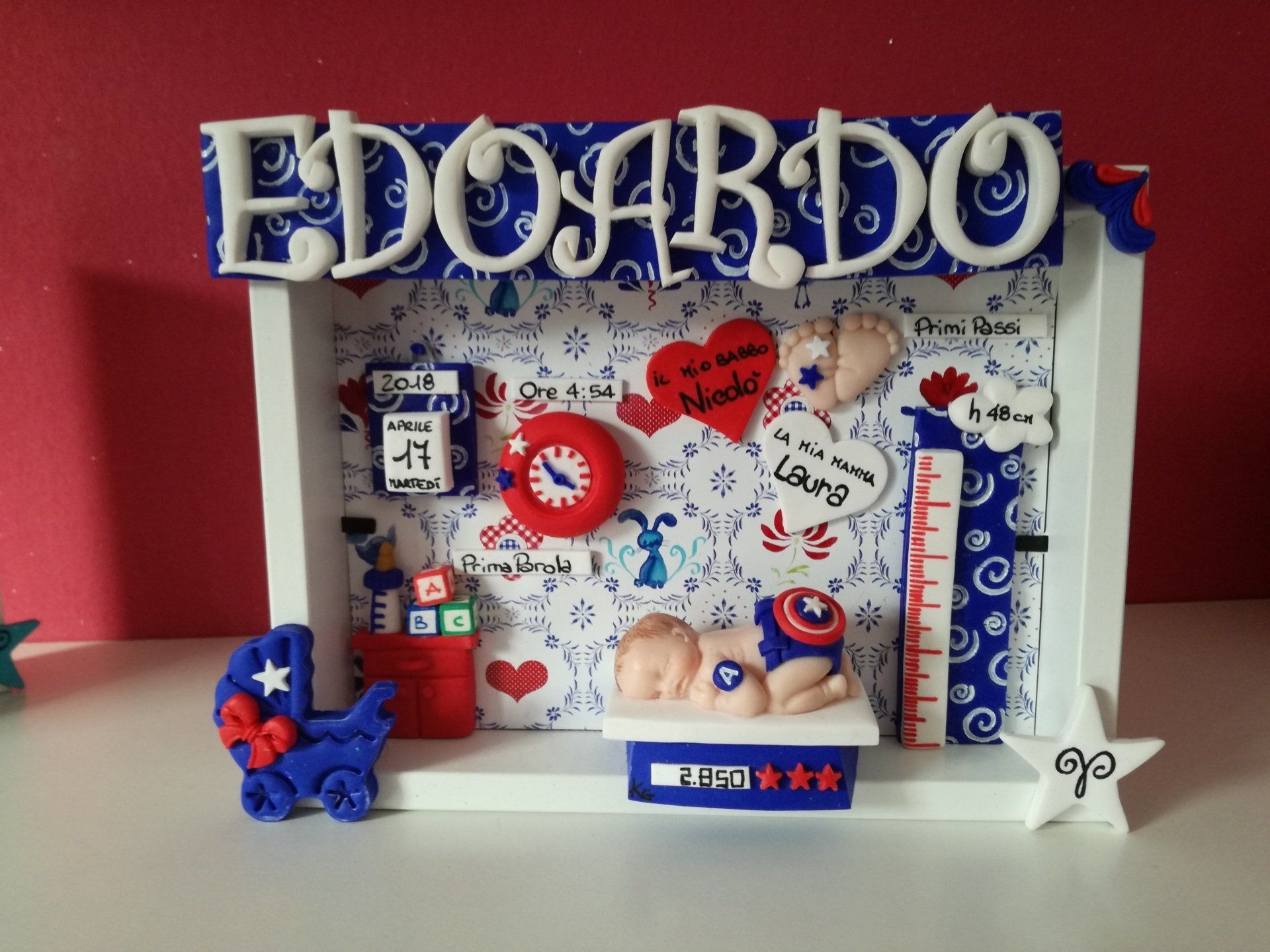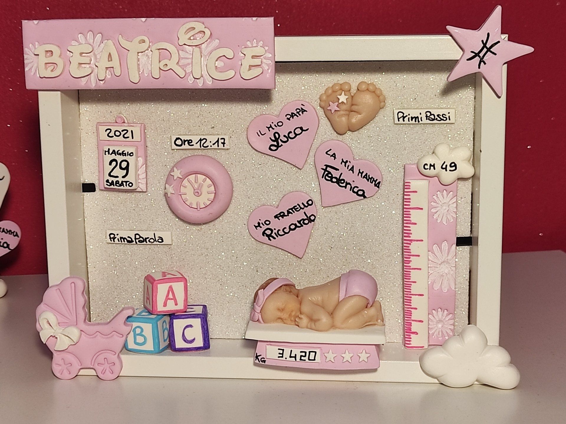 Quadretti nascita con nome,data, peso, altezza, segno zodiacale, primi passi, prima parola ... il formato big é un po' più grande del classico sia nel formato che nel nome e ha al suo interno i cuori per aggiungere il nome di mamma e papà oppure nonni, zii, padrino e madrina, o in alternativa potrete optare per il modello con primo dentino, in entrambe i casi un bel regalo adatto a tutti.