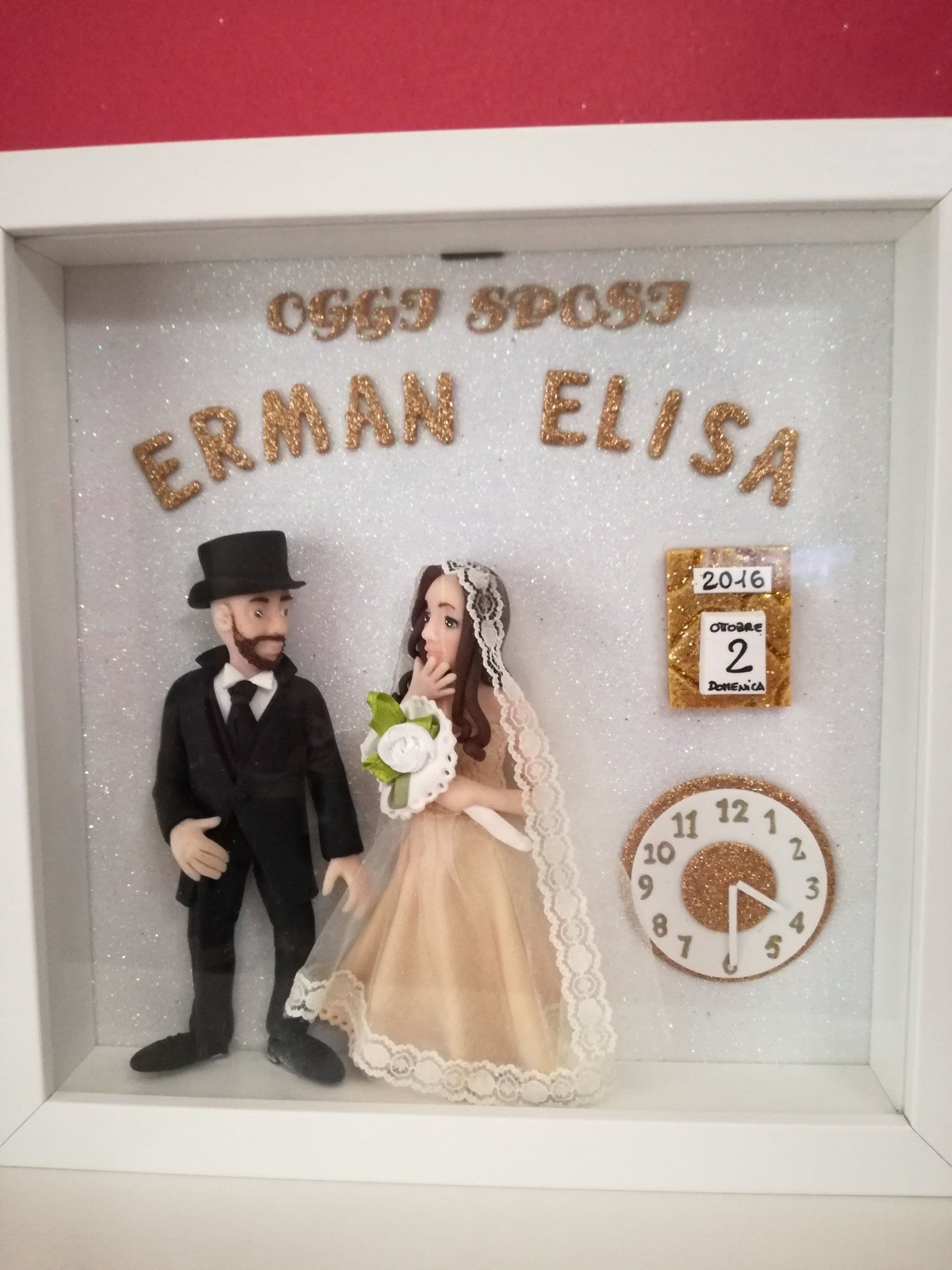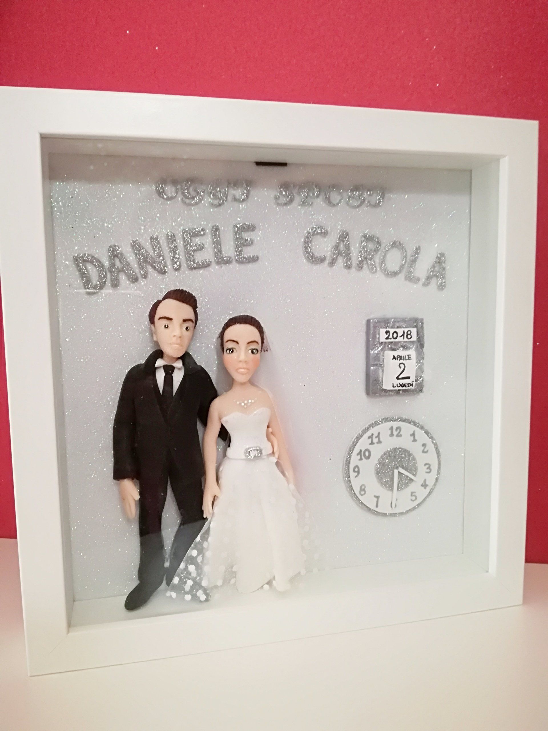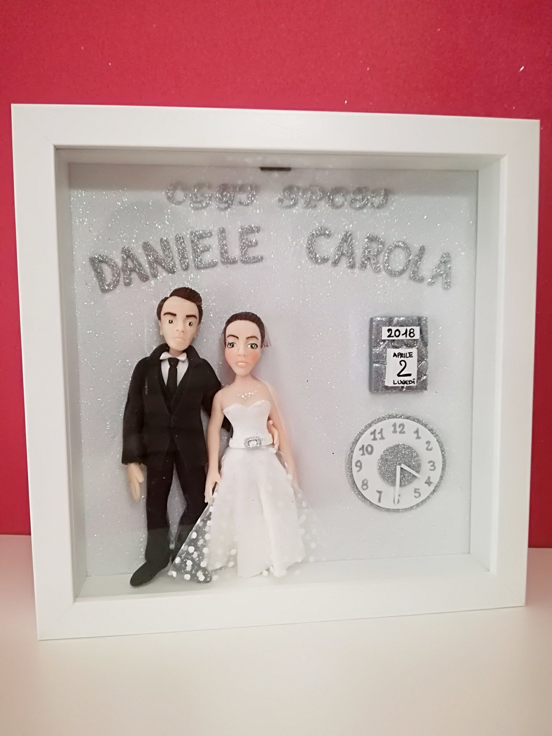 Originalissimi i quadri sposi da regalare o perfetti per regalarti un ricordo di un giorno importante, possiamo studiarlo insieme riproducendo la coppia con i propri abiti o in una veste più simpatica con l'abbigliamento che più li caratterizza, o qualcosa di più semplice con i dati e la loro foto.