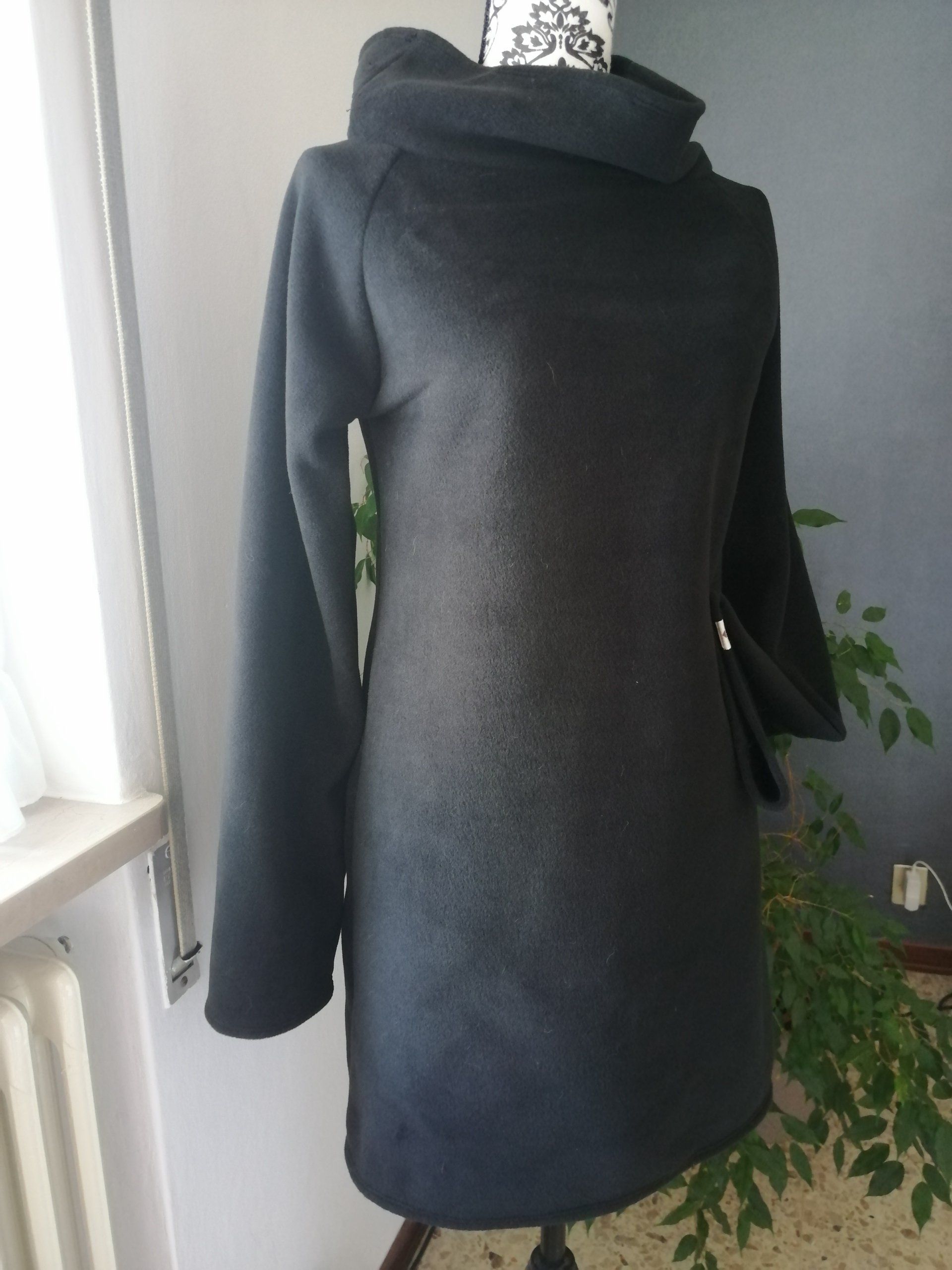 Comodo e caldo ma con stile questo abito in felpa made in Italy, realizzato in felpa garzata 100% cotone di colore nero per la parte principale e jersey fantasia per l'ampio collo, la ripresa sulla tasca centrale e i polsini