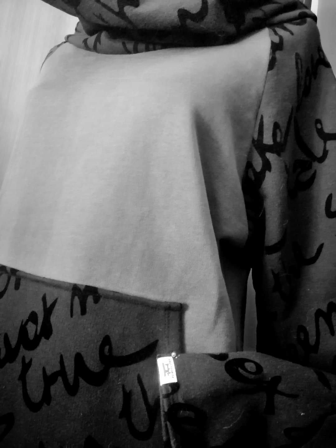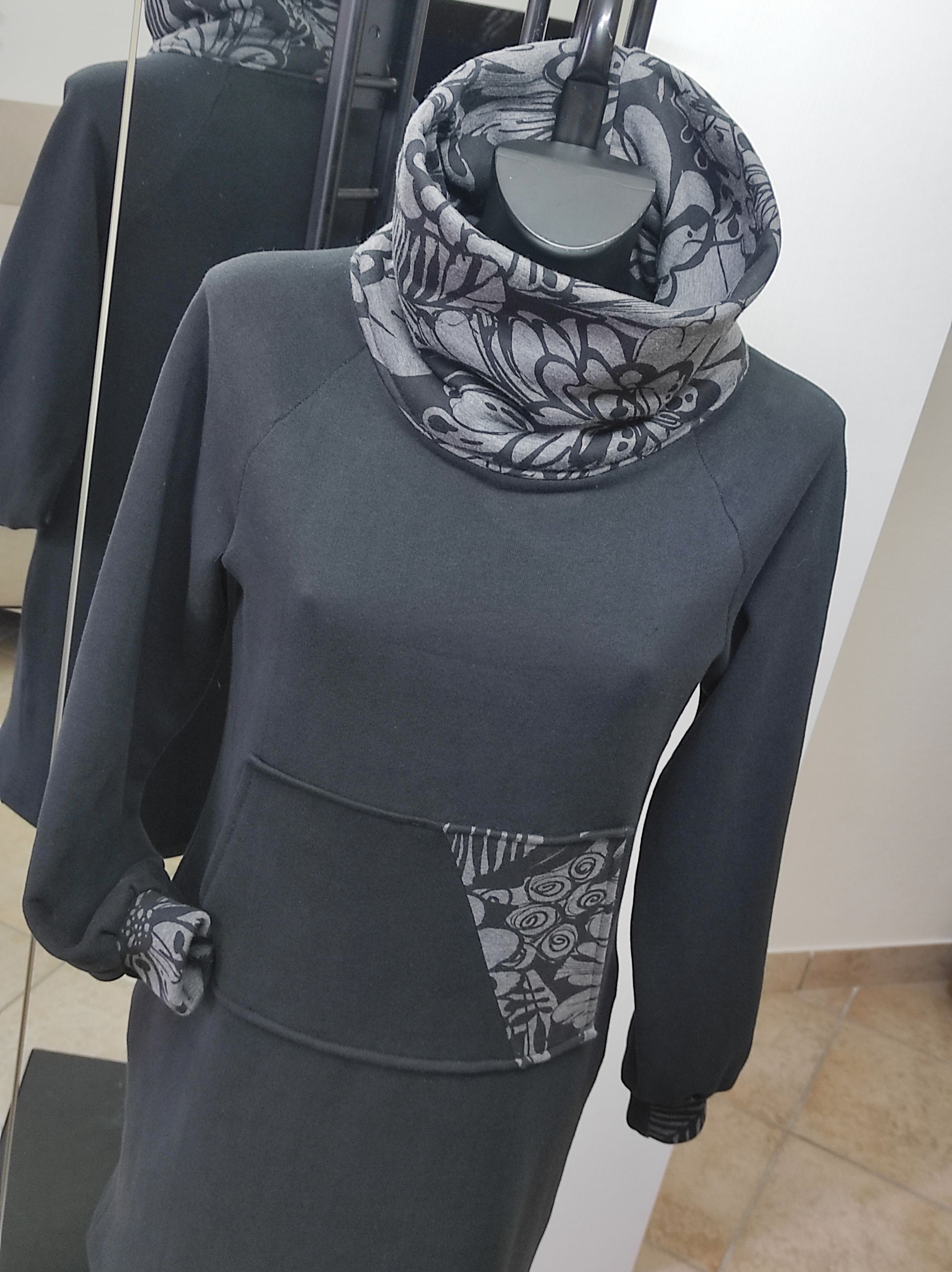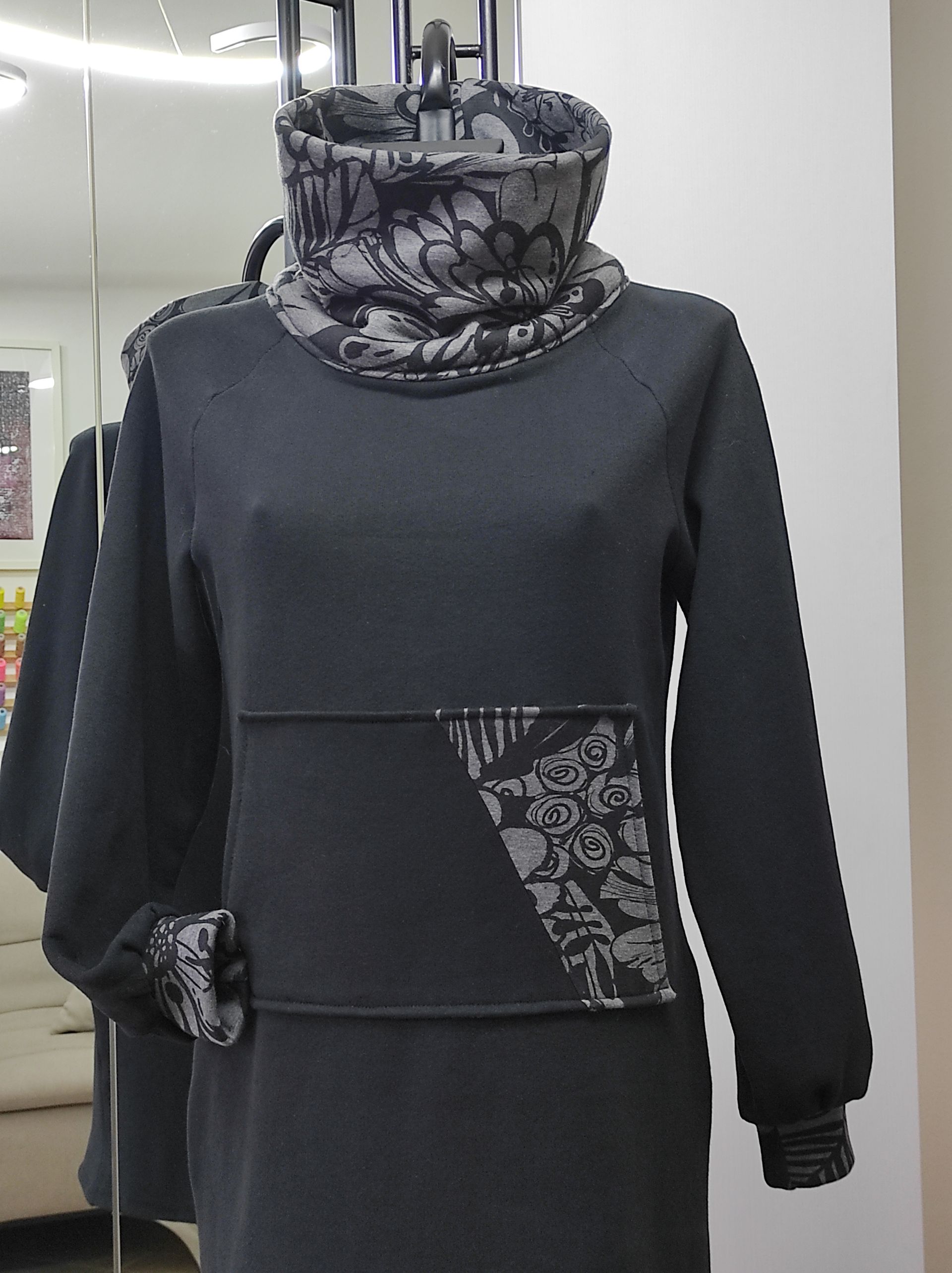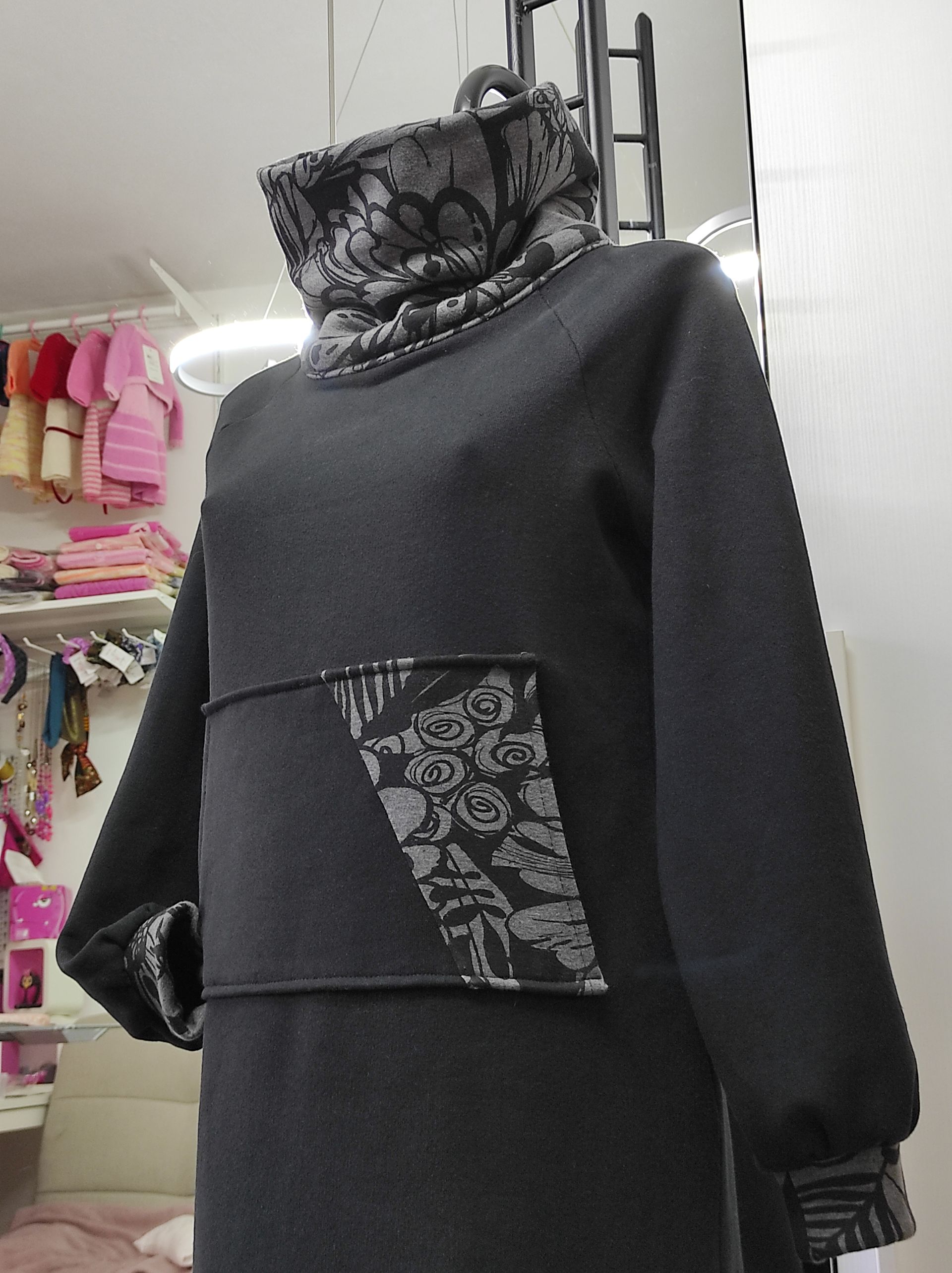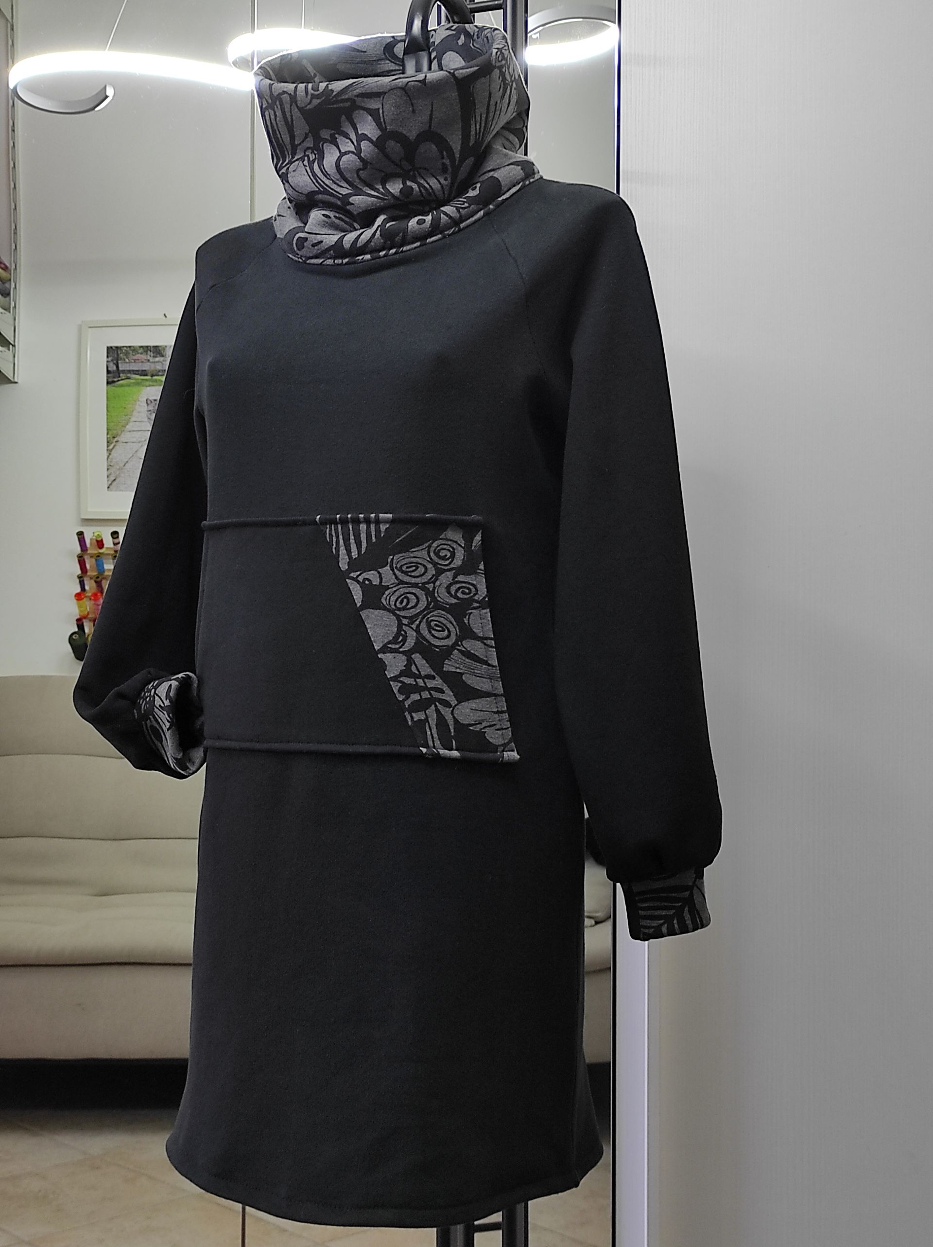 ButtonComodo e caldo ma con stile questo abito in felpa made in Italy, realizzato in felpa garzata 100% cotone di colore nero per la parte principale e jersey fantasia per l'ampio collo, la ripresa sulla tasca centrale e i polsini
