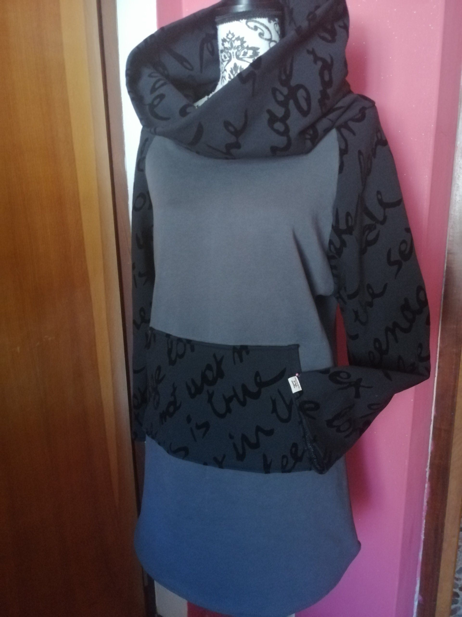 Comodo e caldo ma con stile questo abito in felpa made in Italy, antracite per la parte principale e meravigliosa felpa nera con scritte in ciniglia per l'ampio collo, le maniche e la tasca centrale.
