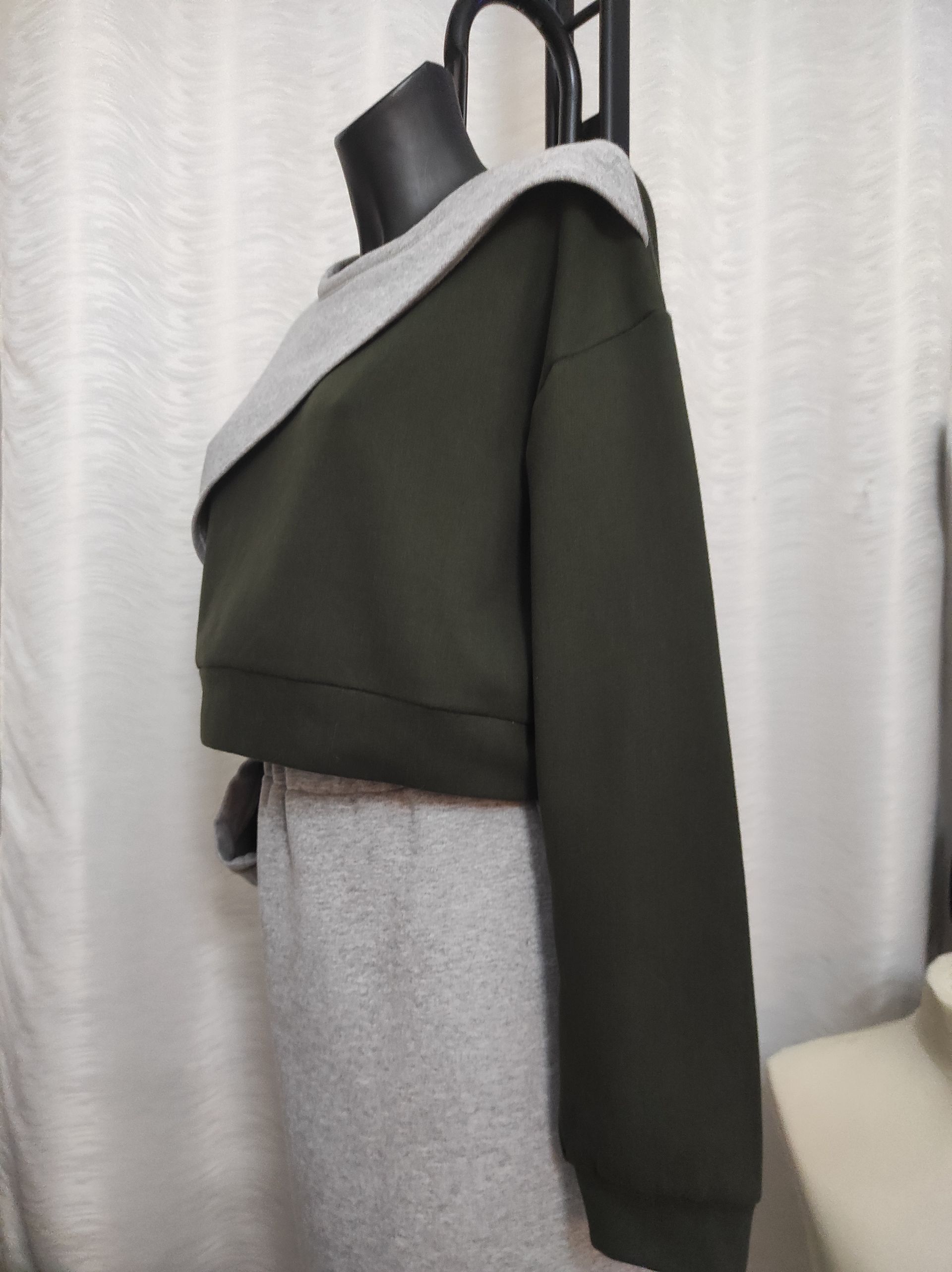 Collo a ciambella, maniche lunghe e leggermente a kimono.