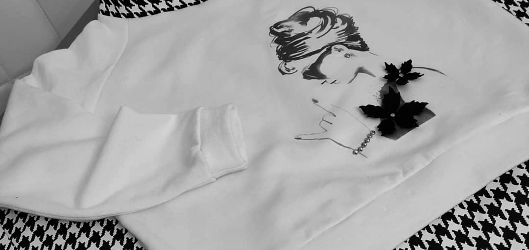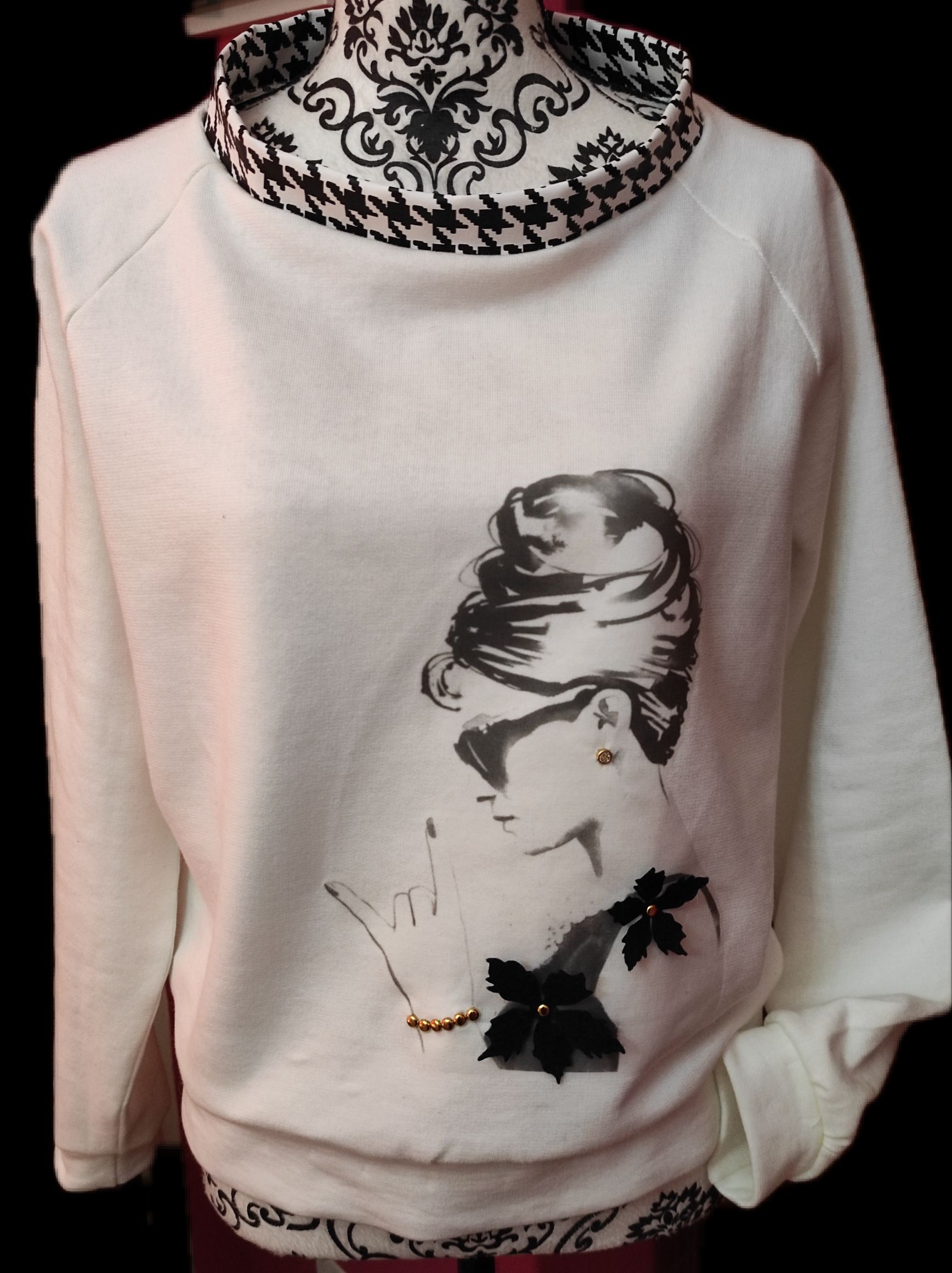 Felpa realizzata in felpa di cotone non garzato con una bellissima Audrey Hepburn in versione rock, a renderla ancora più originale i dettagli che la valorizzano e il suo collo largo un po' a barchetta in finta pelle pied de poule.