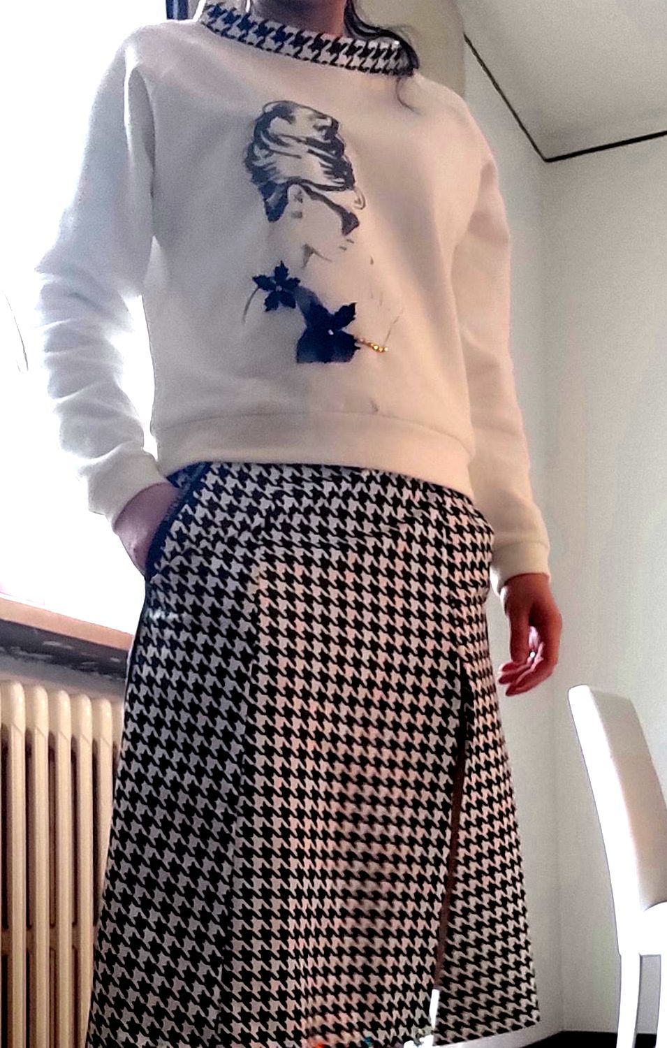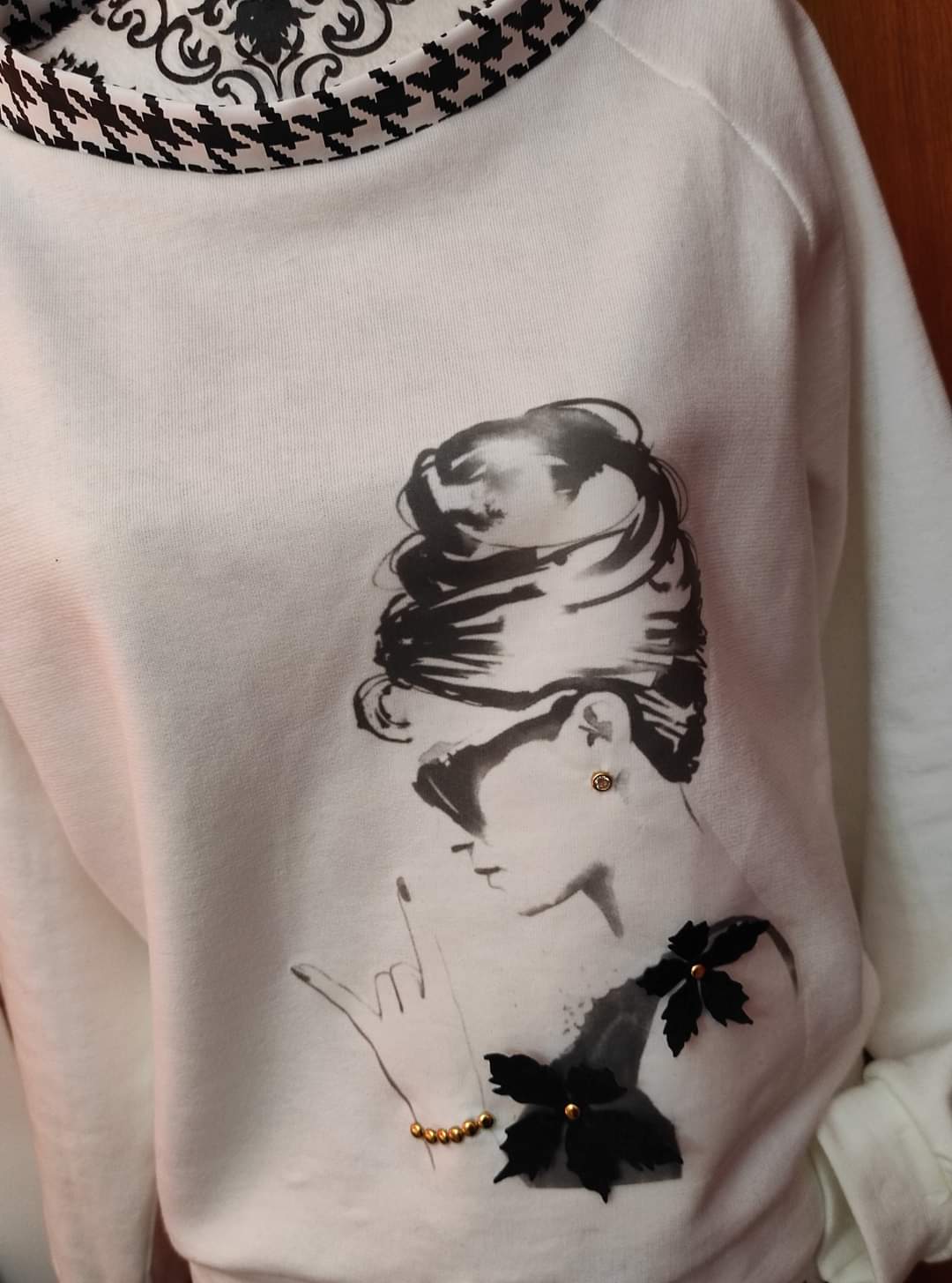 ButtonFelpa realizzata in felpa di cotone non garzato con una bellissima Audrey Hepburn in versione rock, a renderla ancora più originale i dettagli che la valorizzano e il suo collo largo un po' a barchetta in finta pelle pied de poule.
