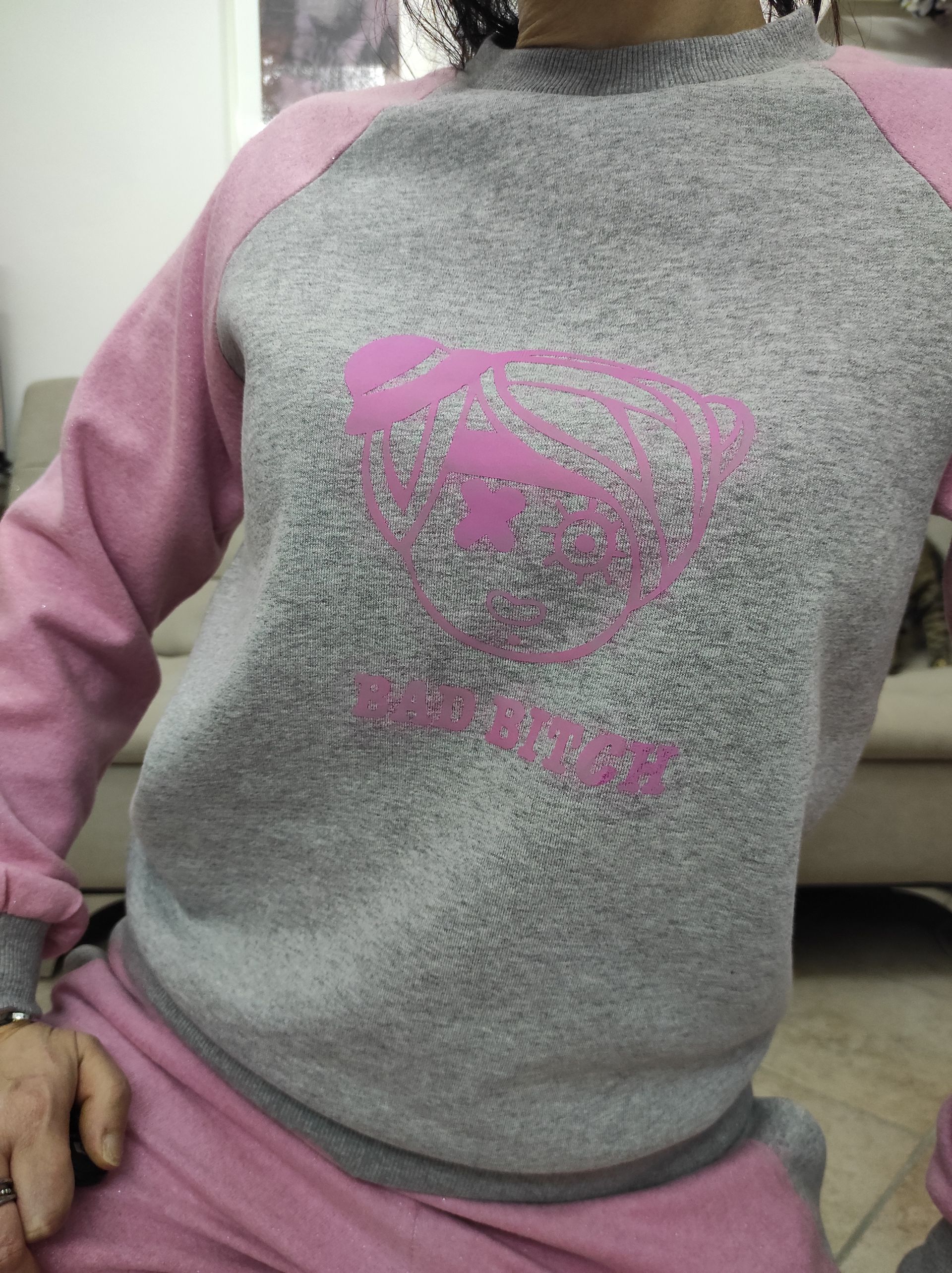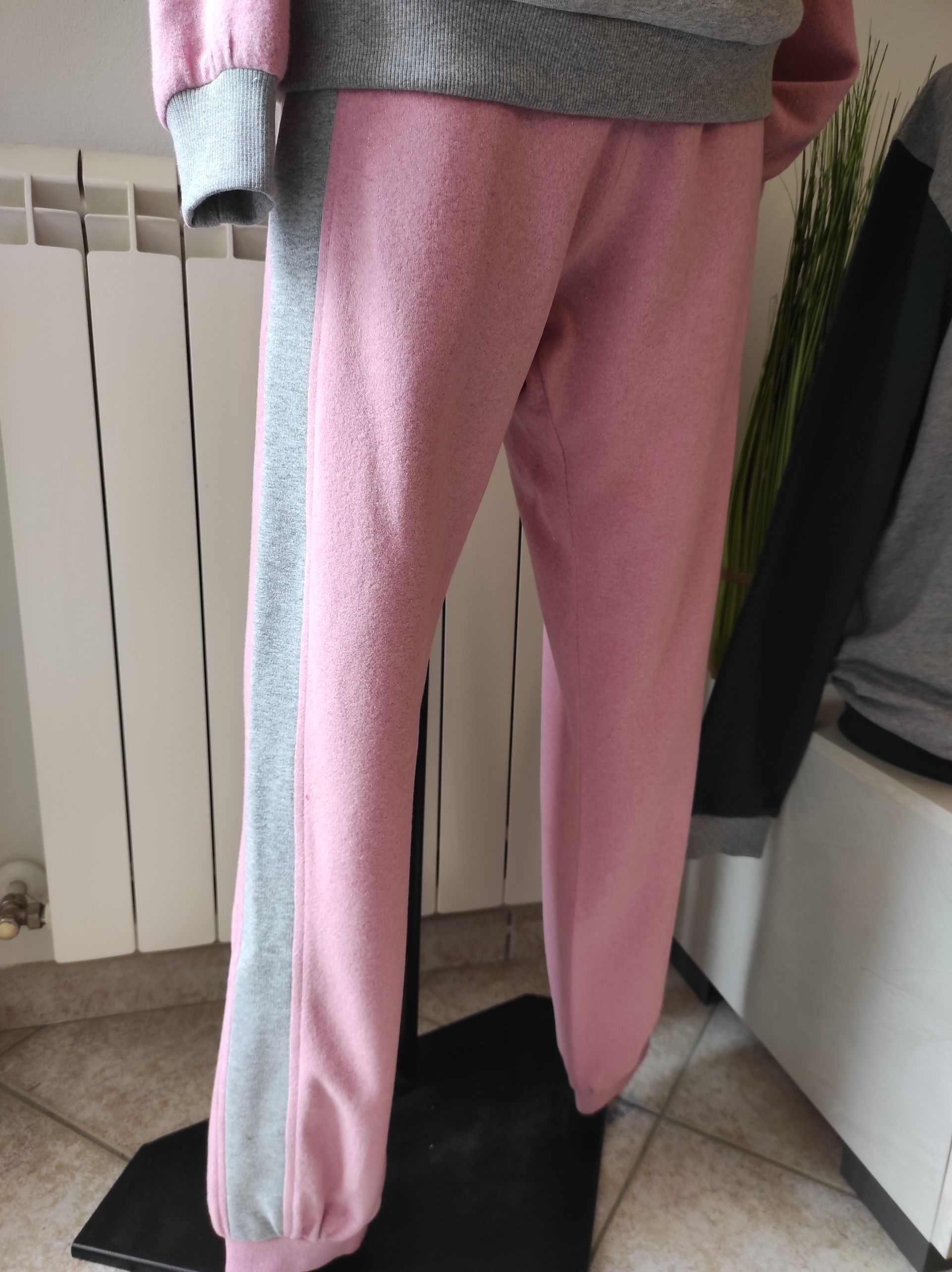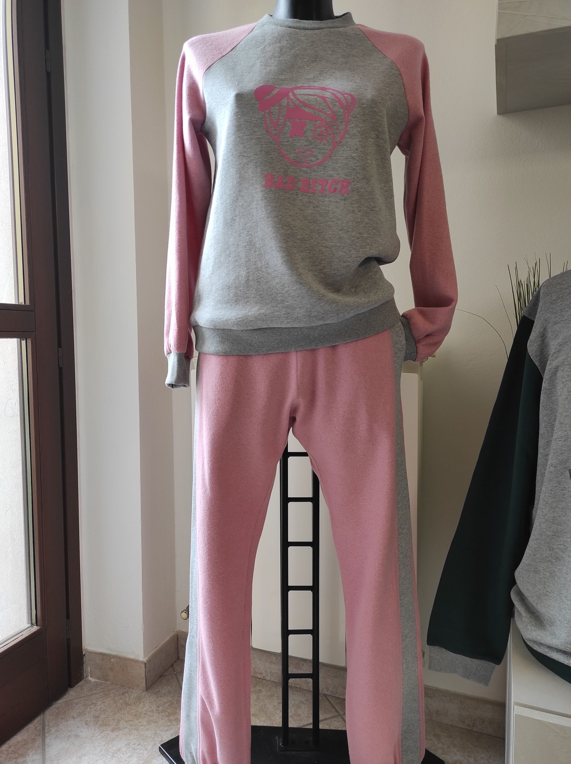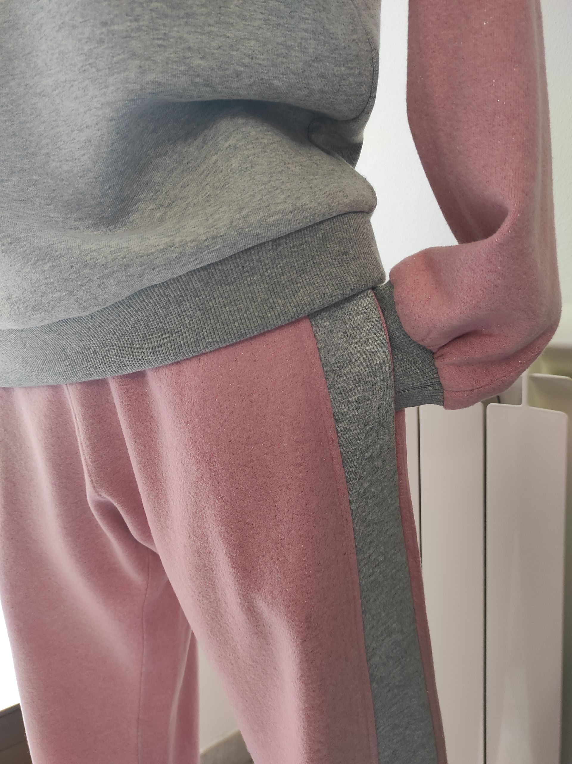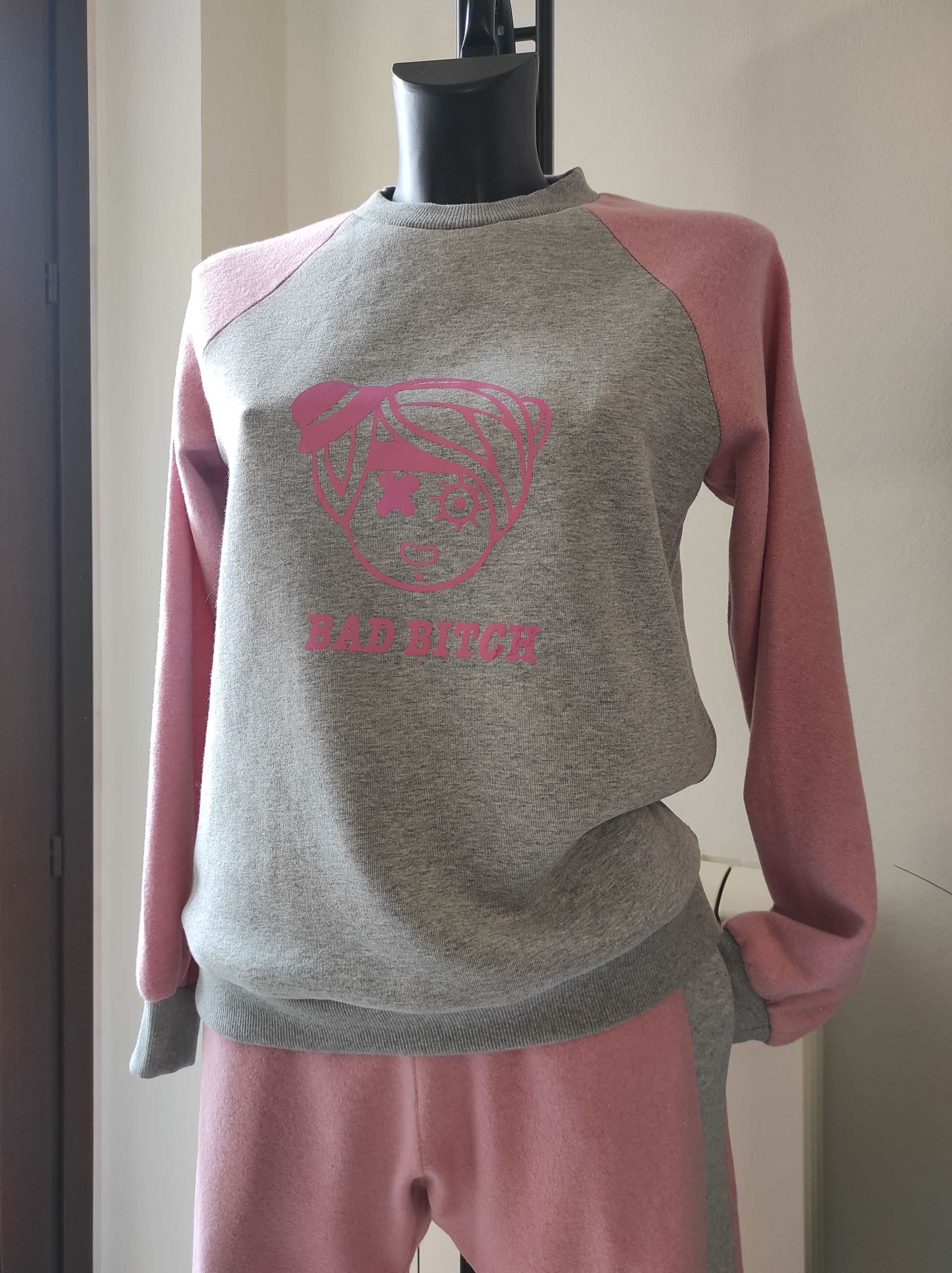 Maglia e pantalone con tasche #badbitch in morbida felpa di cotone rosa lurex e grigio