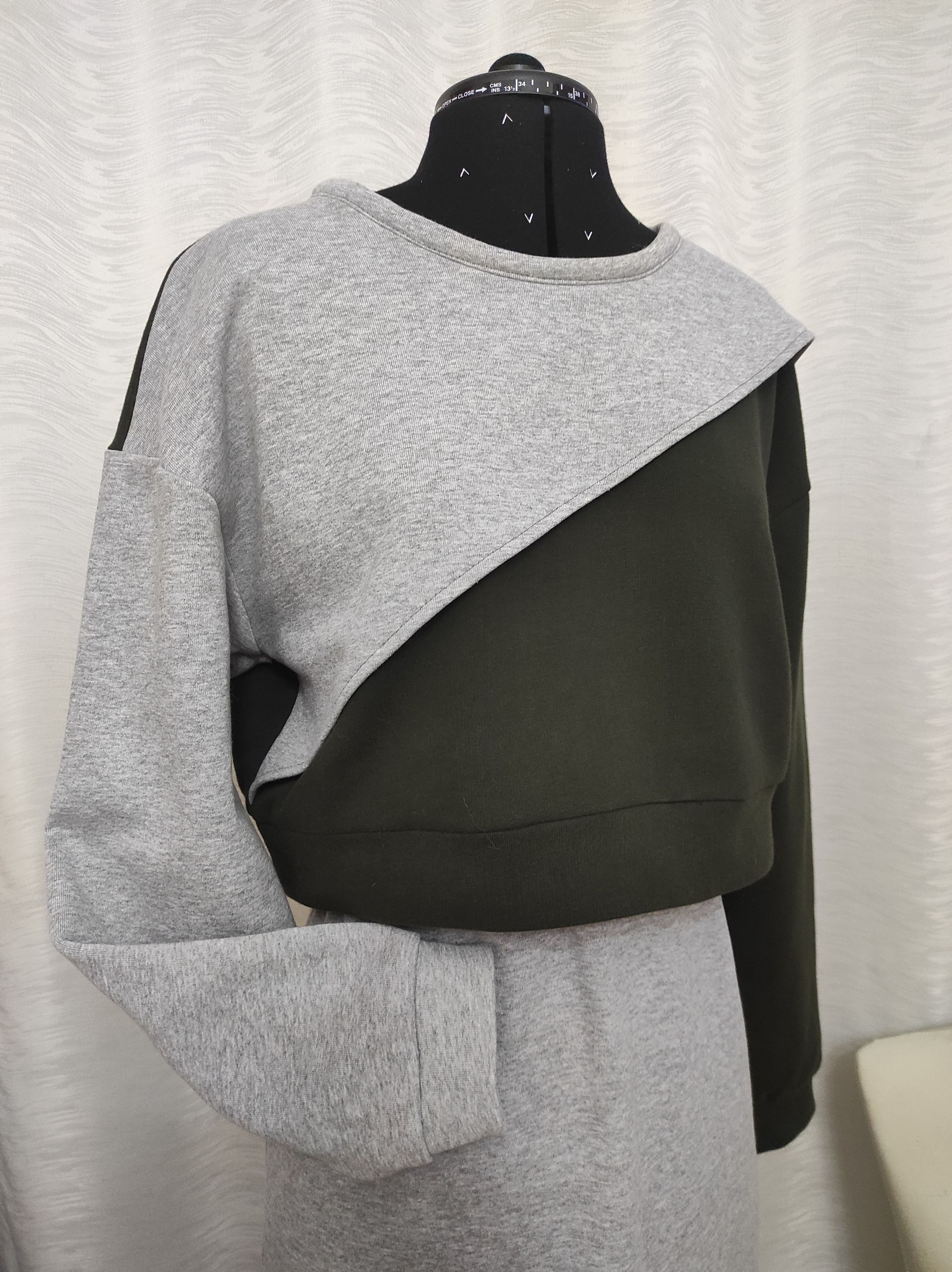 Comodissimo abito a manica 3/4 arricciata alla spalla, realizzato in calda e morbida felpa made in Italy color petrolio.