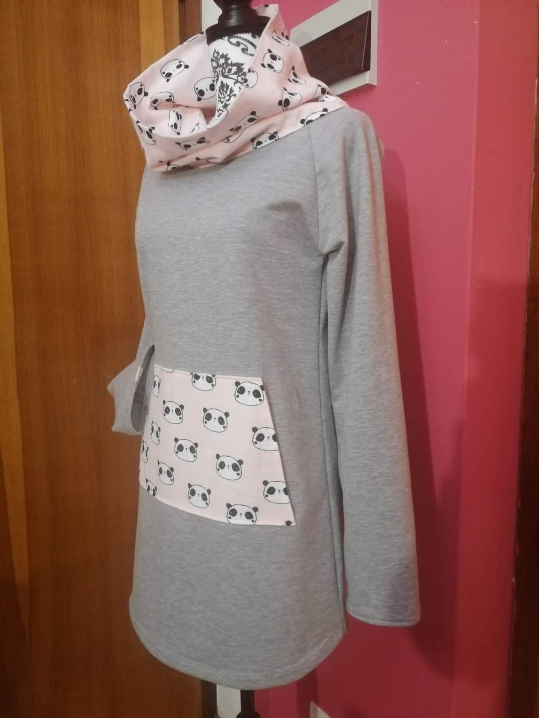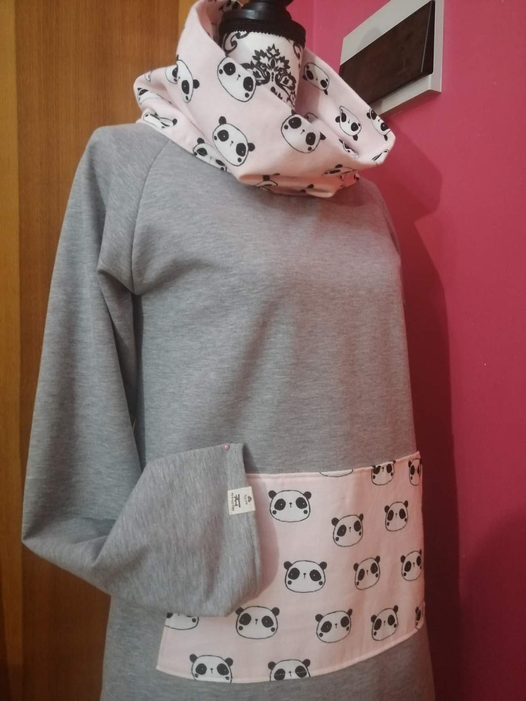 Morbido, caldo e delicato, realizzato in felpa di cotone garzata 95% cotone e 5% elastan, collo alto a ciambella e tasca centrale in flanella rosa con teneri panda.