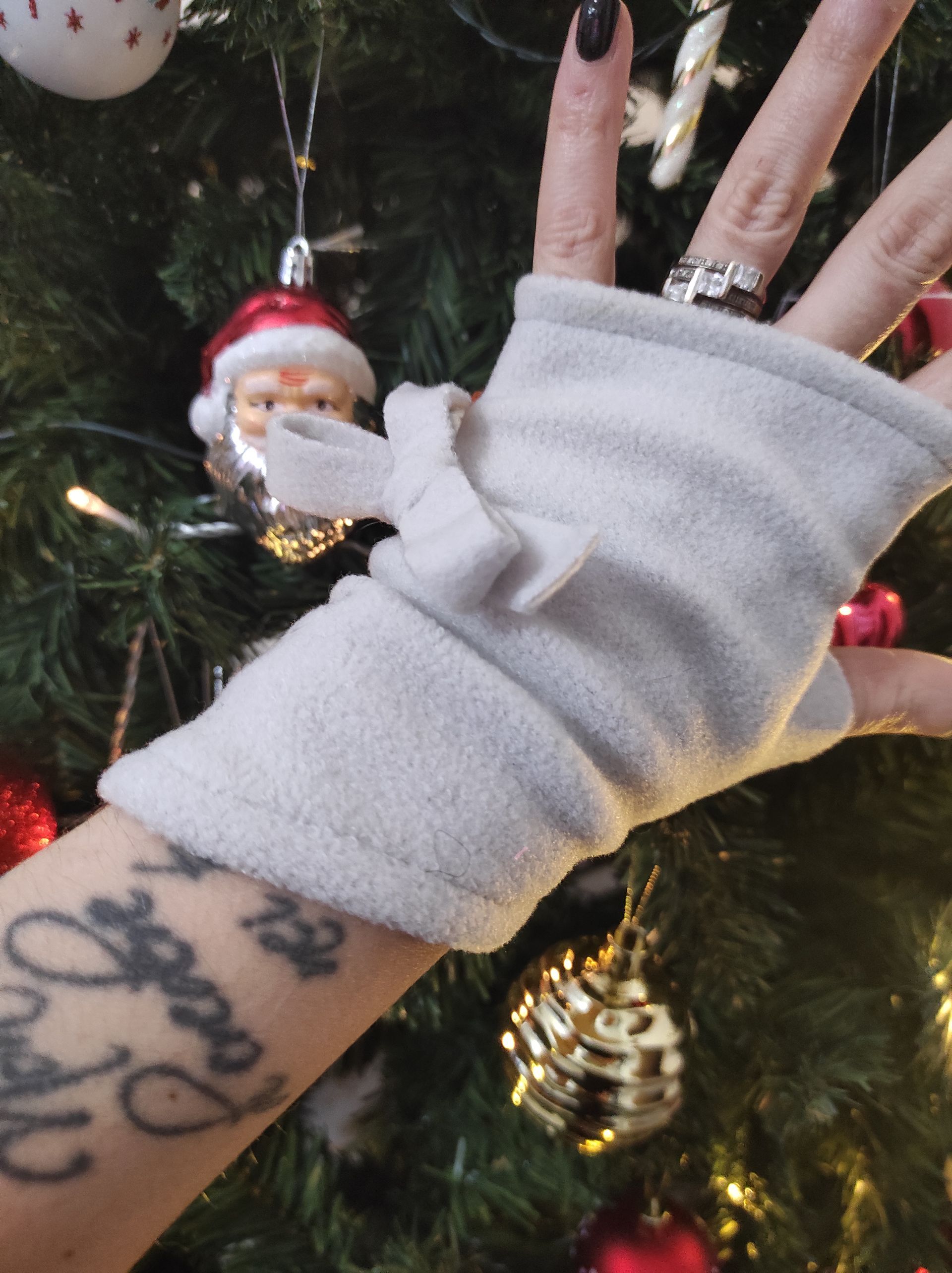 Manicotti a taglio asimmetrico realizzati in caldo e soffice pile con fiocco