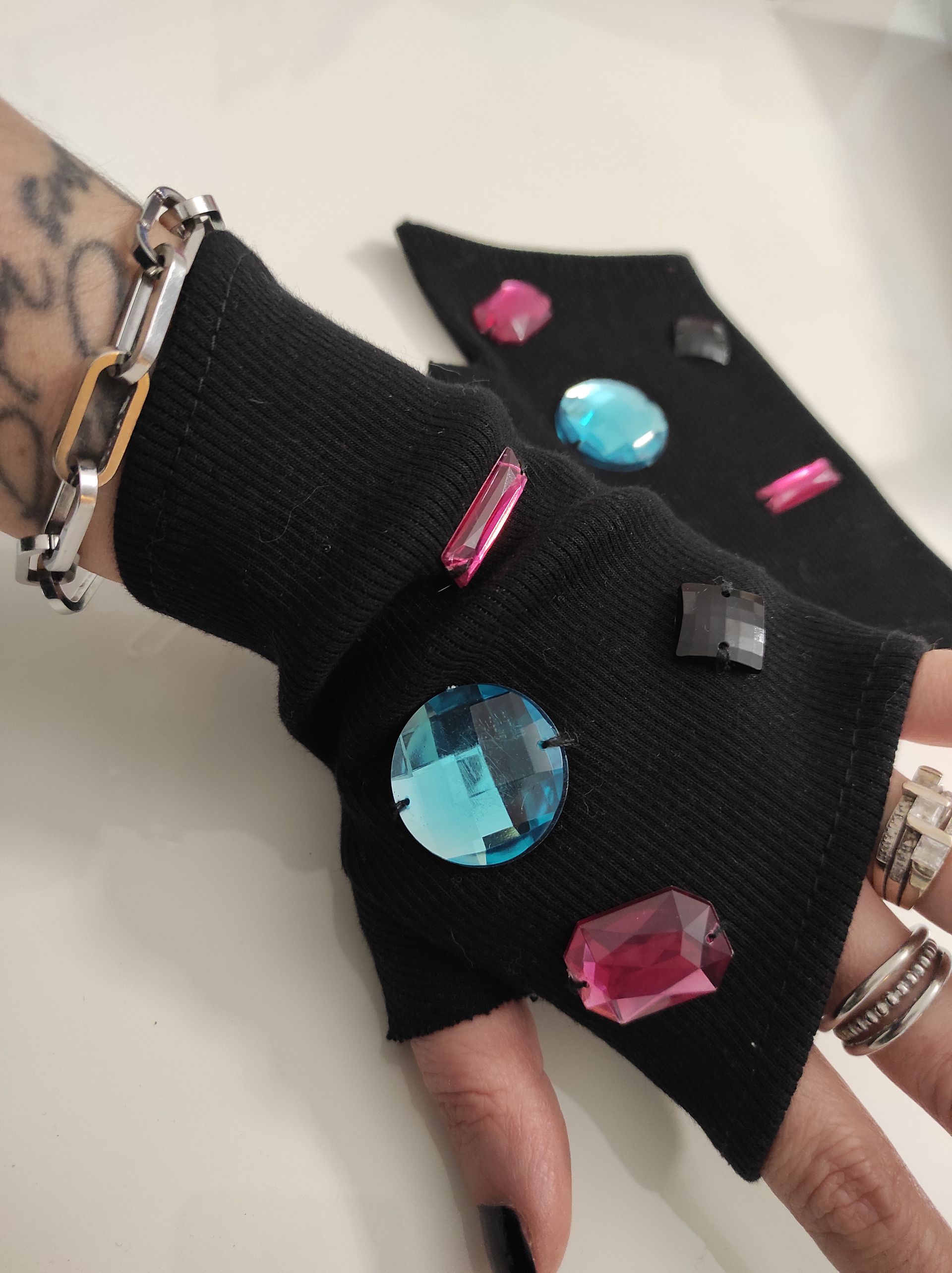 Guanti senza dita con broderie realizzata all'uncinetto e decorata con borchie