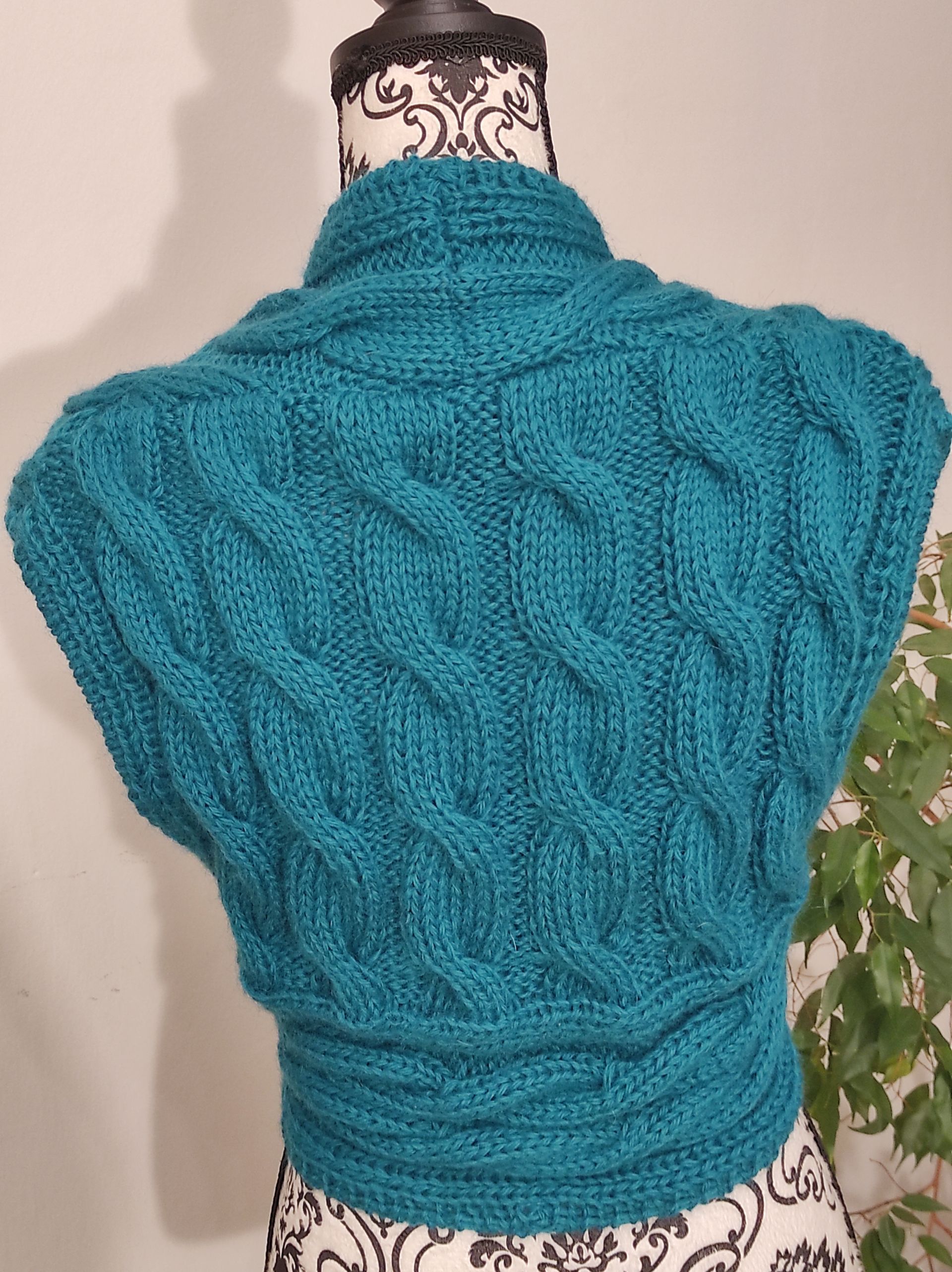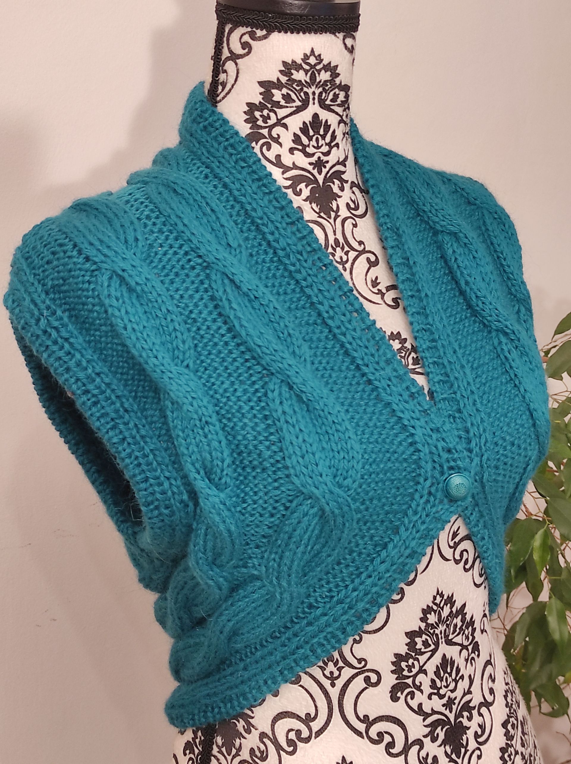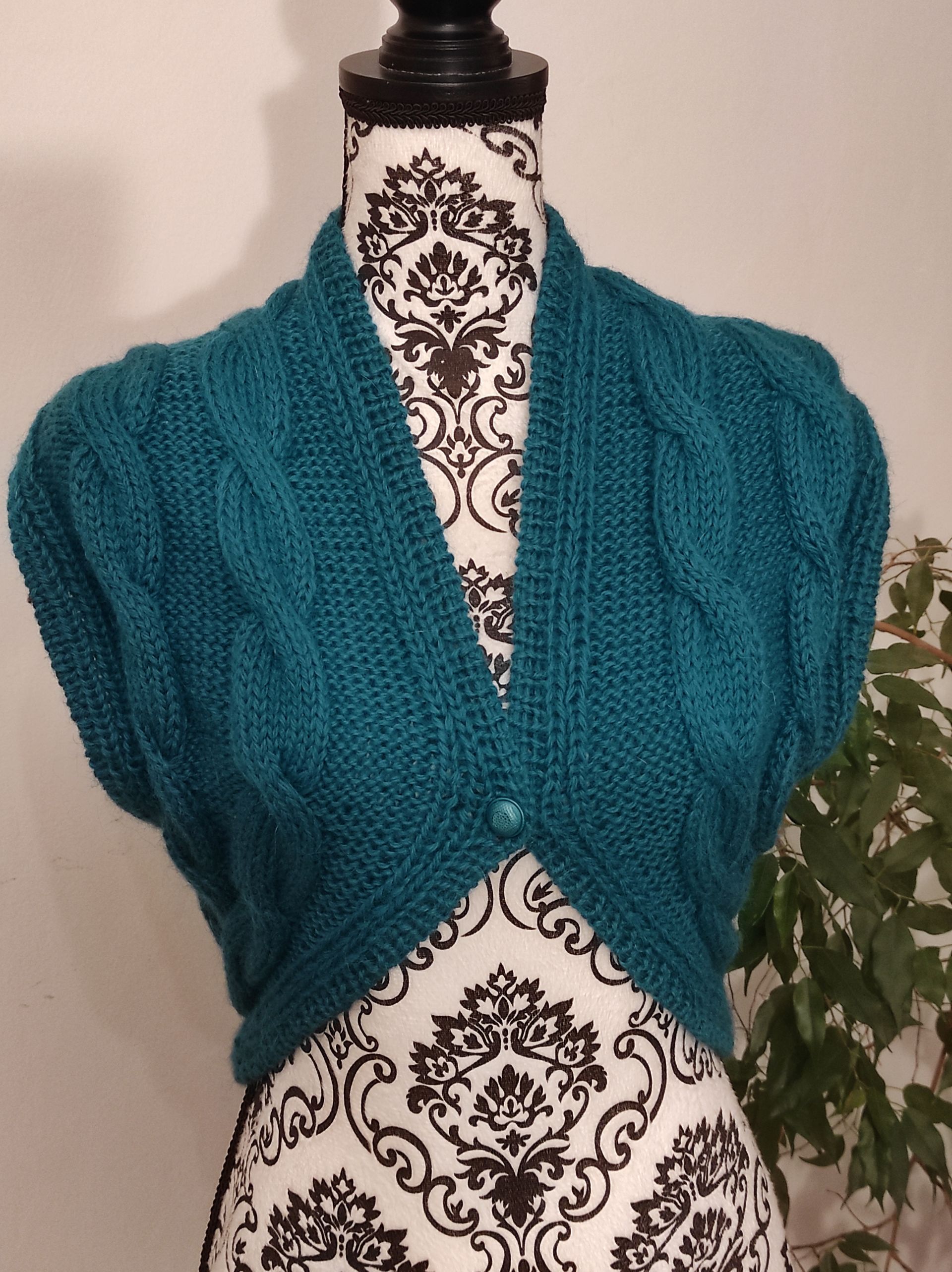 Coprispalle corto in lana a un bottone, realizzato ai ferri con motivo a trecce grosse