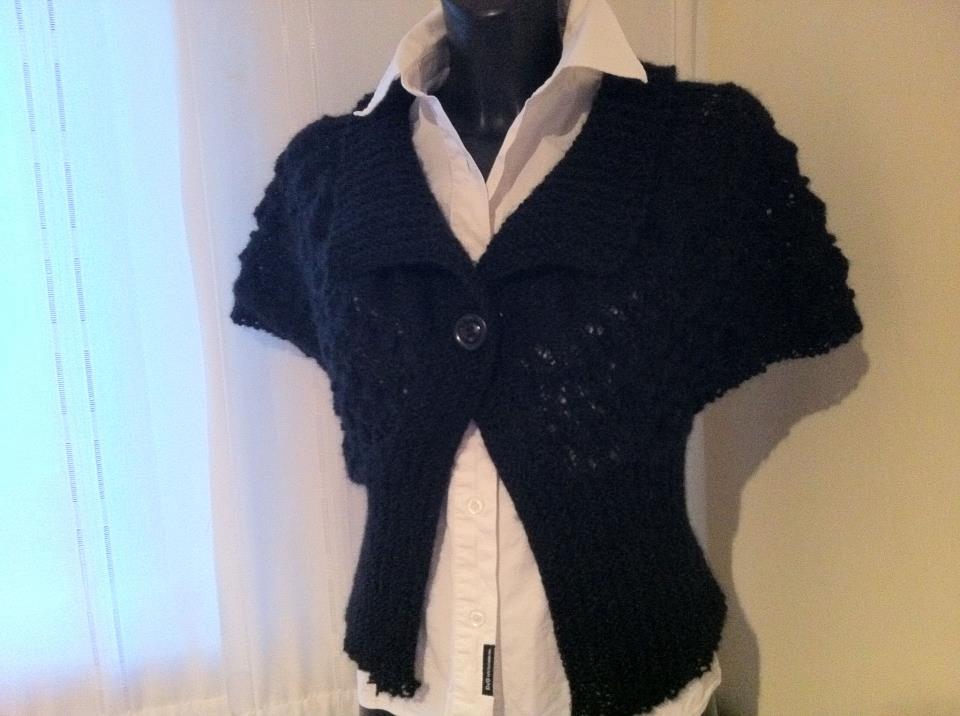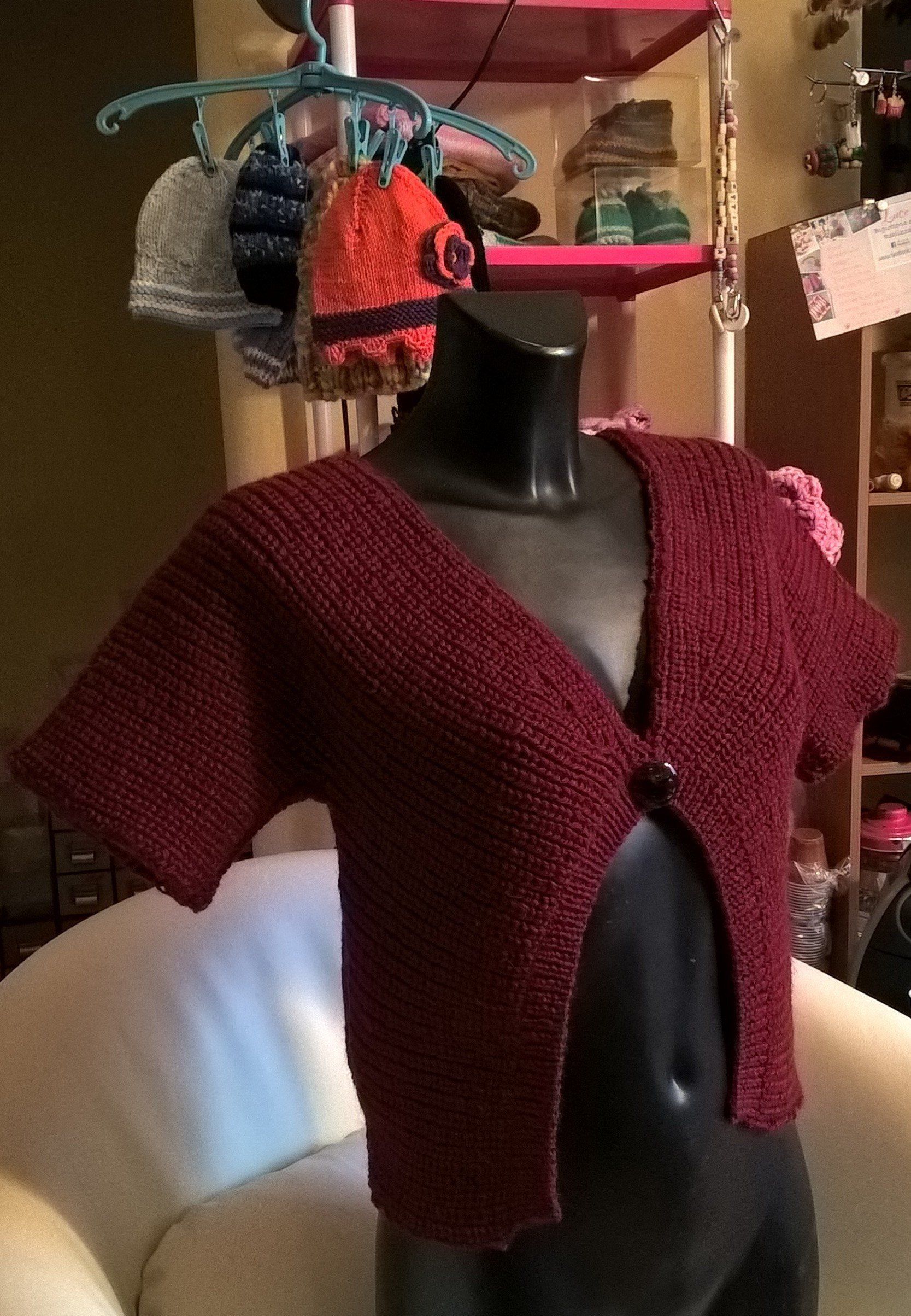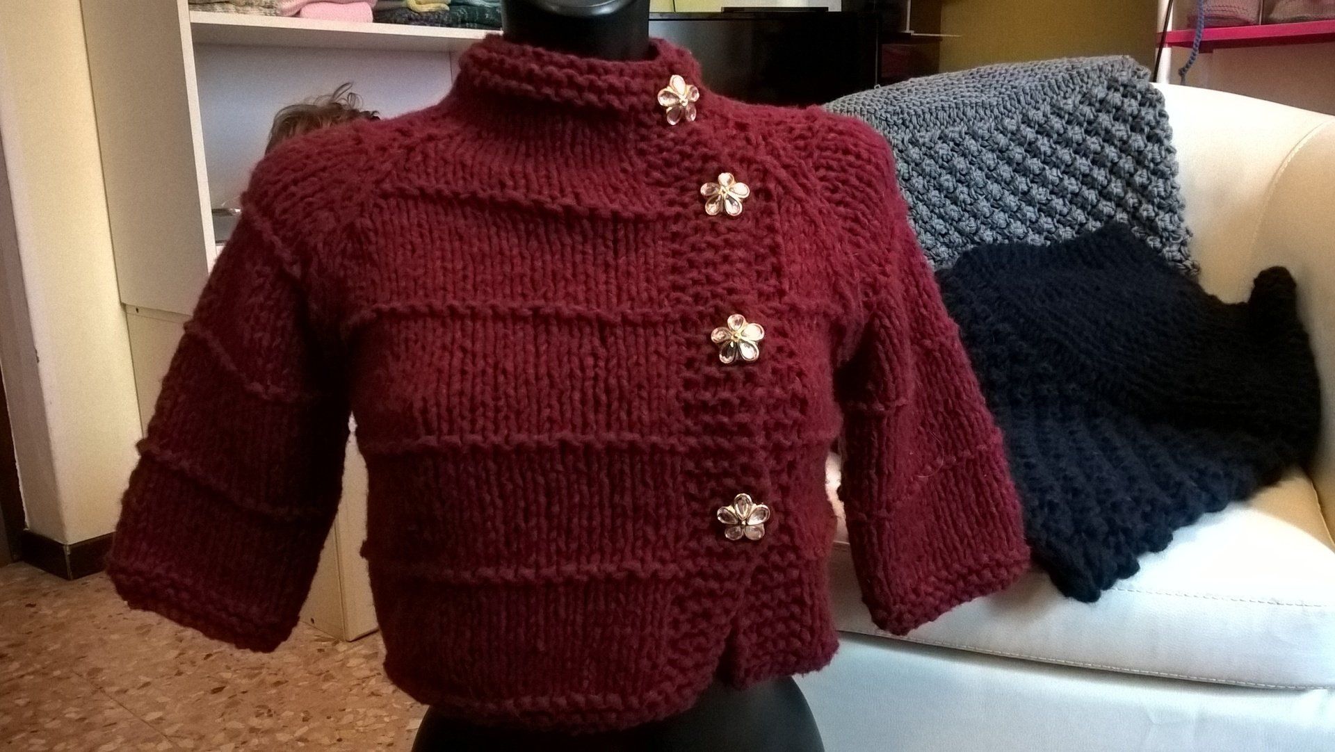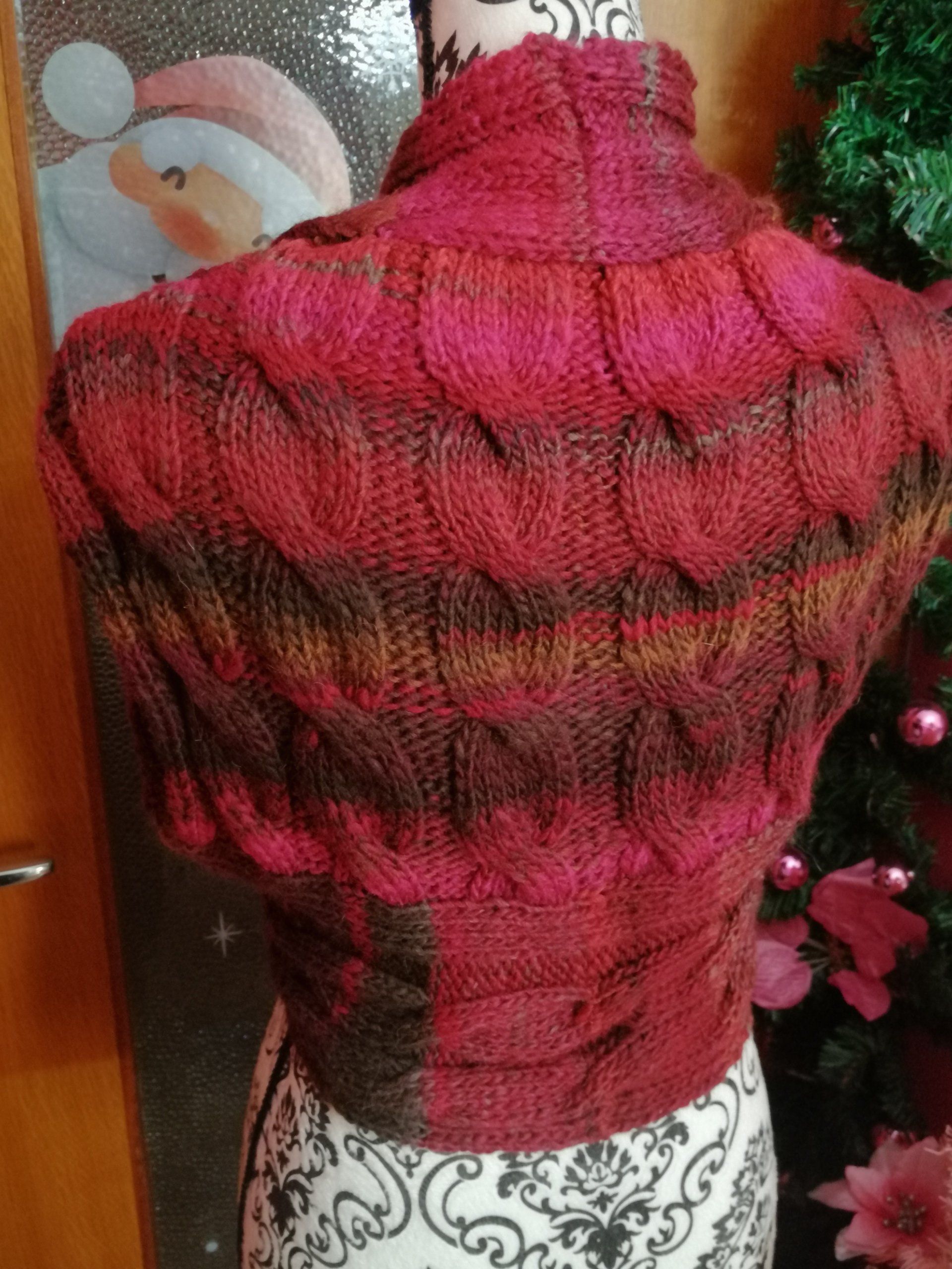 Coprispalle corto in lana a un bottone, realizzato ai ferri con motivo a trecce grosse
