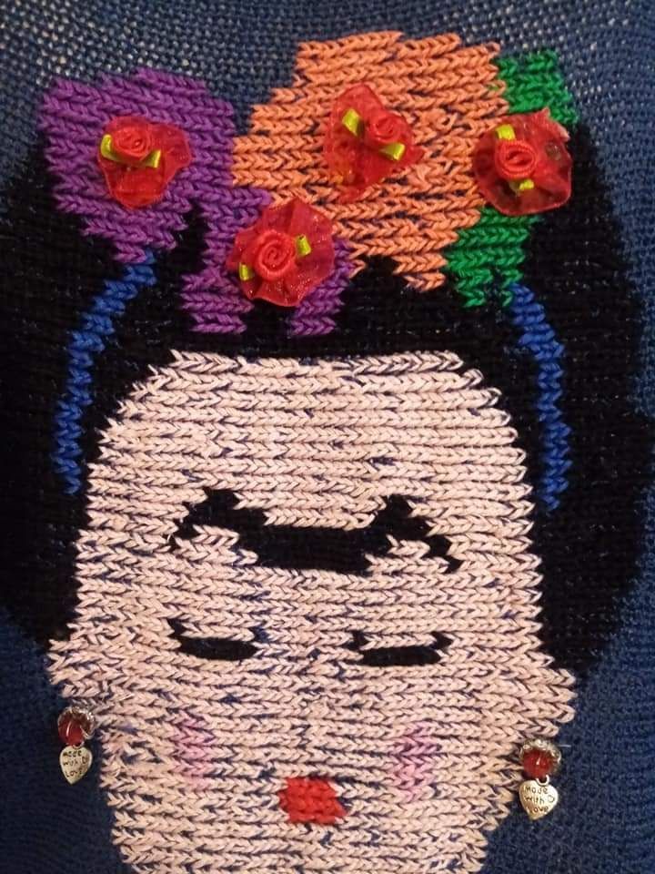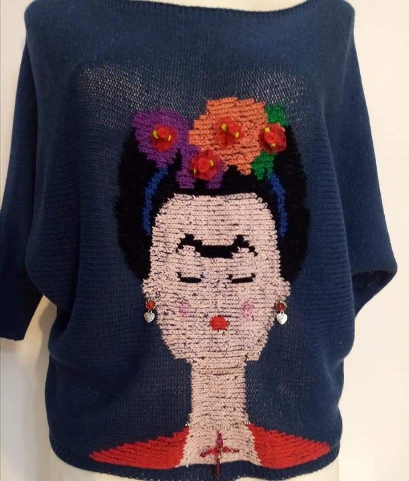 ButtonMaglia Frida lavorata da manica a manicaa paglia rasata , ricamo Frida Kahlo eseguito a punto maglia rifinita con applicazioni per impresiosirne l'aspetto