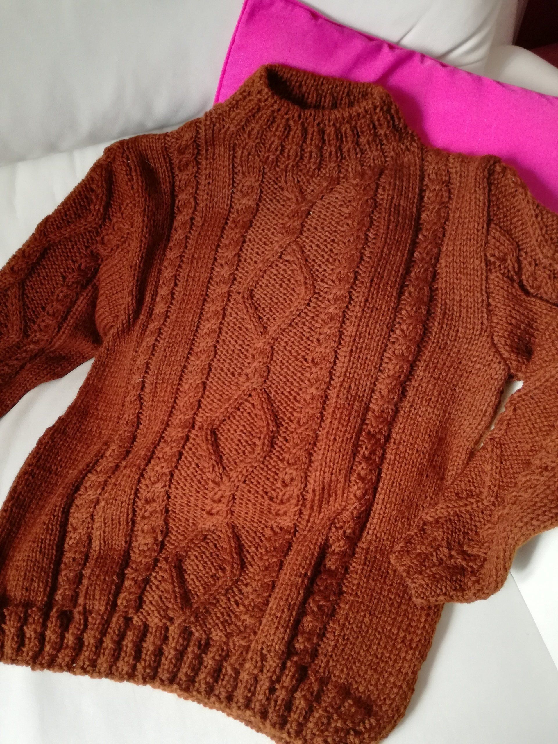 ButtonMaglia girocollo in lana realizzata ai ferri, motivo rombi e trecce.