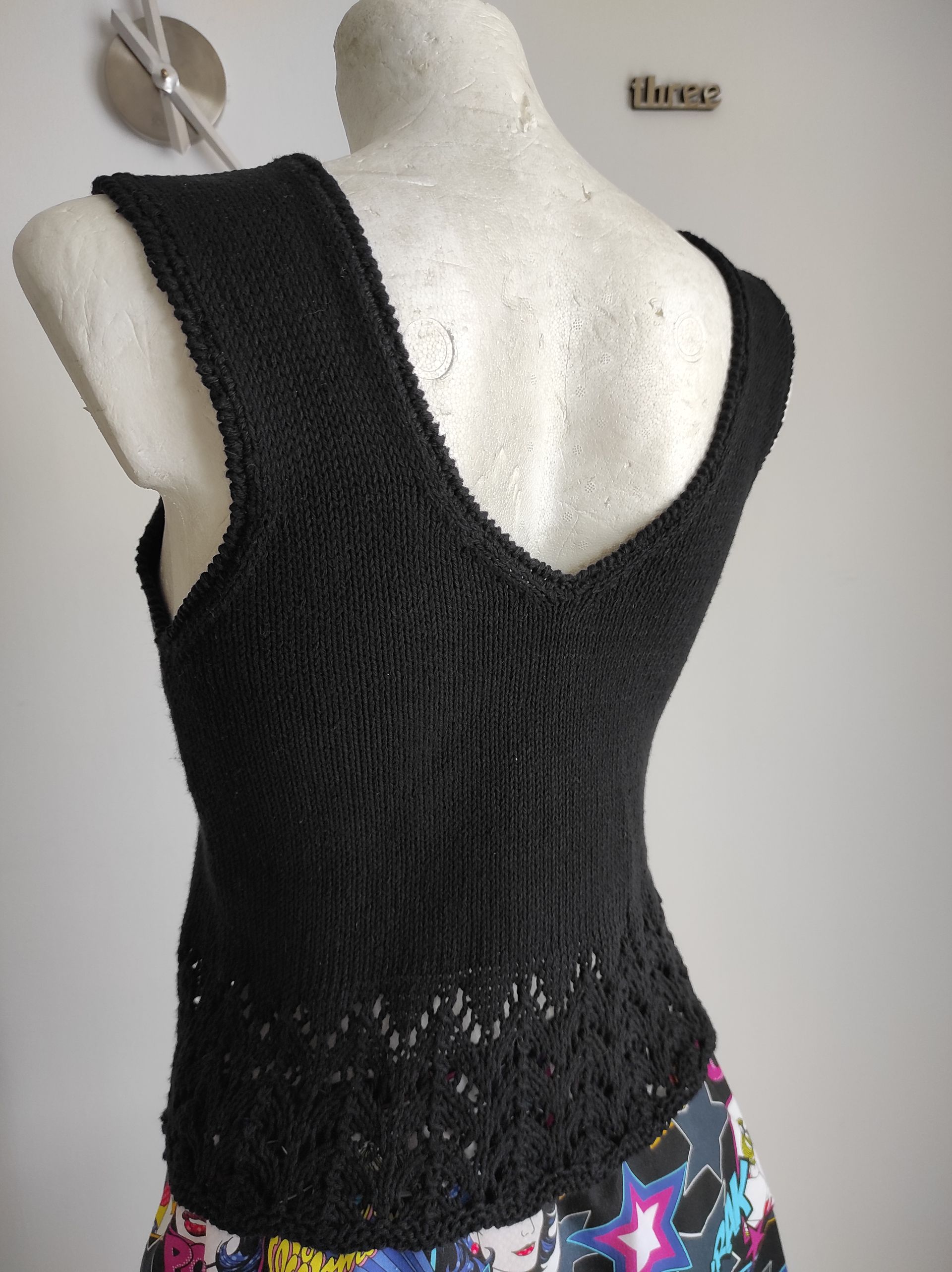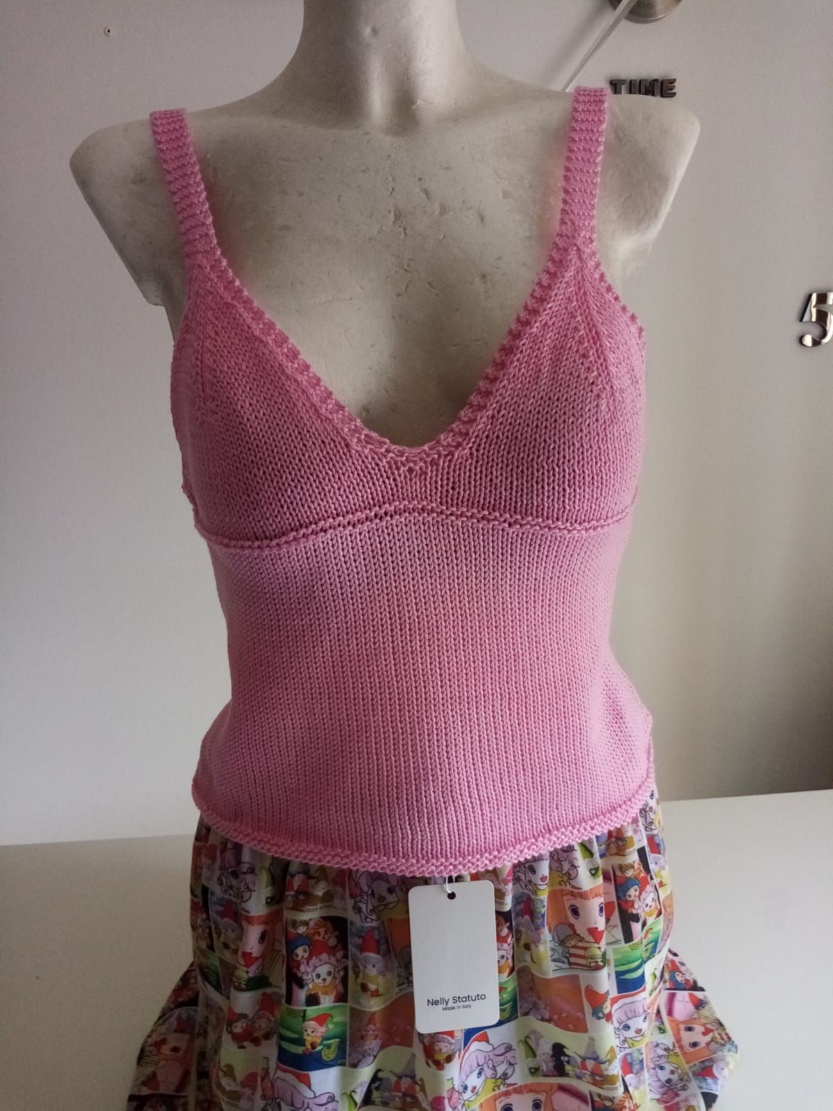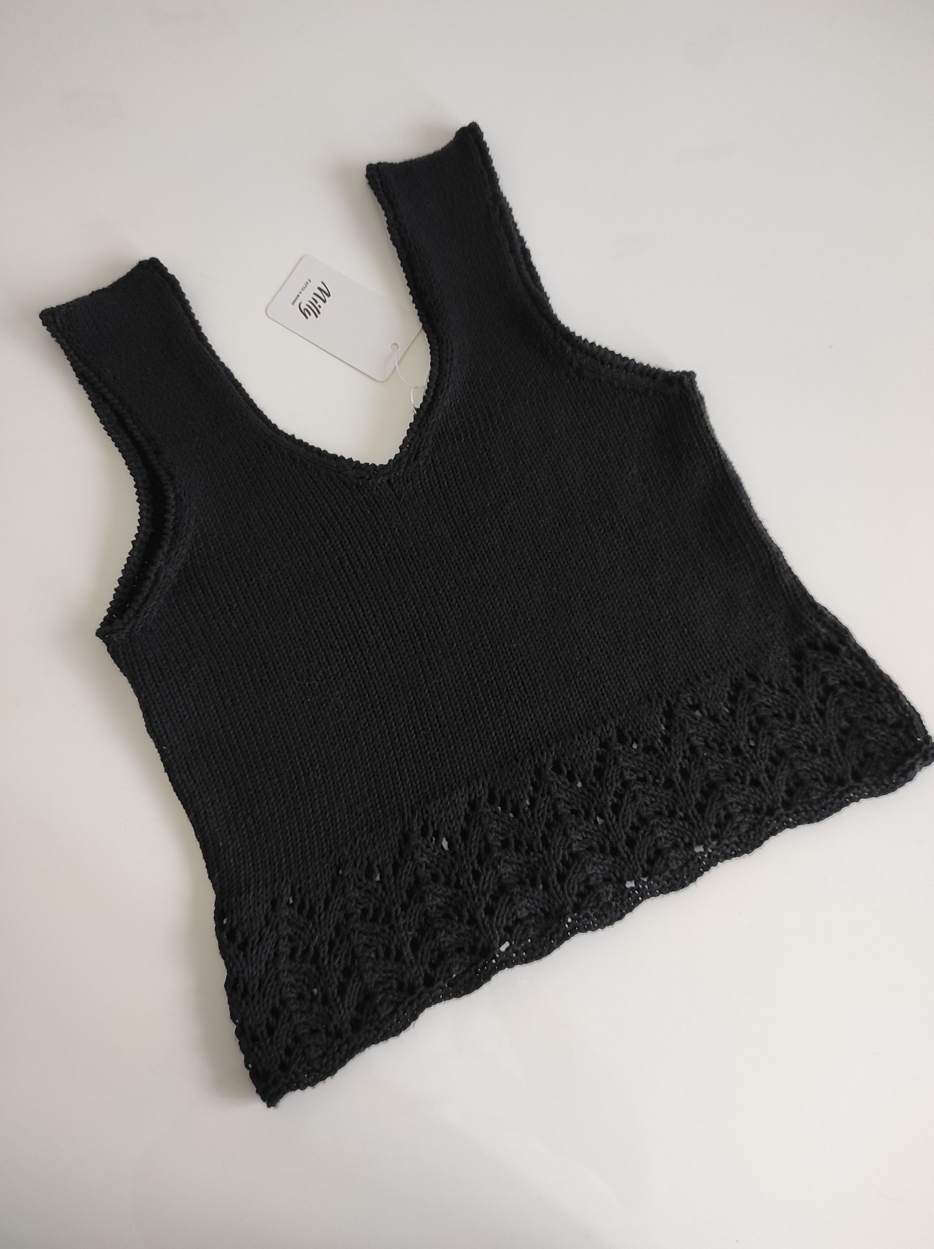 ButtonCanotta corta a spallina larga in filato di cotone e seta, realizzata a macchina con bordo ripreso ai ferri e lavorato a punto traforo, rifiniture all'uncinetto