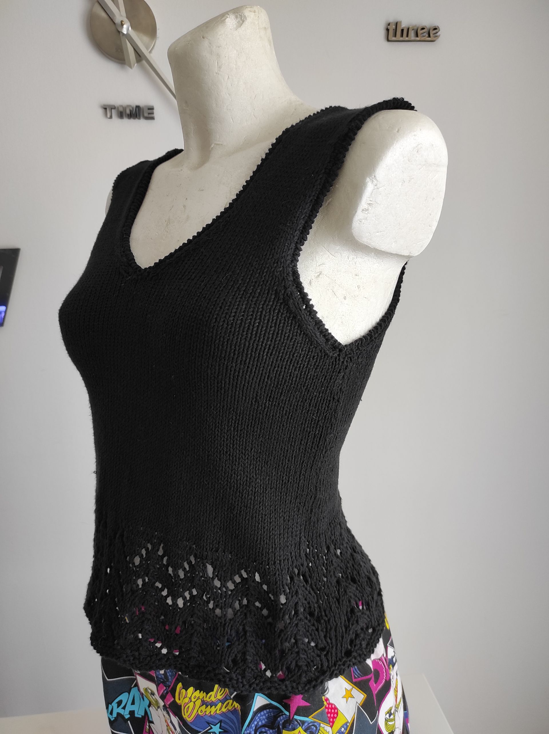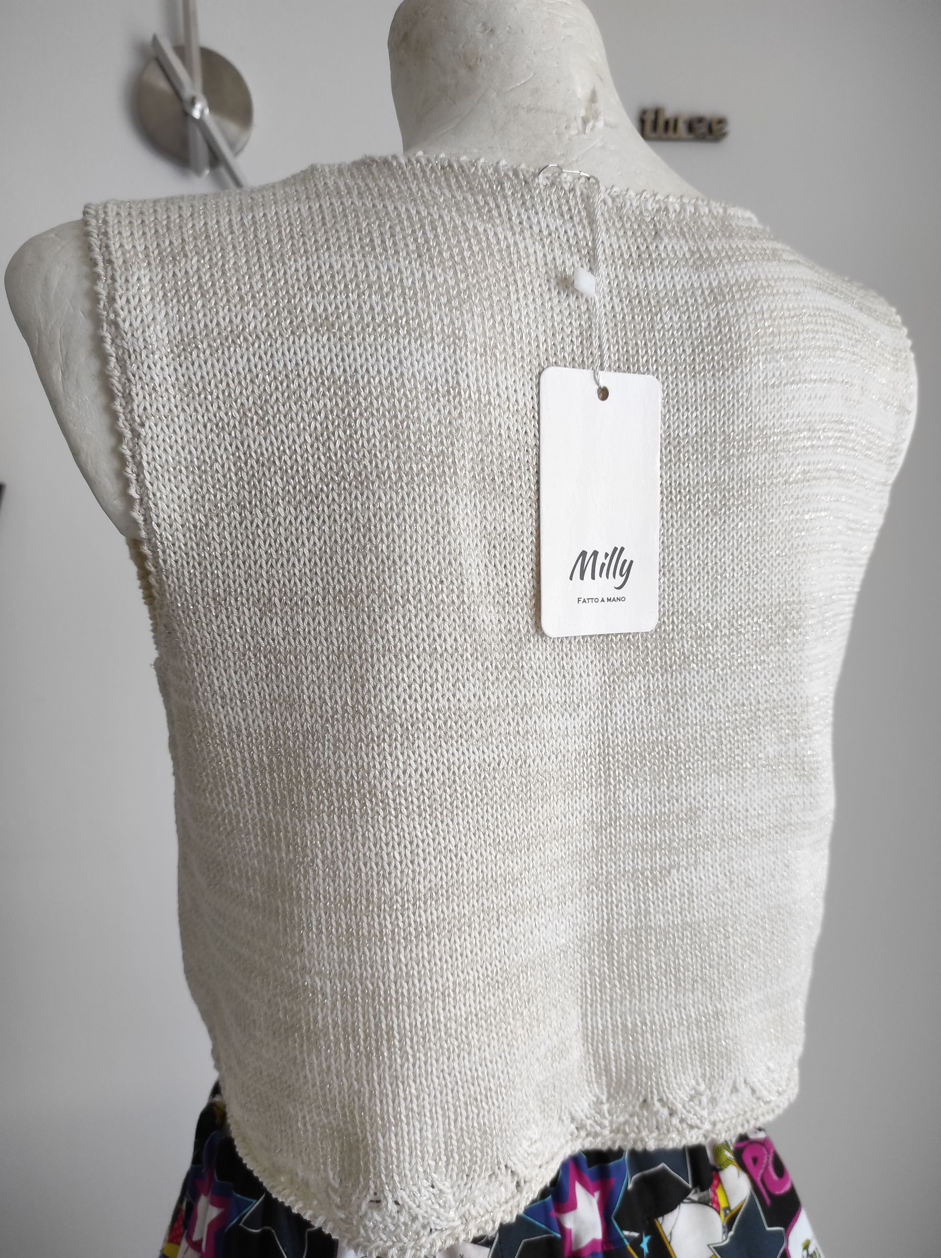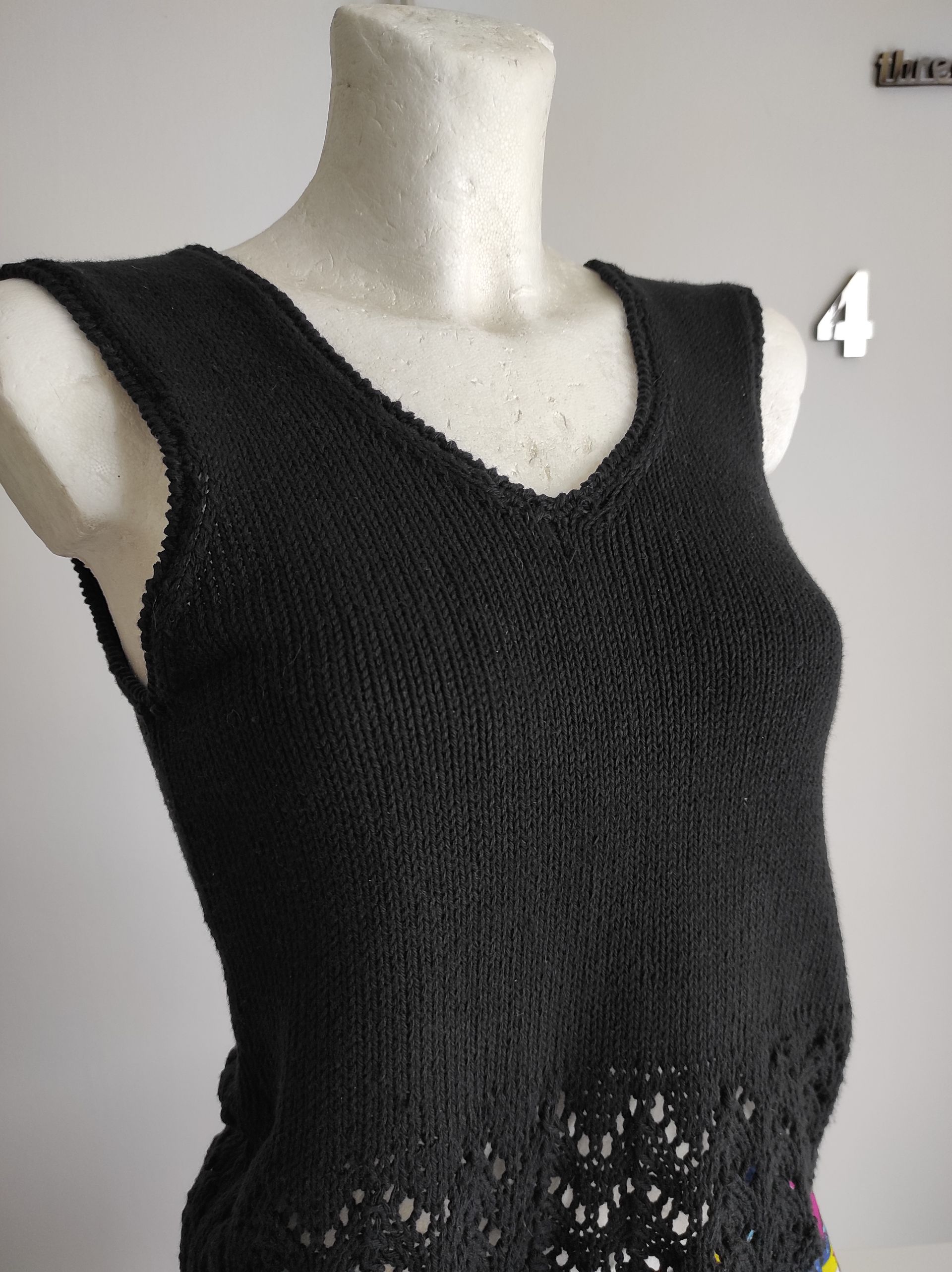 ButtonCanotta corta a spallina larga in filato di cotone e seta, realizzata a macchina con bordo ripreso ai ferri e lavorato a punto traforo, rifiniture all'uncinetto