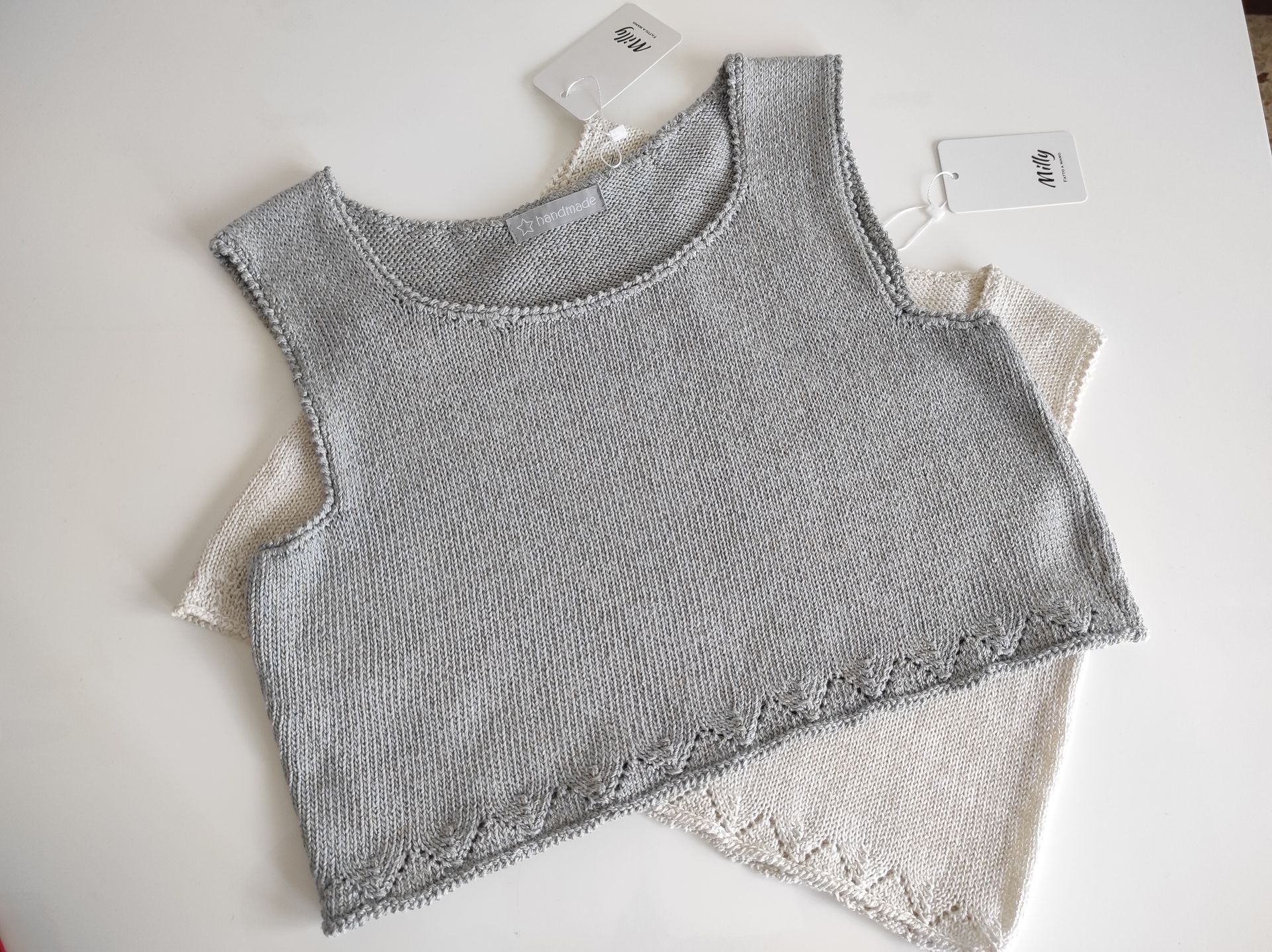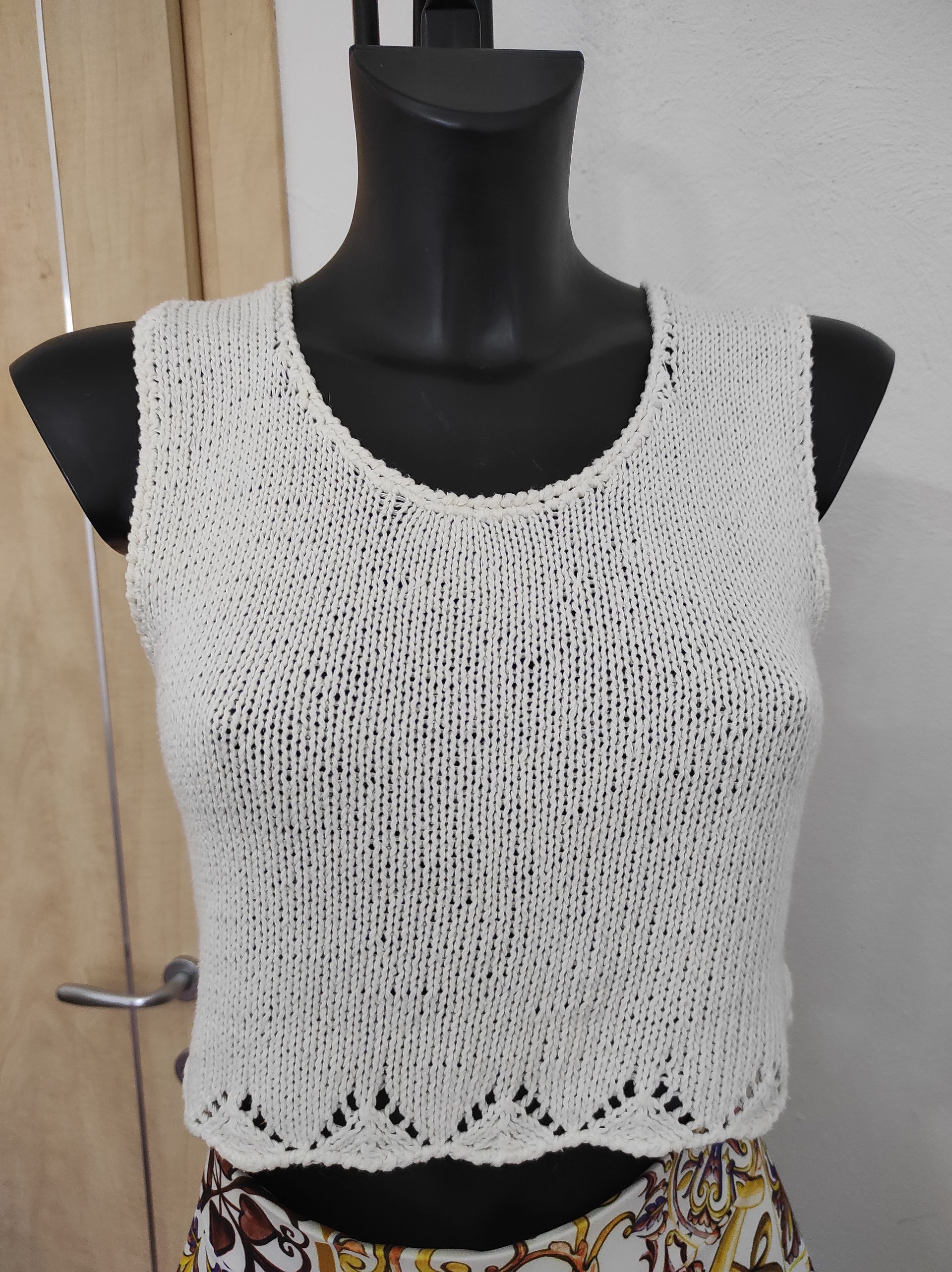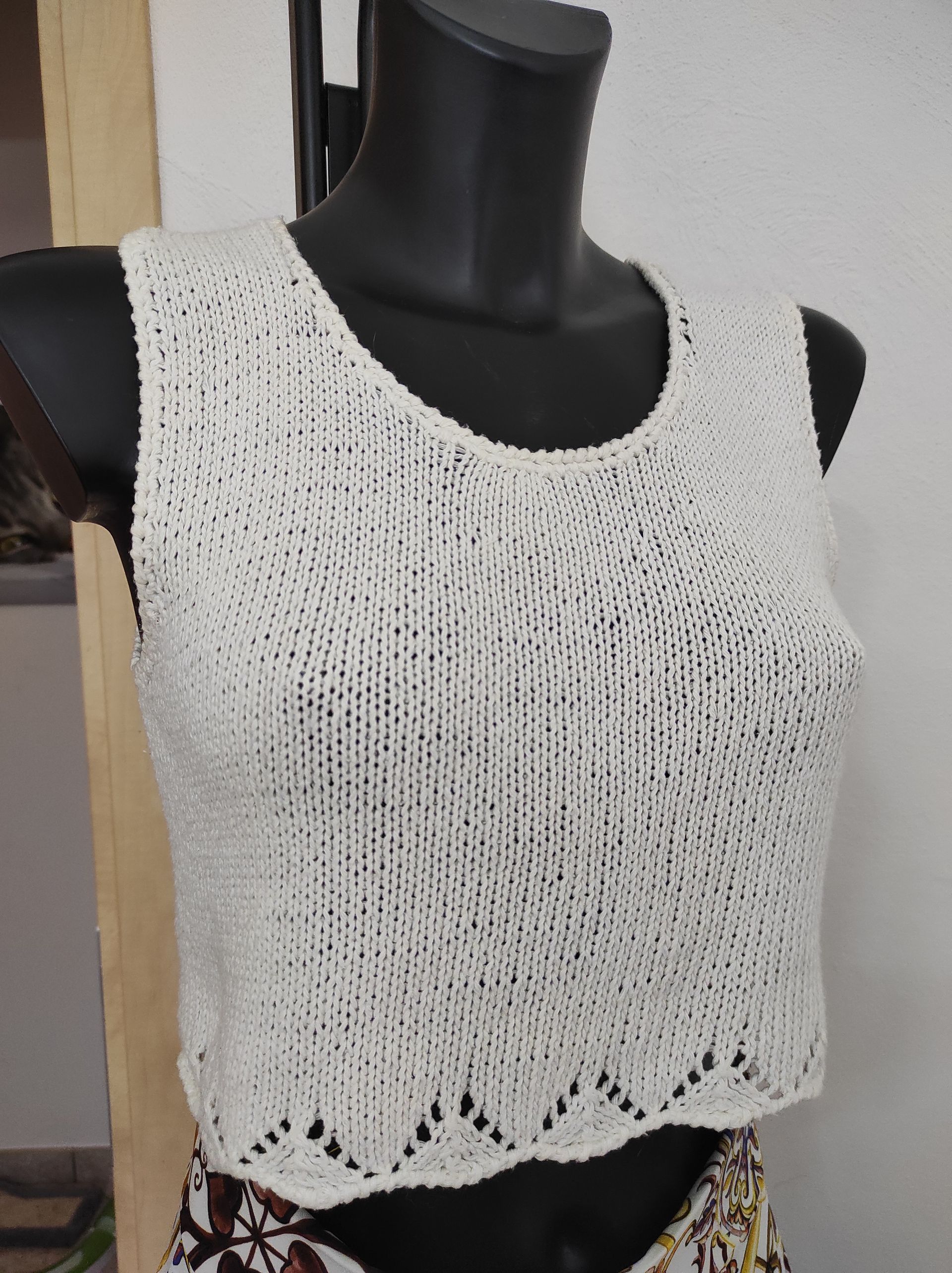 Canotta crop top a spalla larga con scollo a giro e motivo traforo a ventaglio sul fondo, realizzato ai ferri in filato di cotone