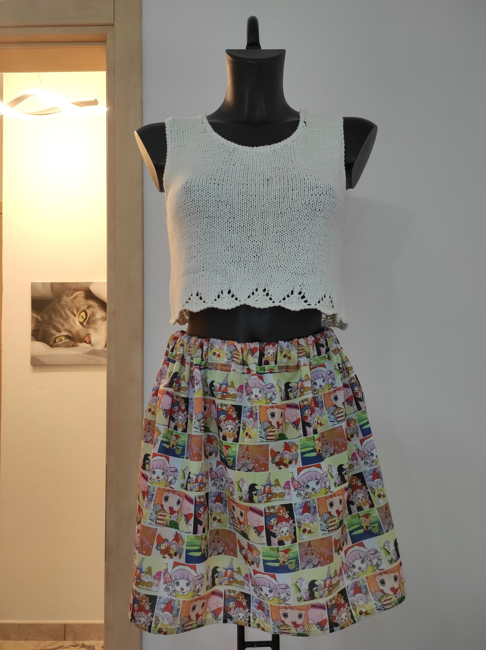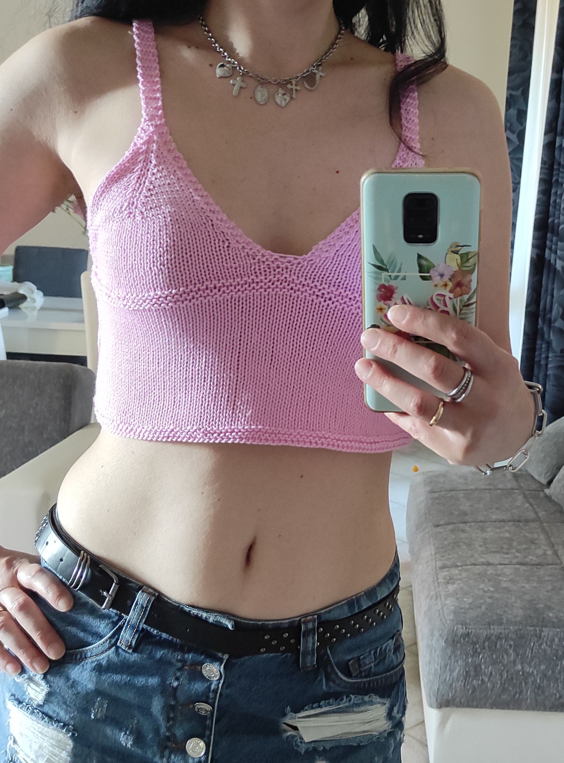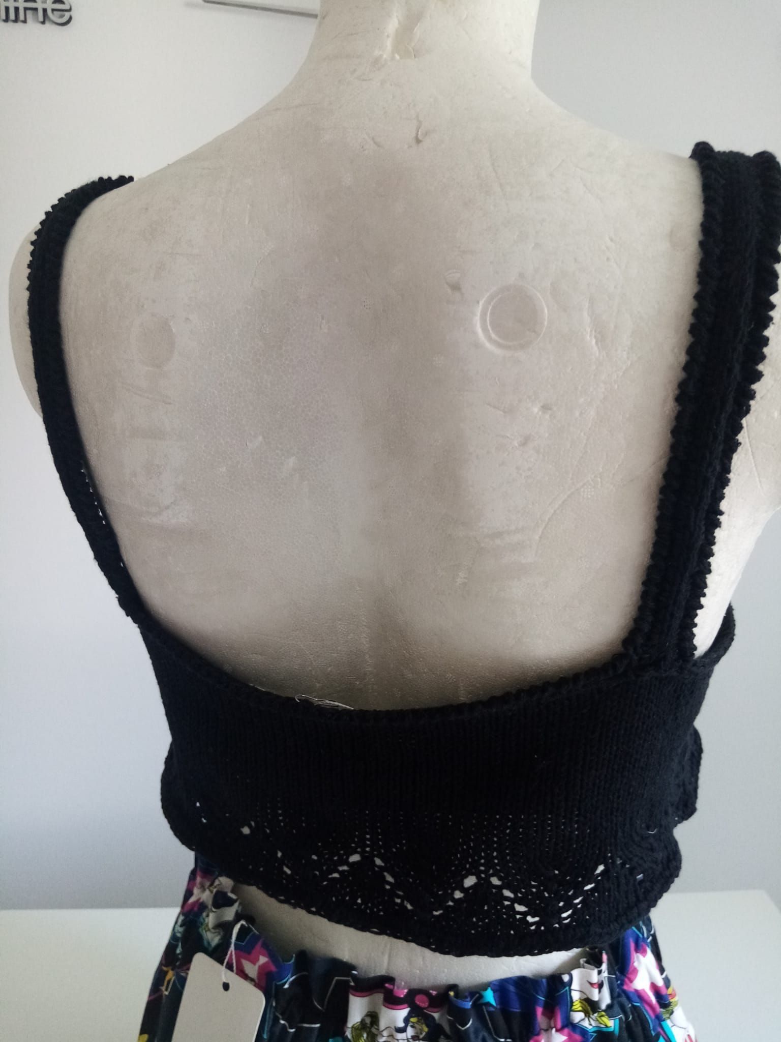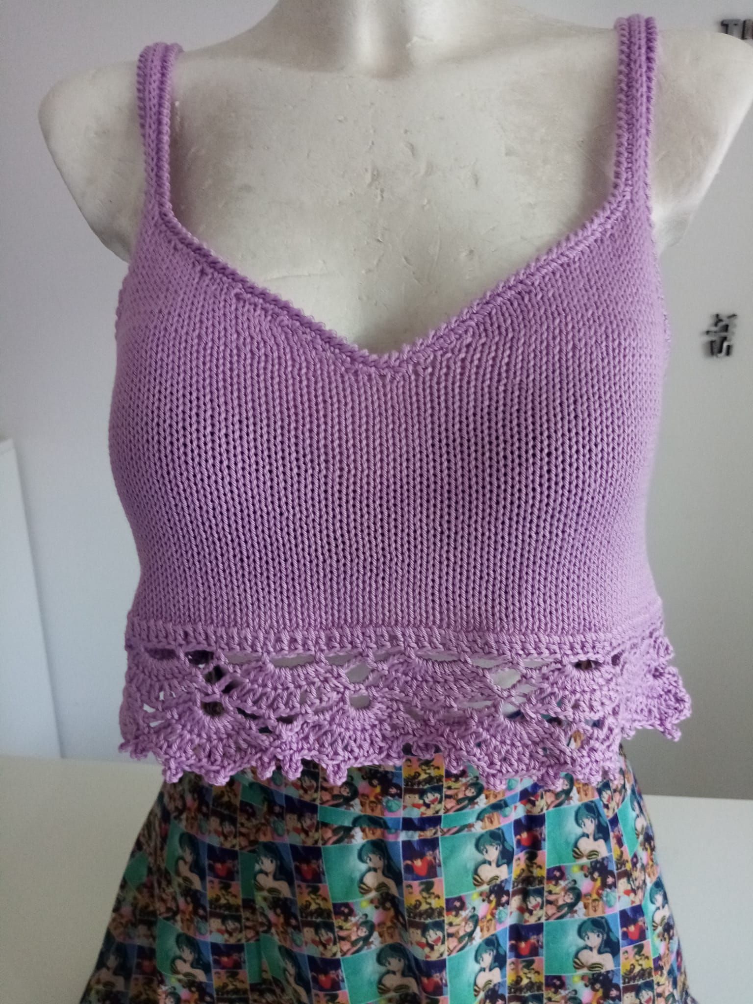 Crop top in cotone realizzato ai ferri con motivo a traforo sul fondo, spalline sottili, rifinito all'uncinetto