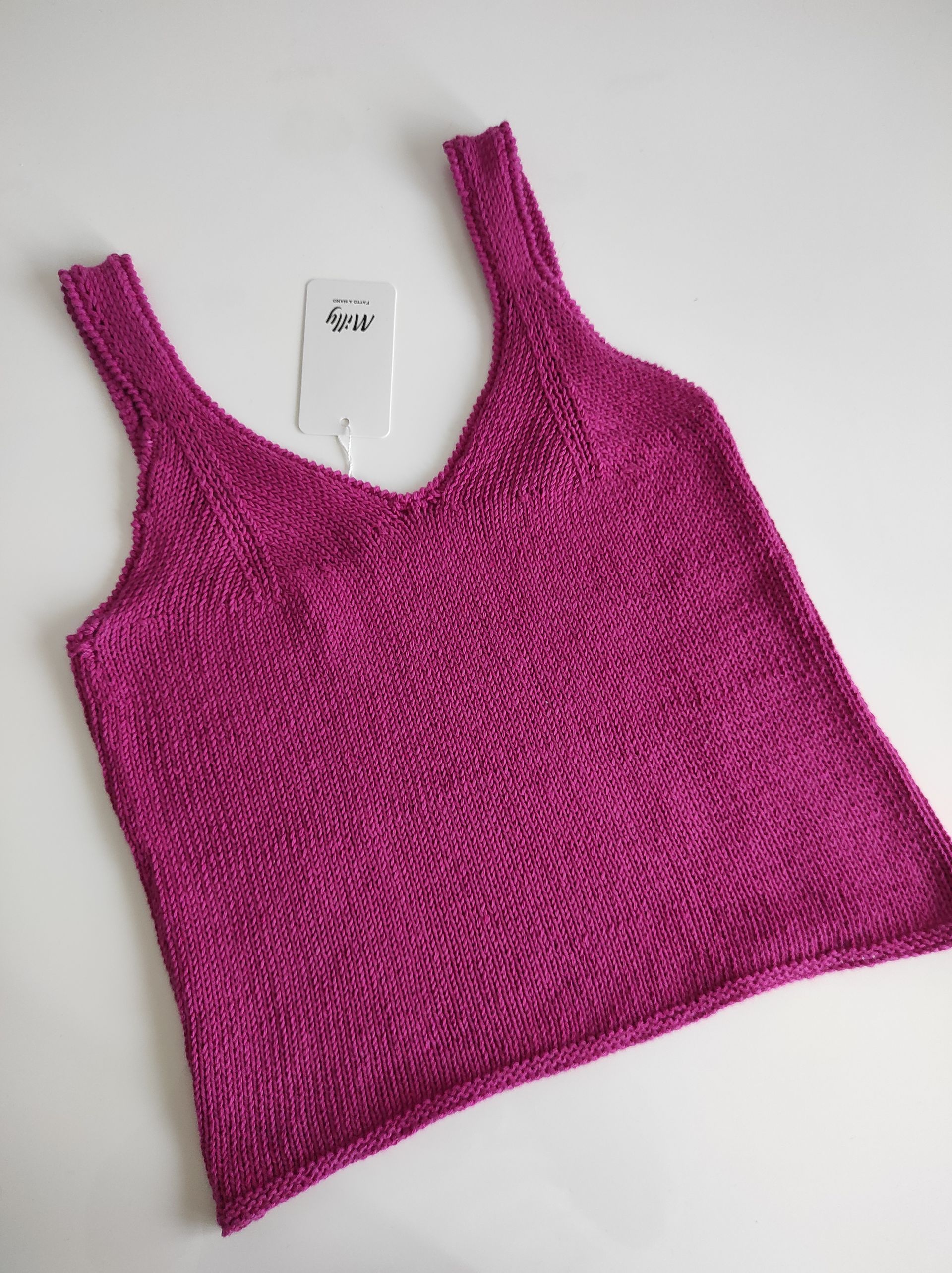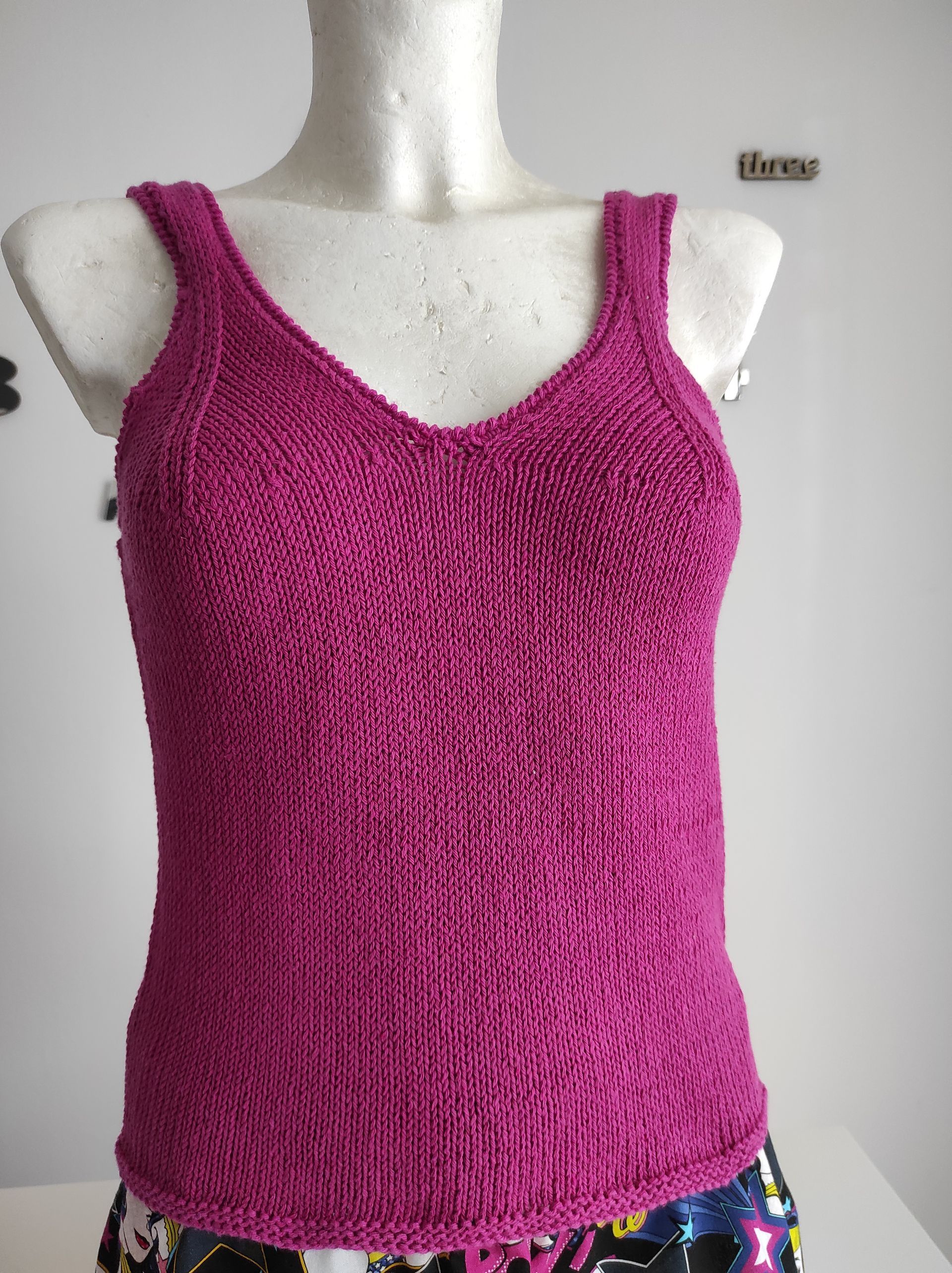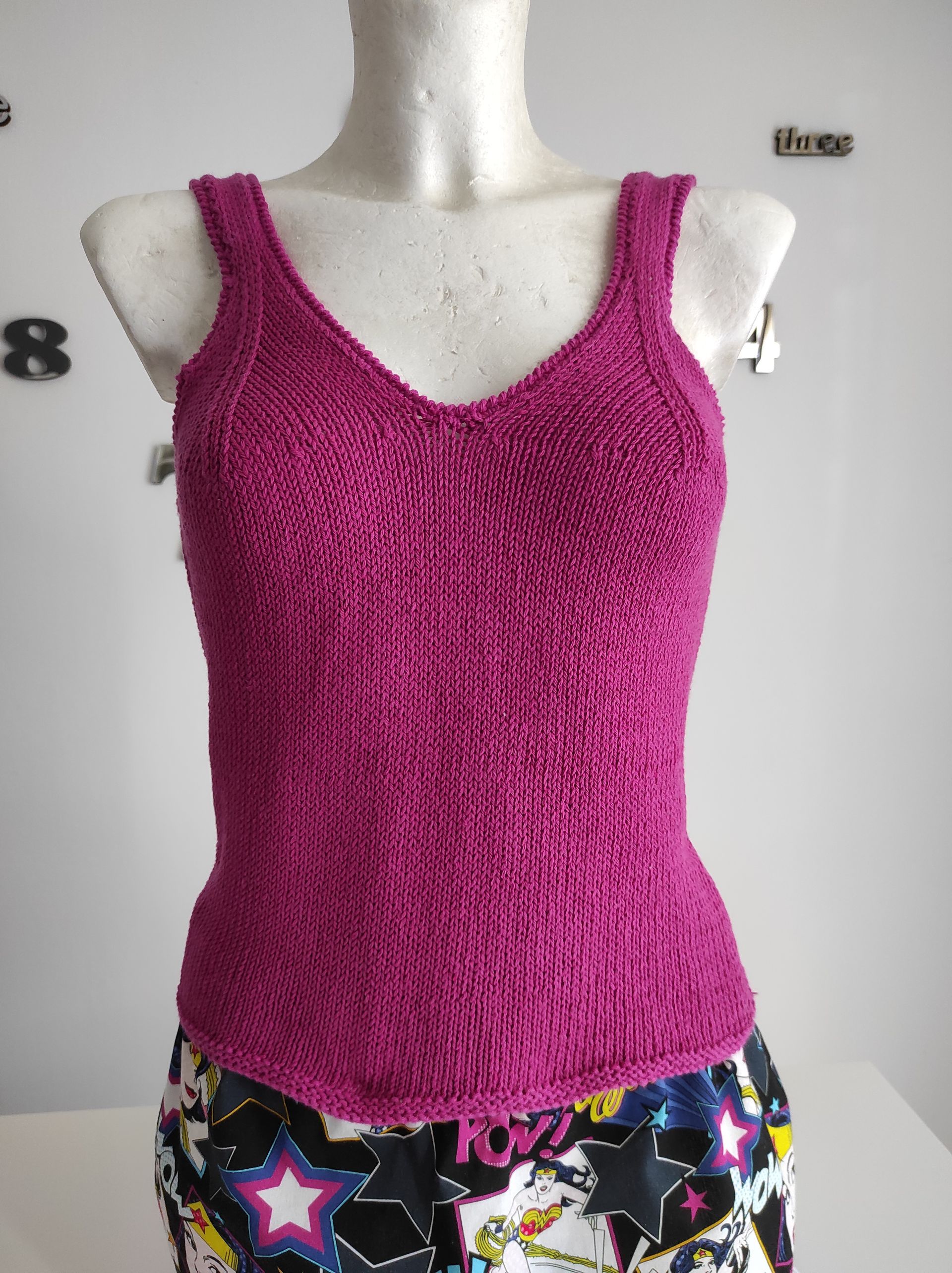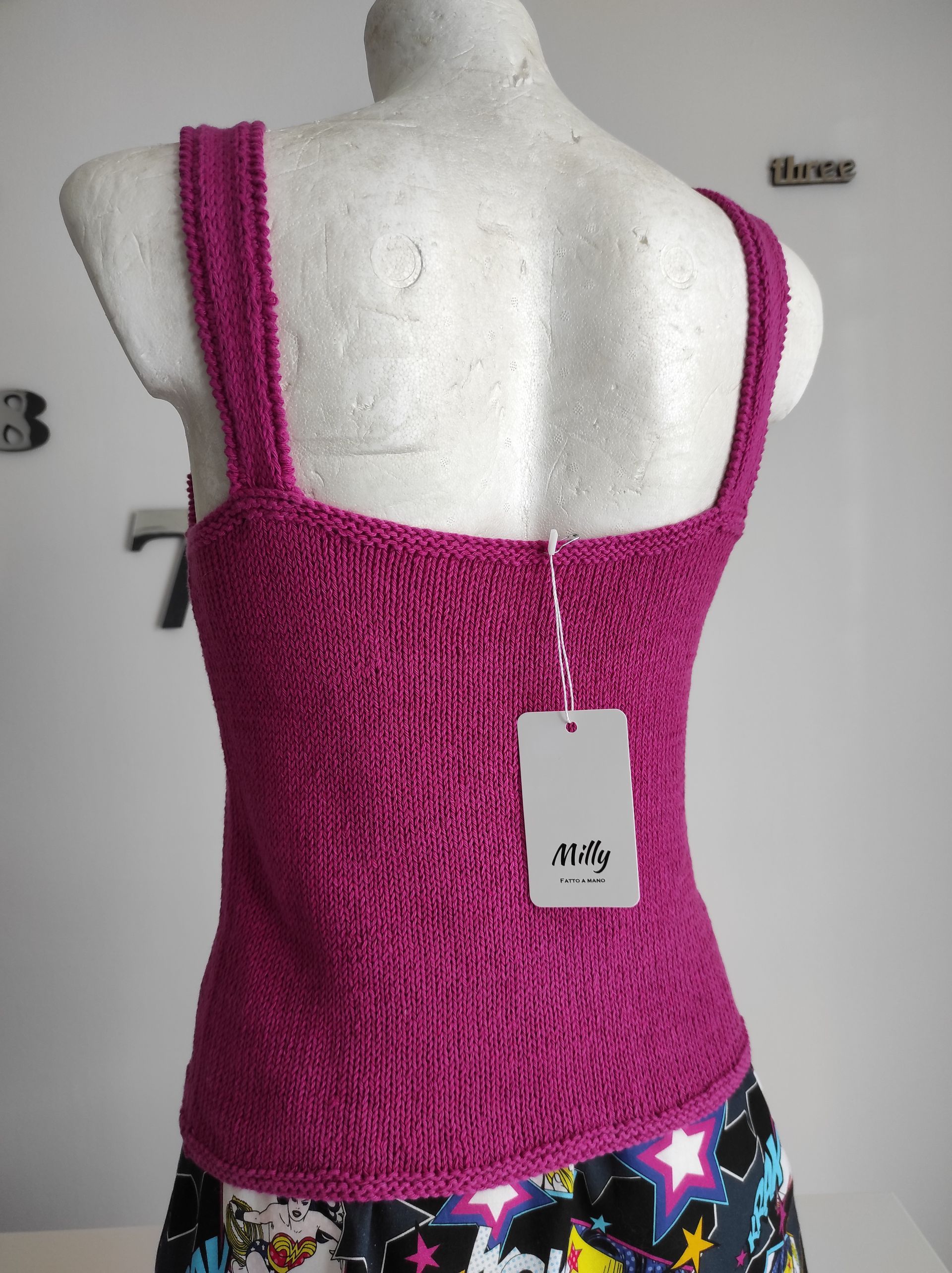 ButtonCanotta realizzata in cotone fucsia, lavorata ai ferri a maglia rasata con scollo a V , spalline sottili e schiena scoperta