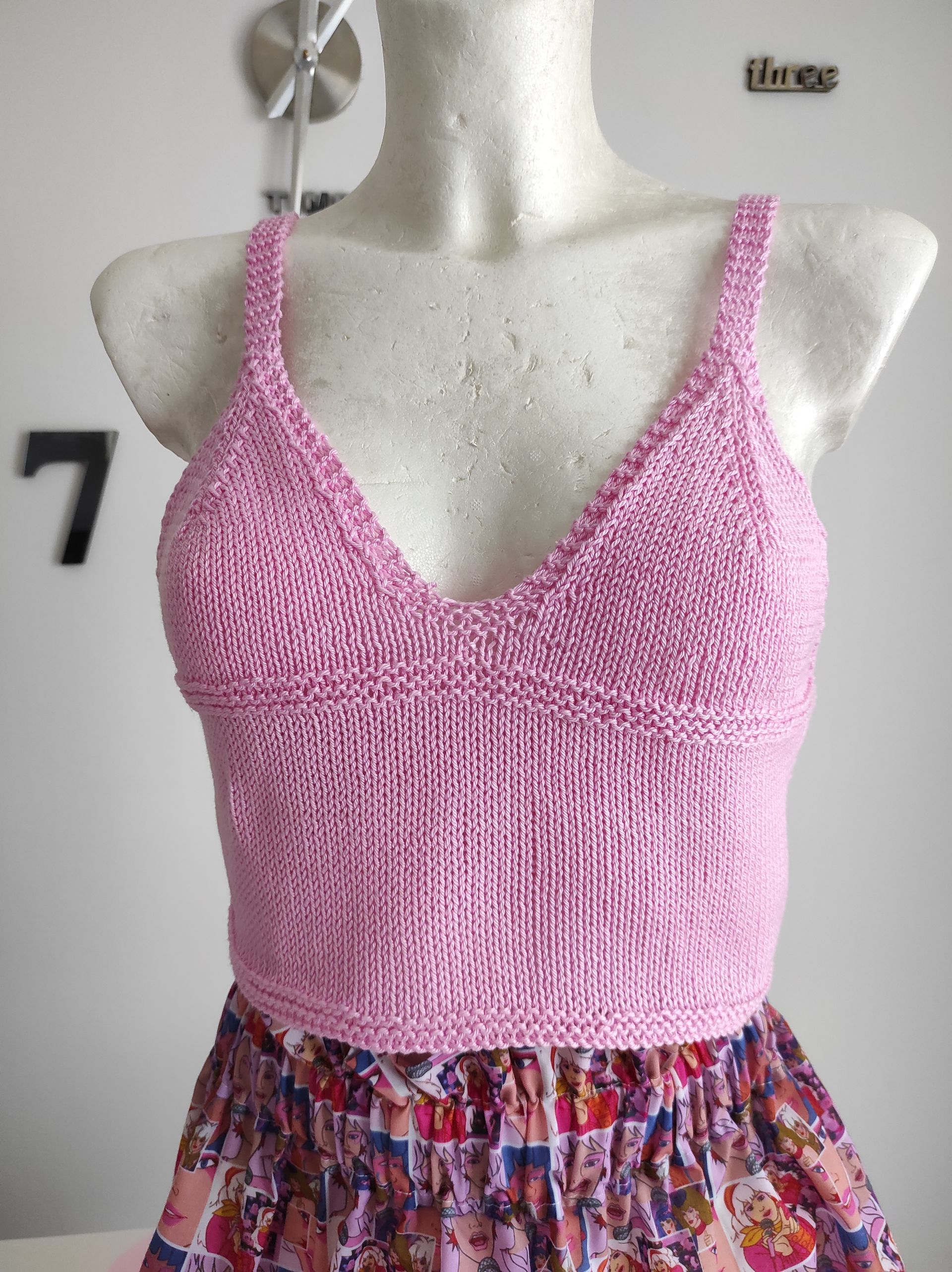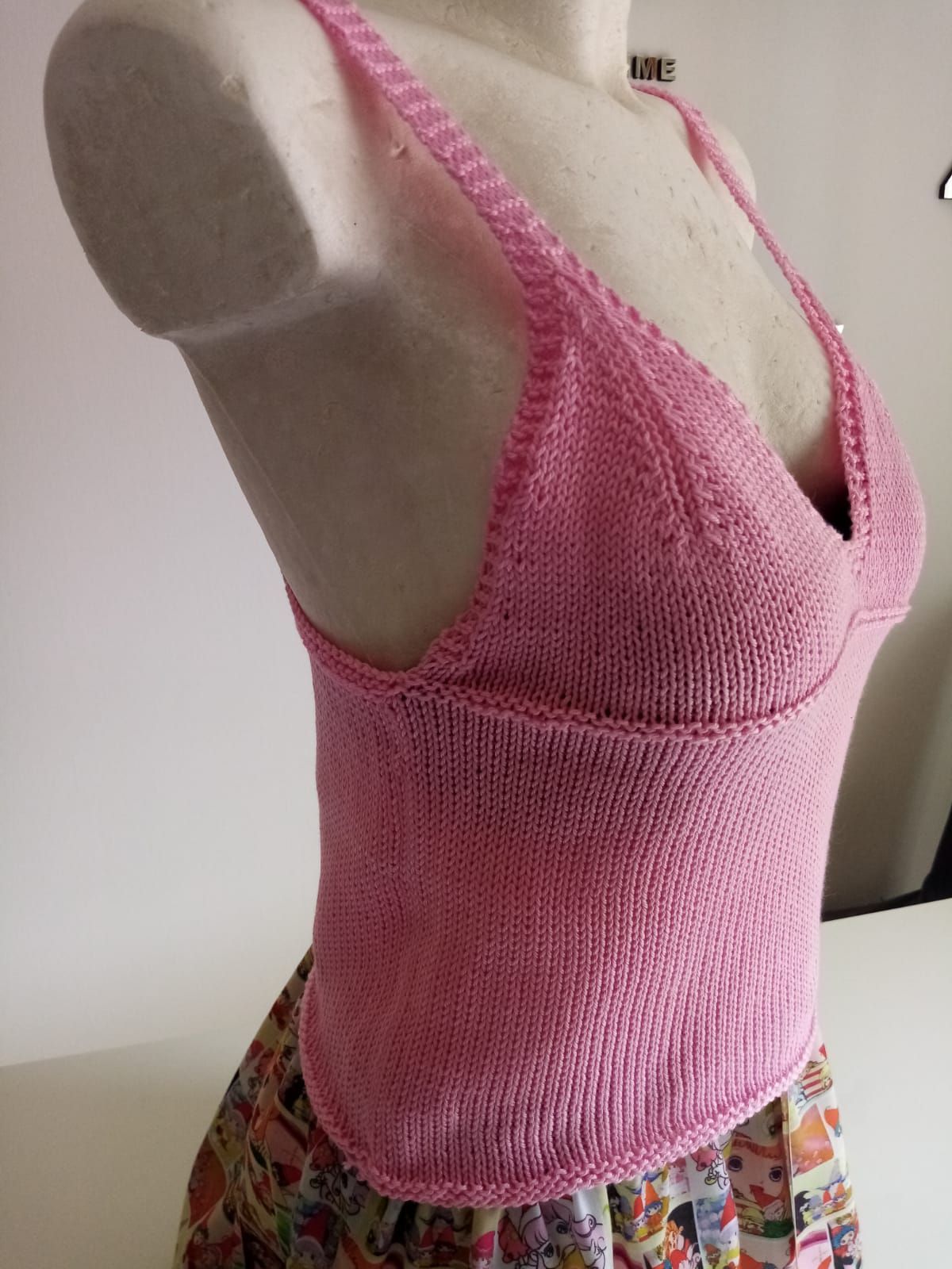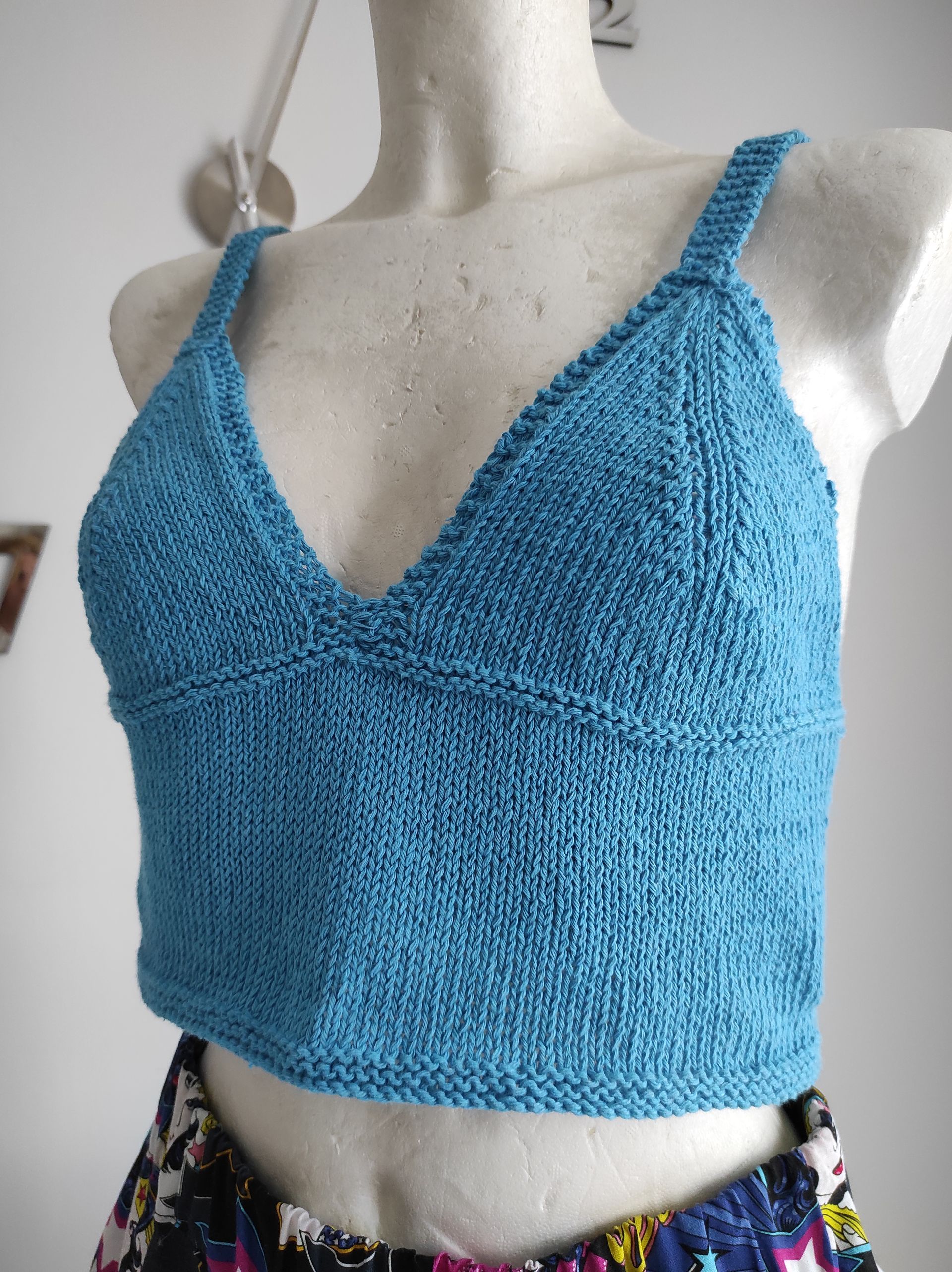 Top corto in colori moda, realizzato in cotone, lavorato ai ferri a maglia rasata, scollo a V con spalline sottili e schiena scoperta