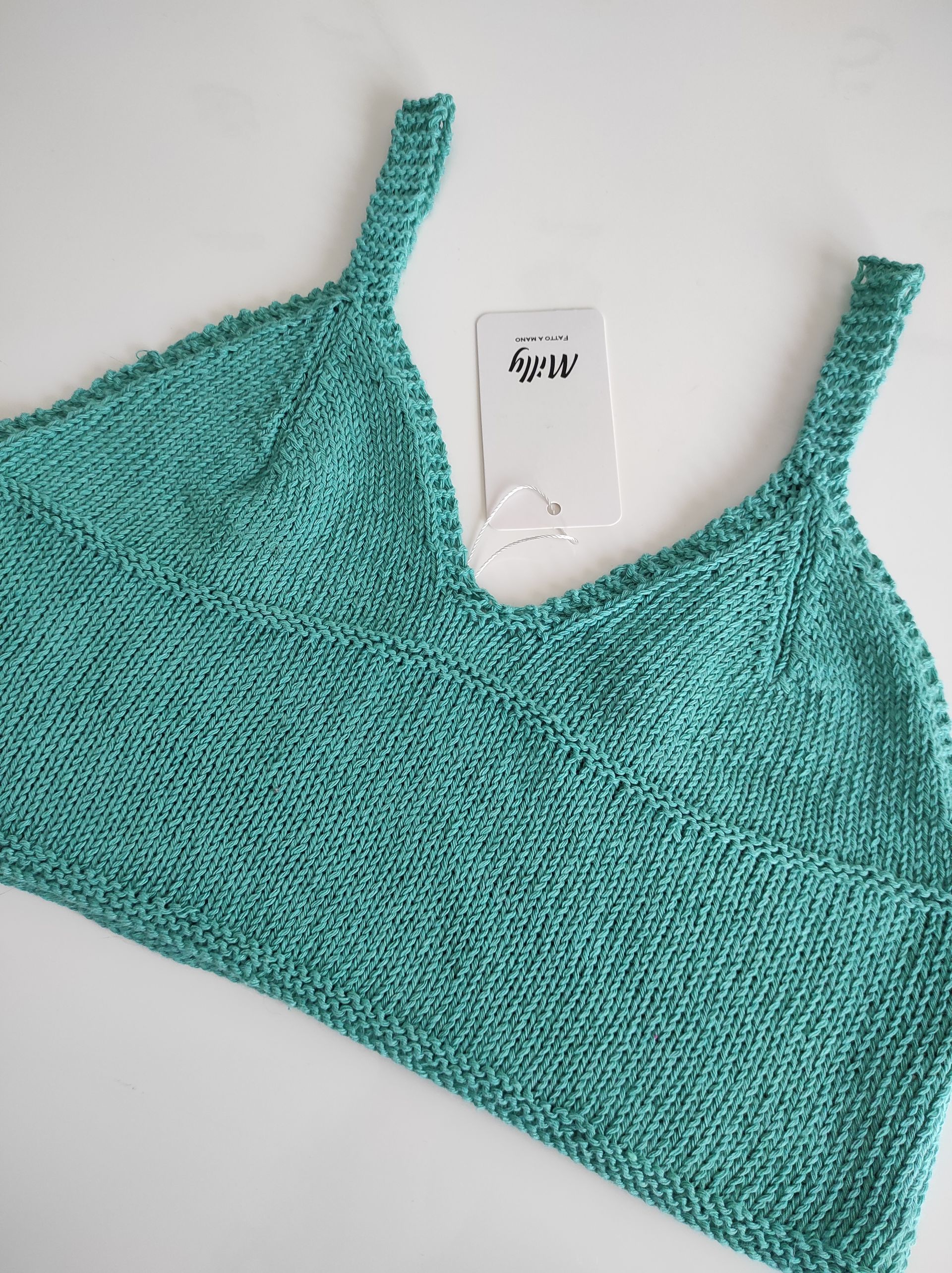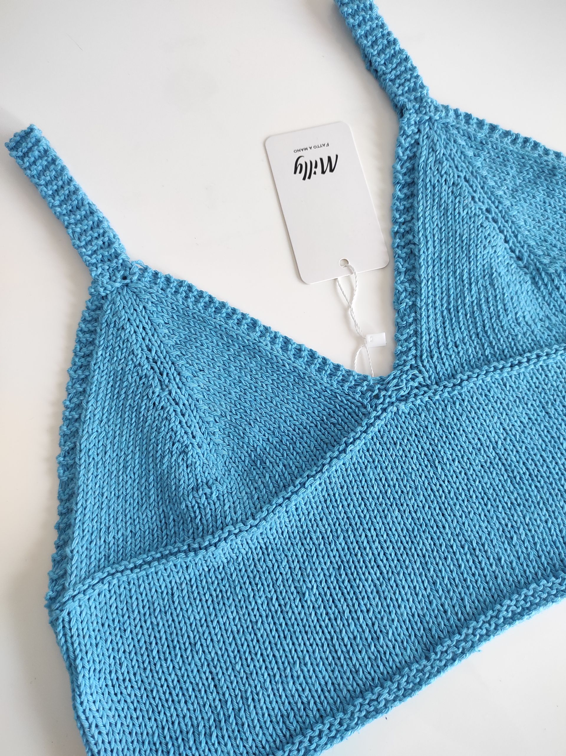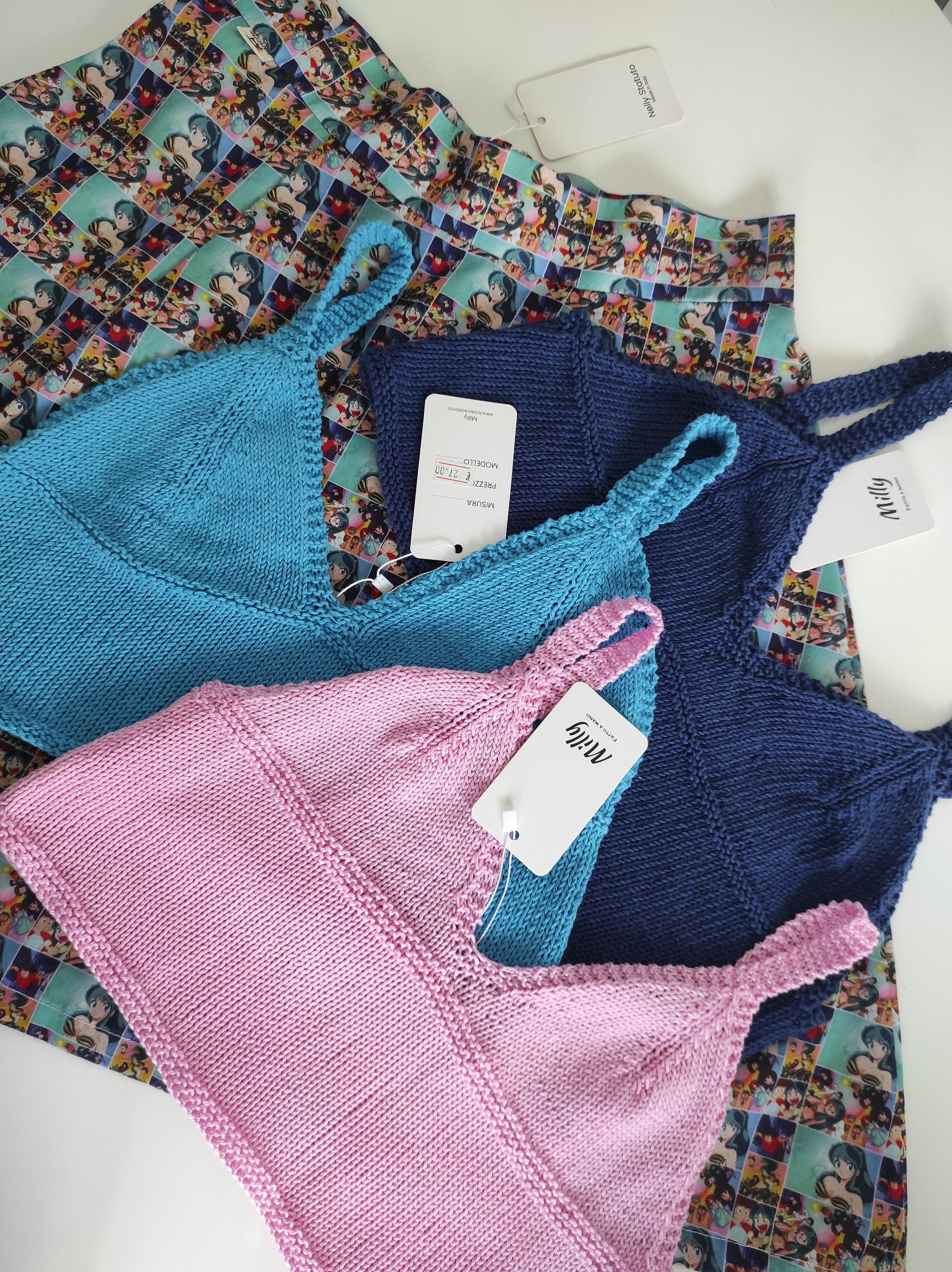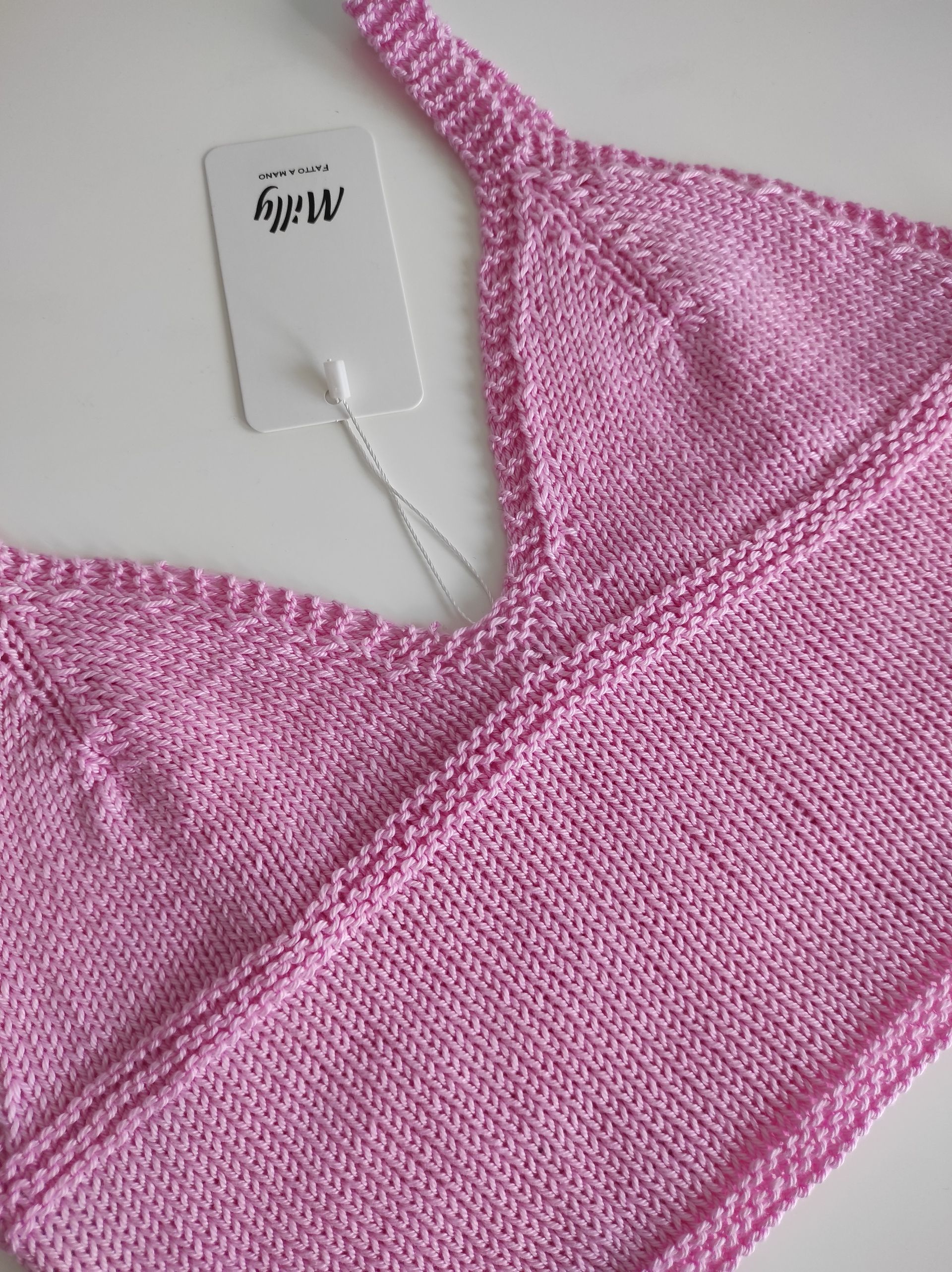 Top corto in colori moda, realizzato in cotone, lavorato ai ferri a maglia rasata, scollo a V con spalline sottili e schiena scoperta