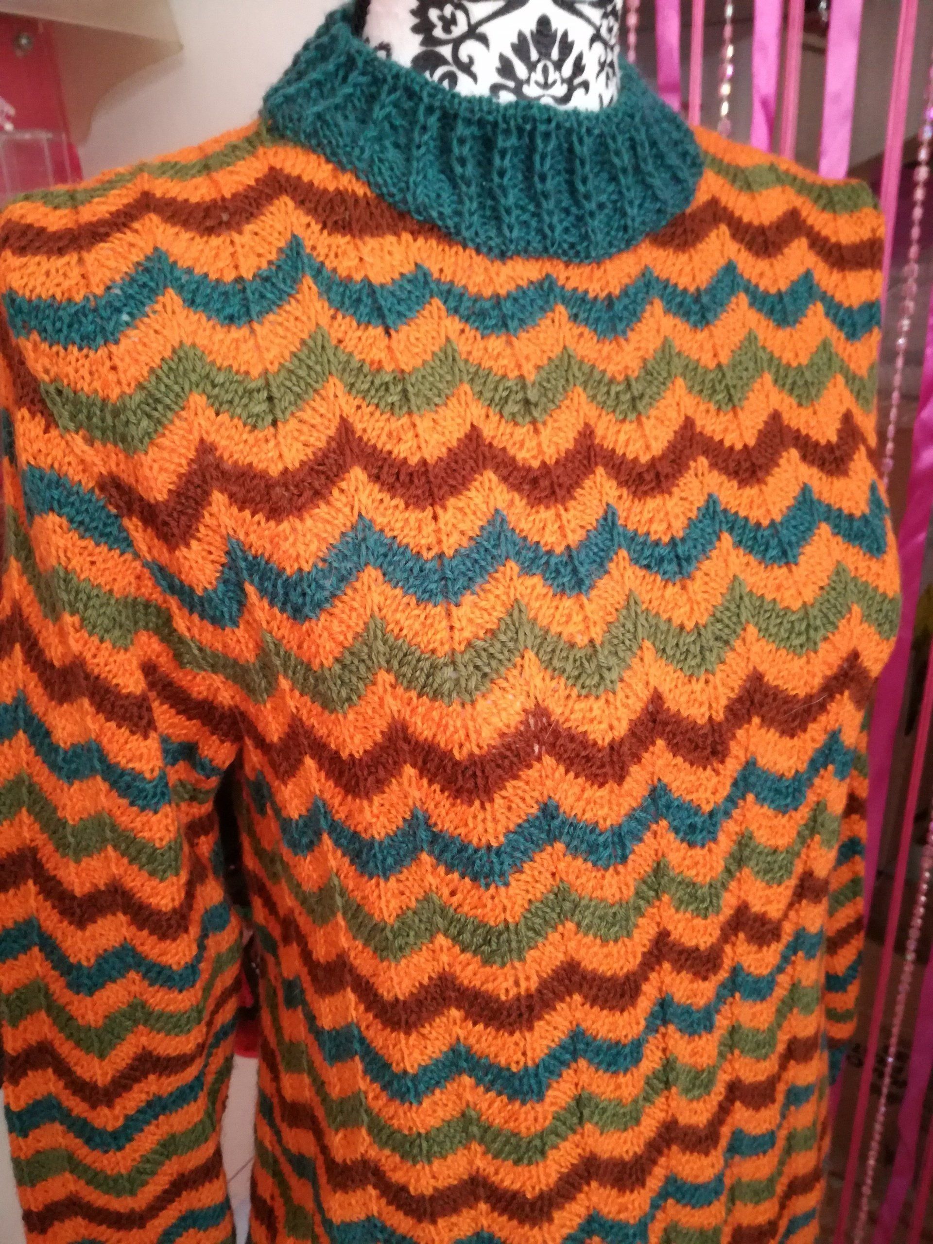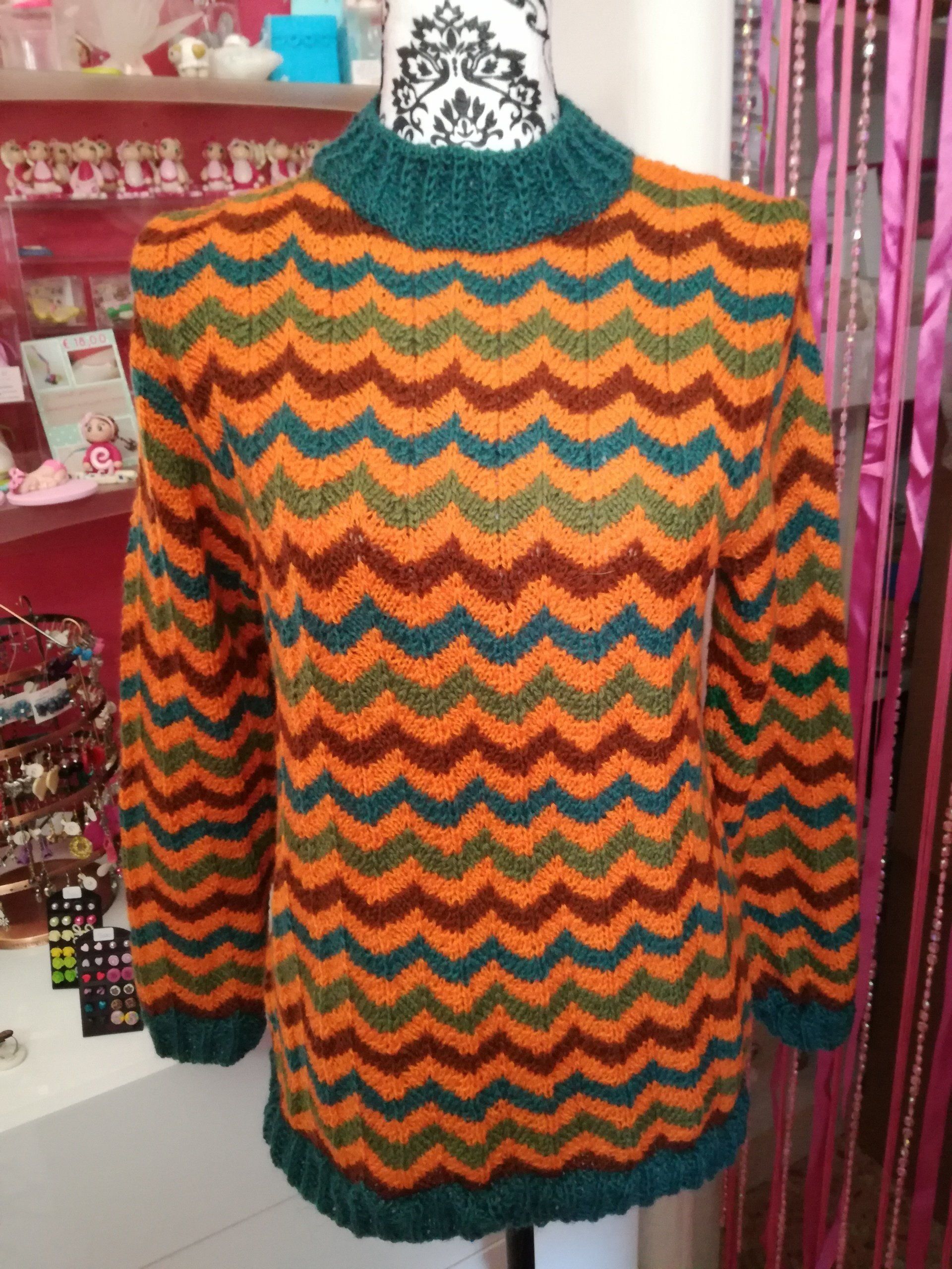ButtonMaglia girocollo in lana realizzata ai ferri, motivo a onde multicolore.