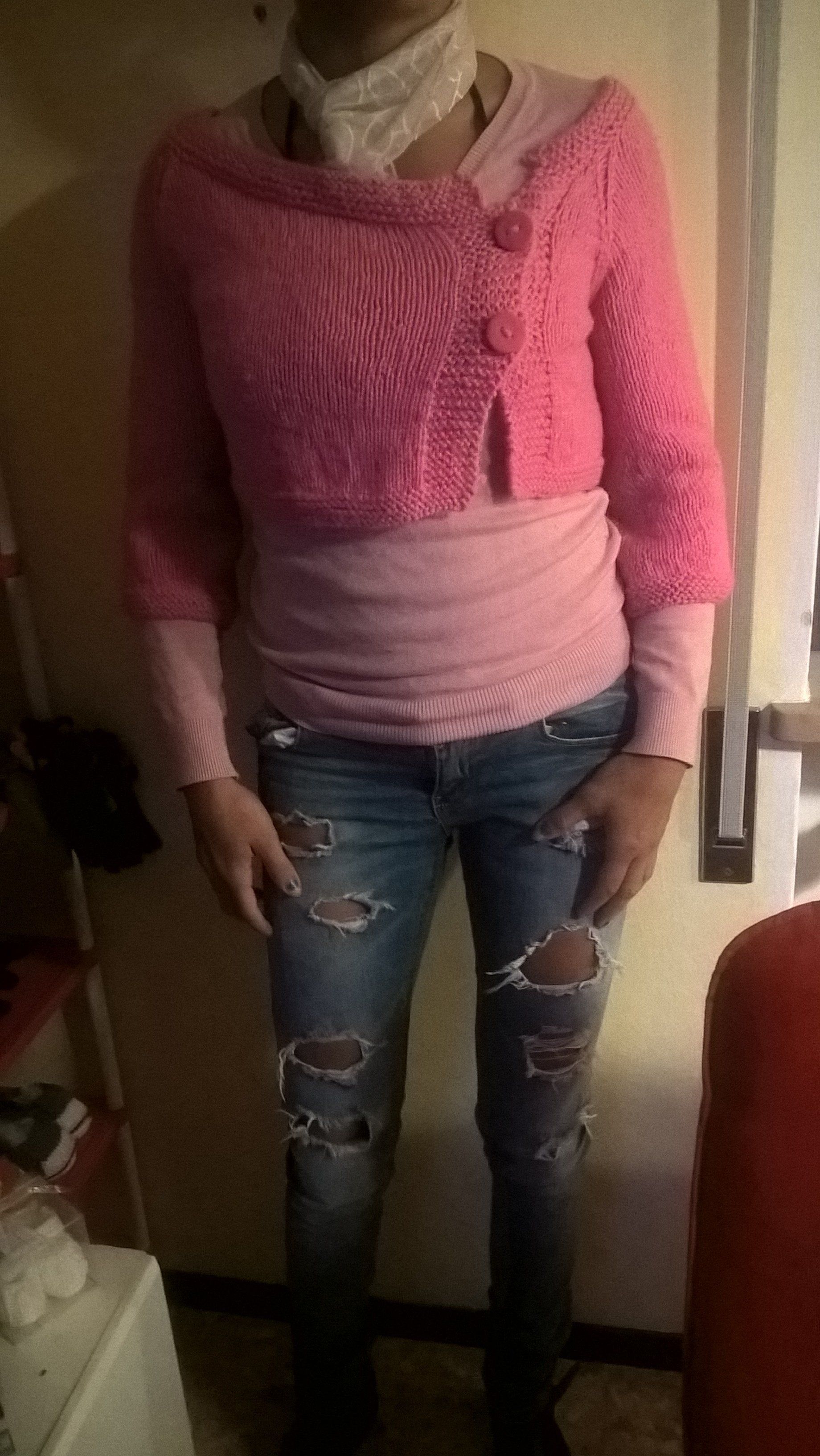 ButtonScaldacuore crop top a girocollo e manica raglan a 3/4 con bottoni gioiello spostati, realizzato ai ferri con morbida lana grossa