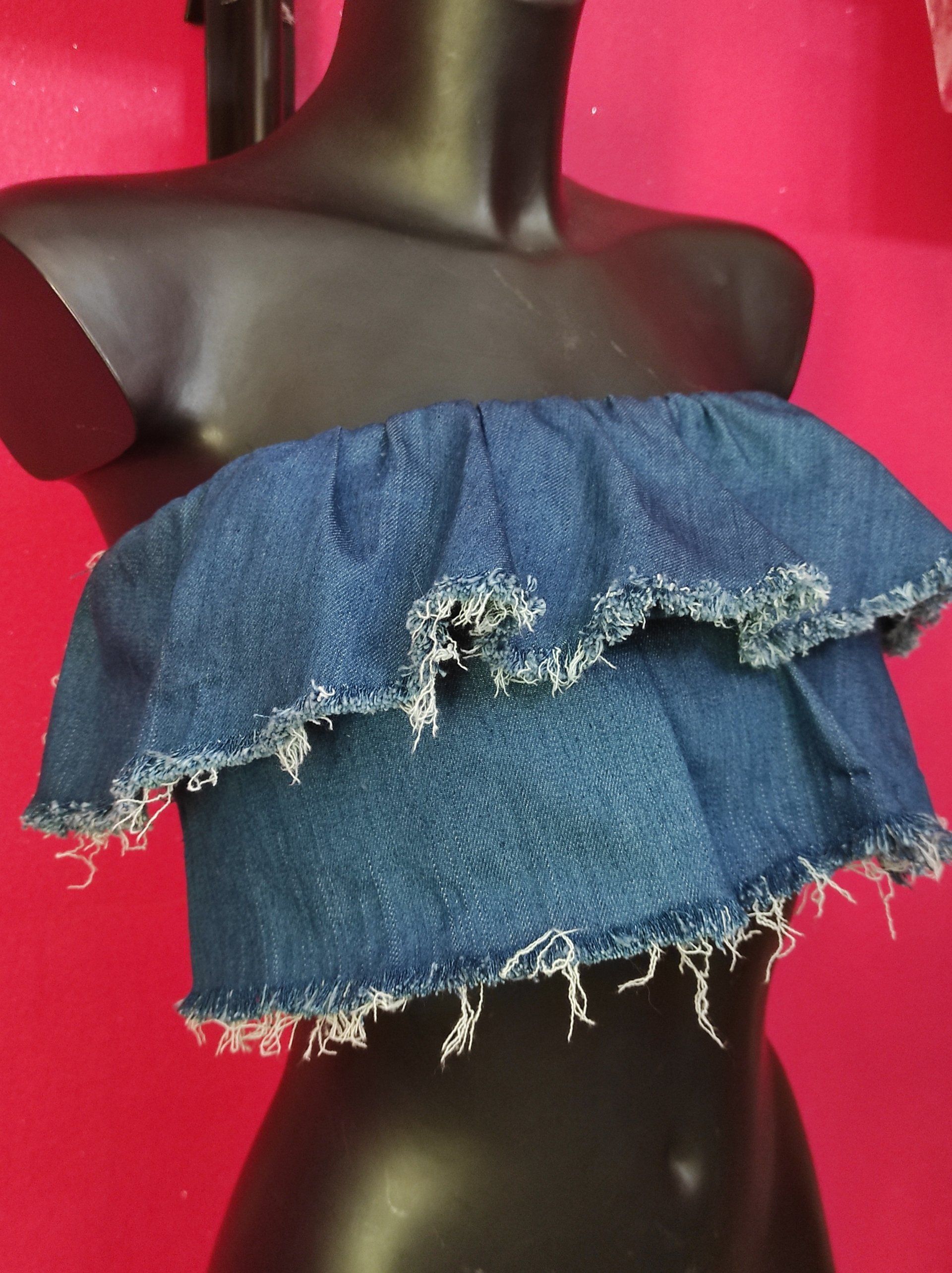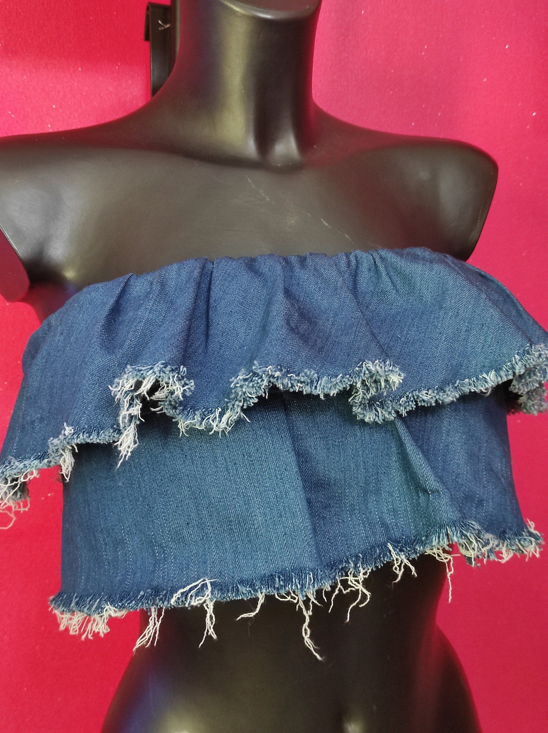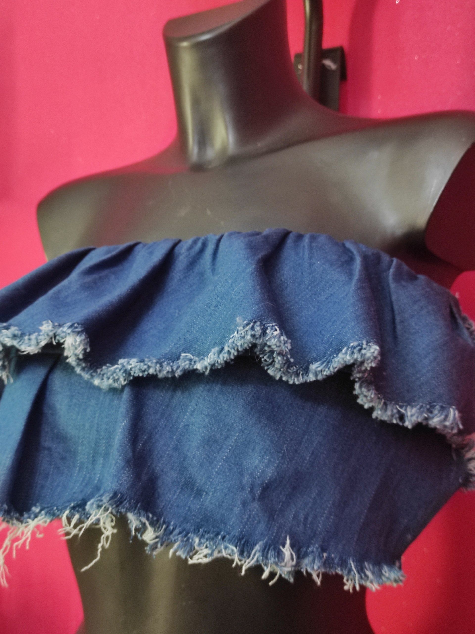 ButtonCrop top a fascia realizzato in denim di ottima fattira, 98% cotone 2 % elastam, particolarissimo per i suoi volant