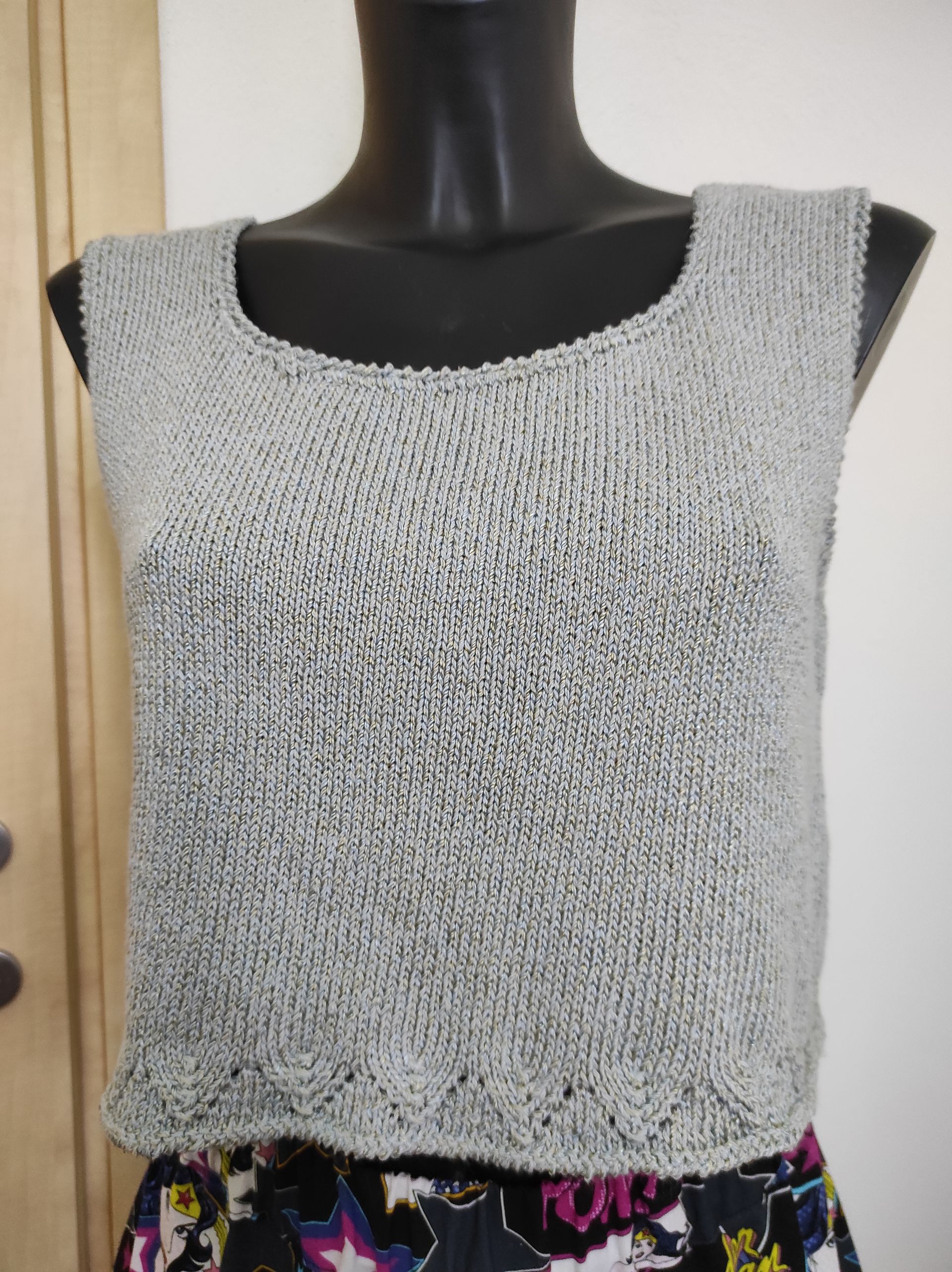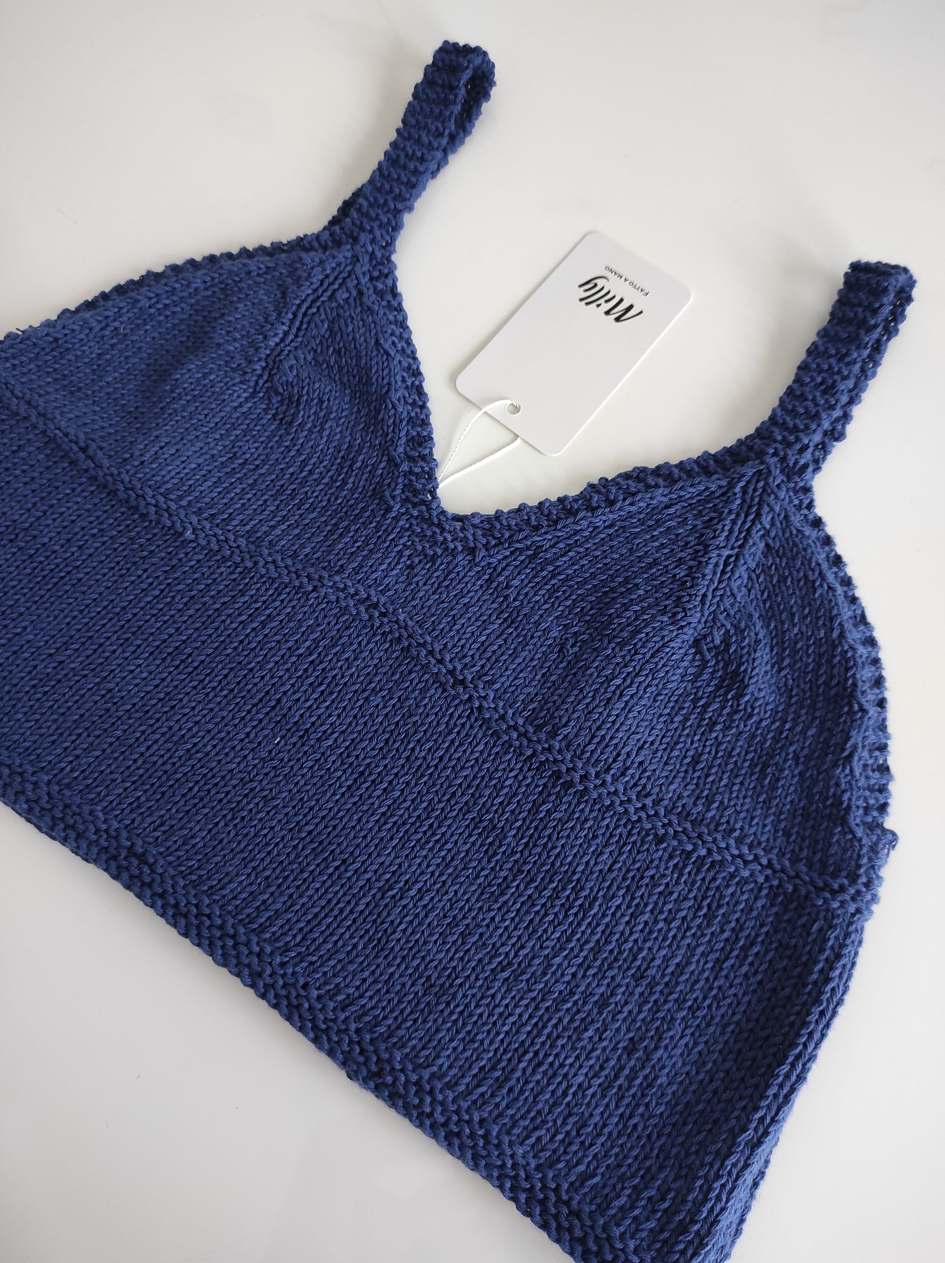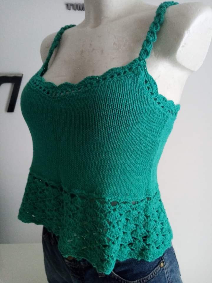 ButtonCanotta corta a spallina larga in filato di cotone e seta, realizzata a macchina con bordo ripreso ai ferri e lavorato a punto traforo, rifiniture all'uncinetto