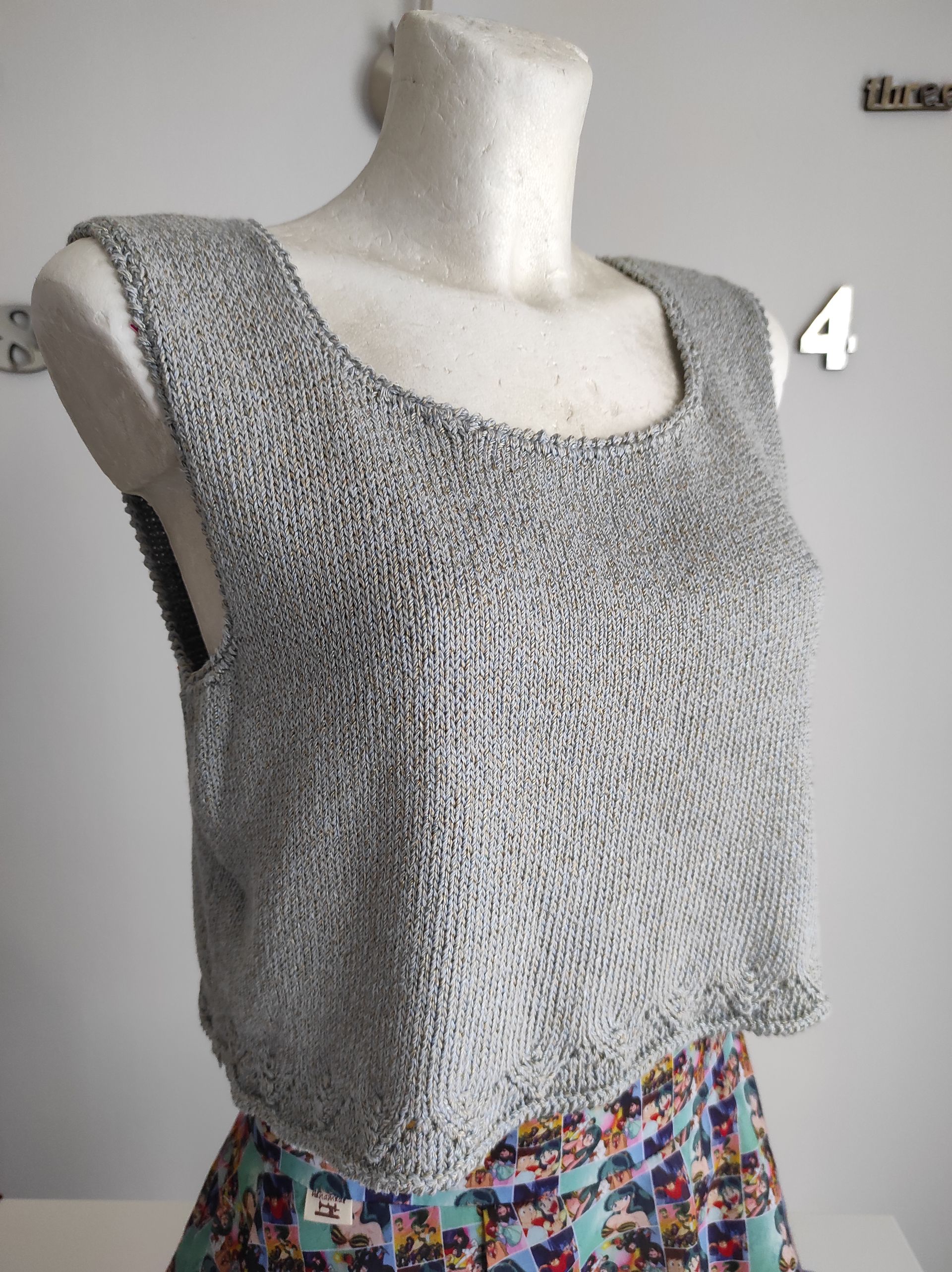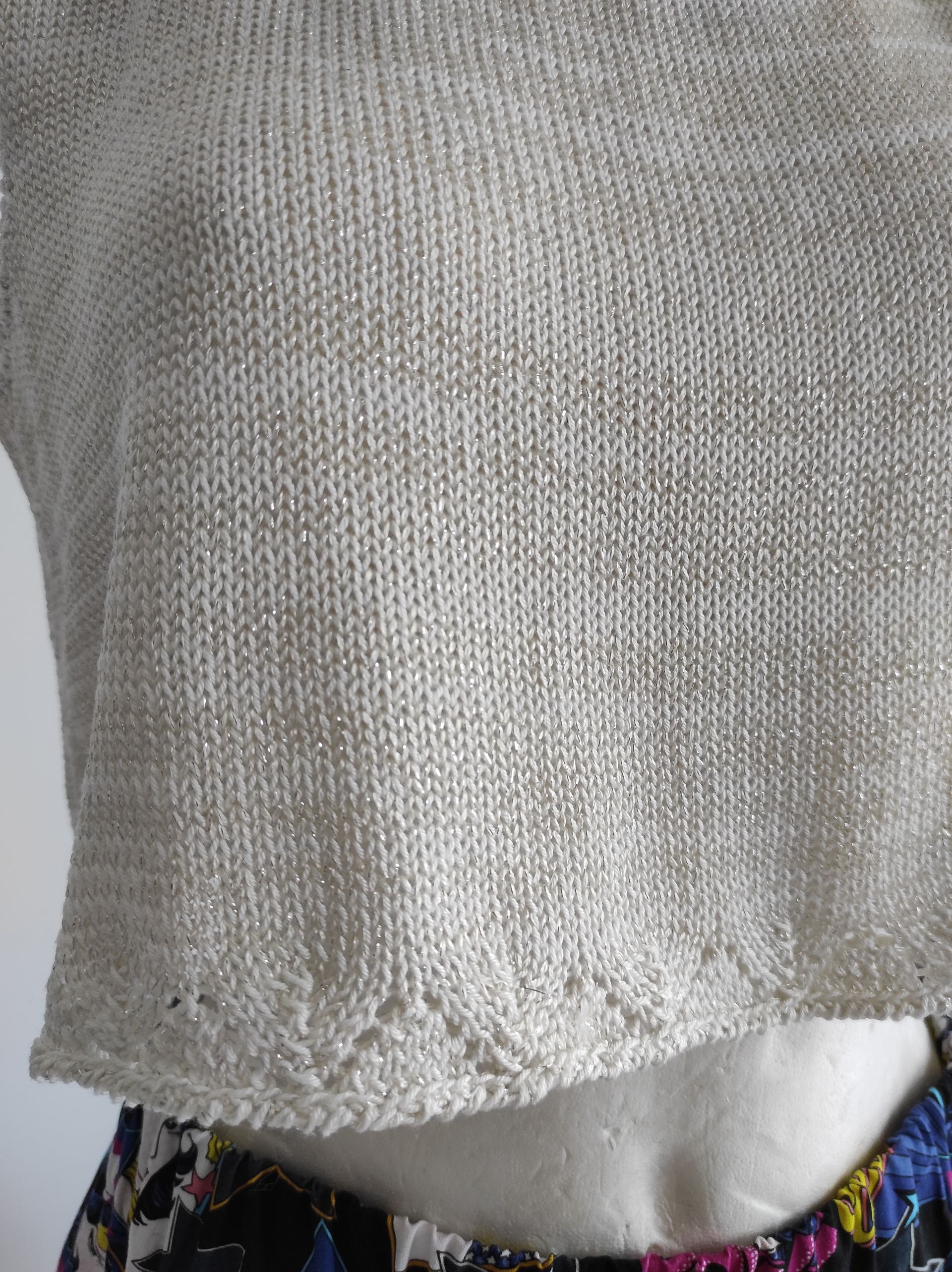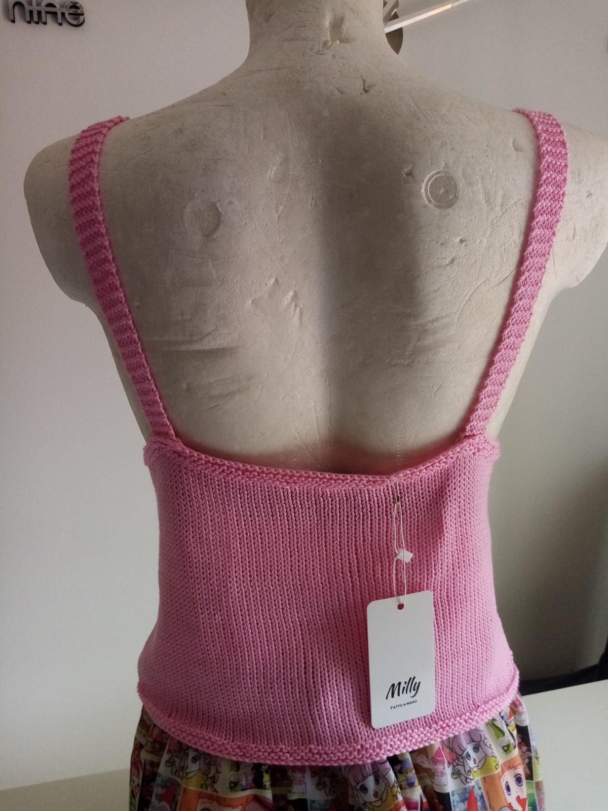 ButtonCanotta corta a spallina larga in filato di cotone e seta, realizzata a macchina con bordo ripreso ai ferri e lavorato a punto traforo, rifiniture all'uncinetto
