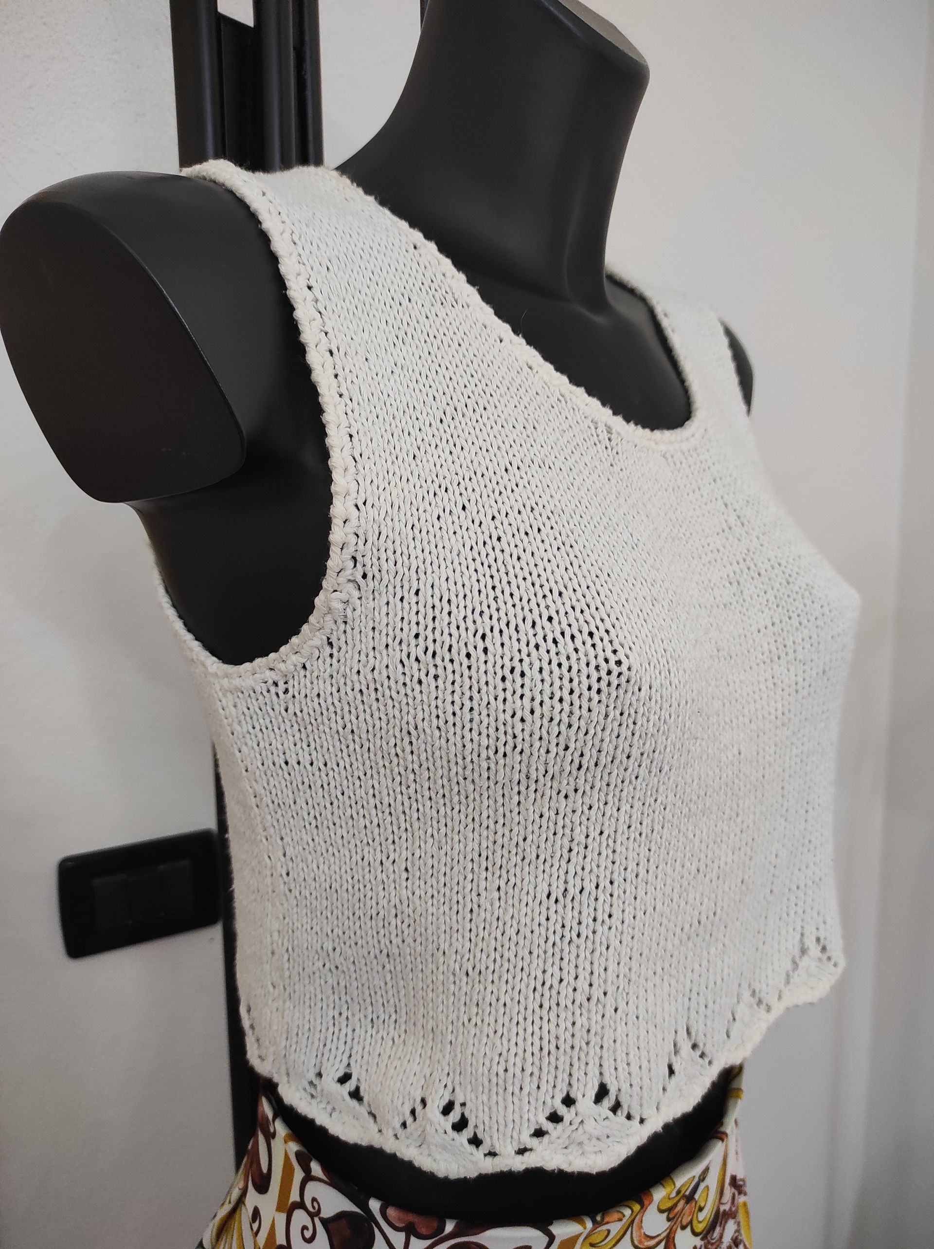 Canotta crop top a spalla larga con scollo a giro e motivo traforo a ventaglio sul fondo, realizzato ai ferri in filato di cotone