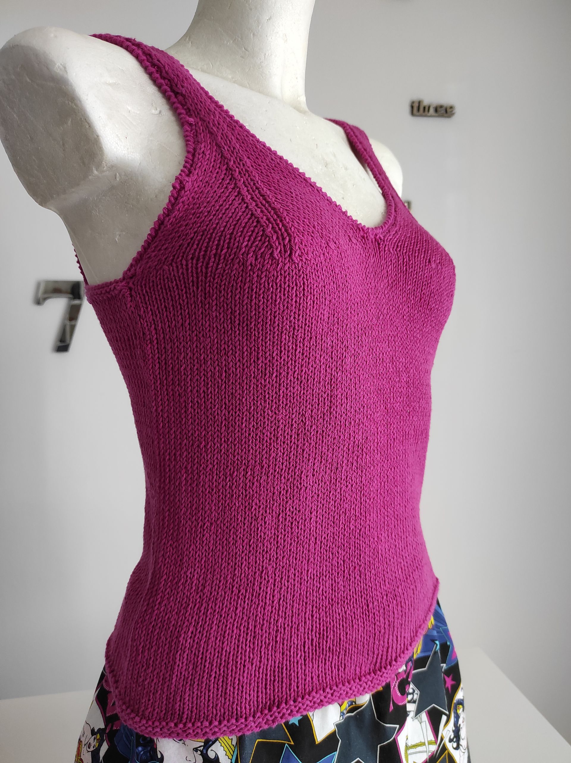 ButtonCanotta realizzata in cotone fucsia, lavorata ai ferri a maglia rasata con scollo a V , spalline sottili e schiena scoperta