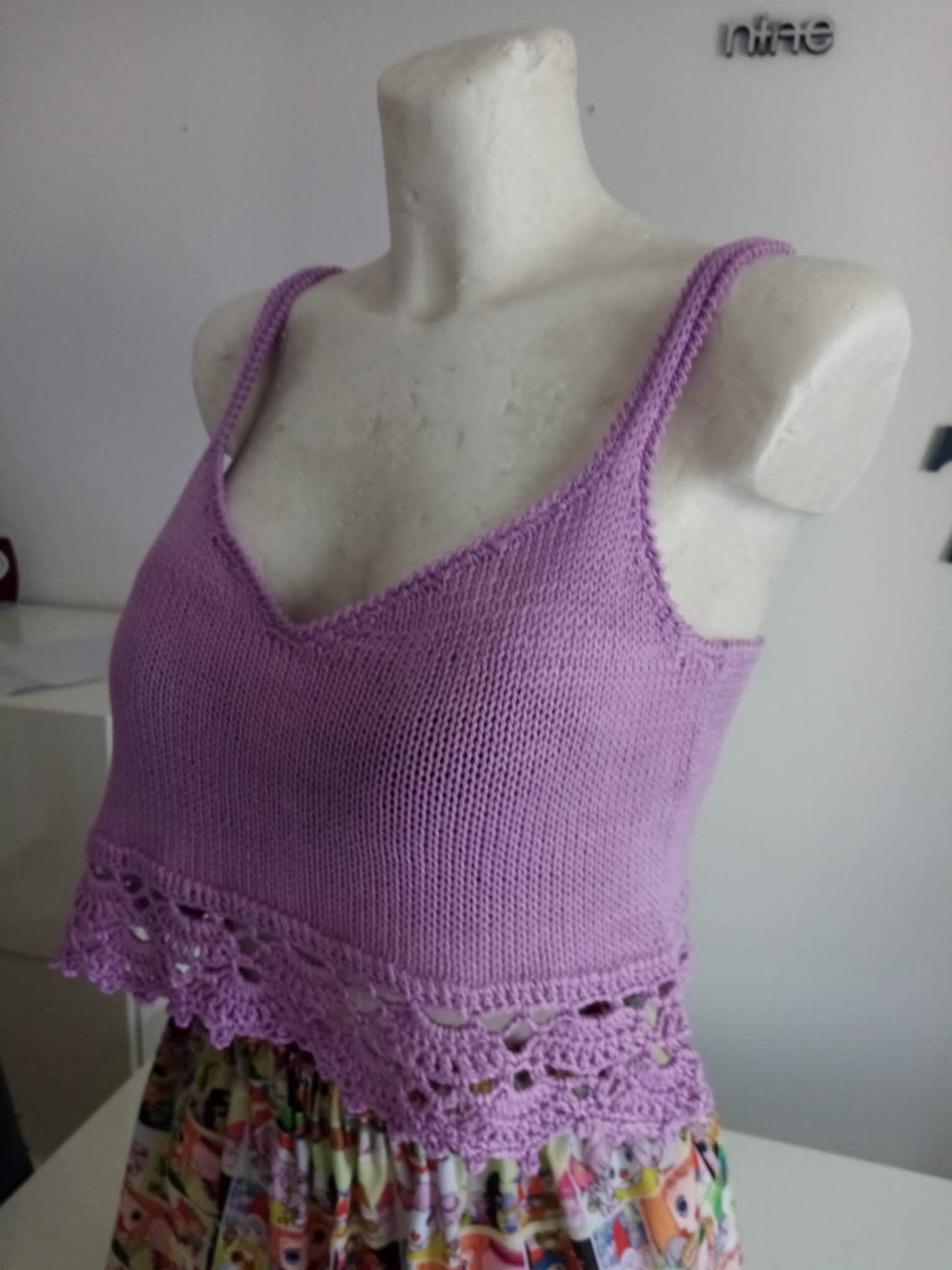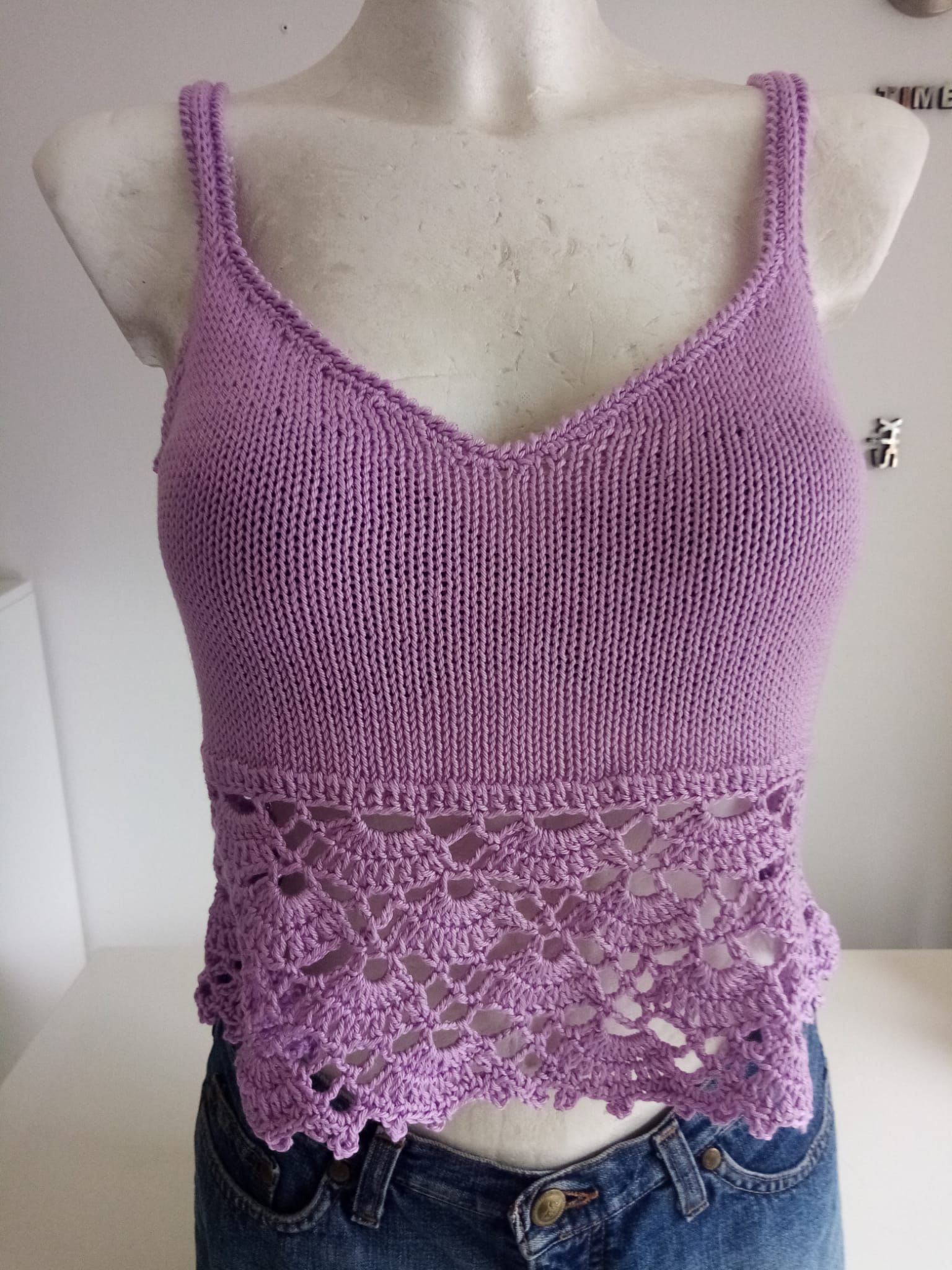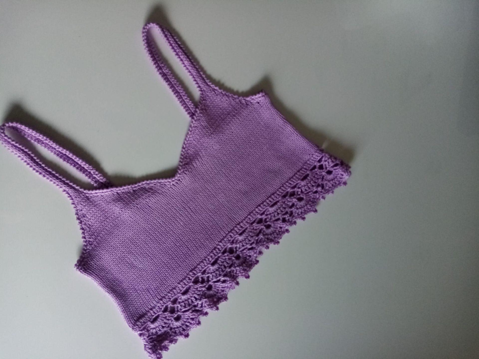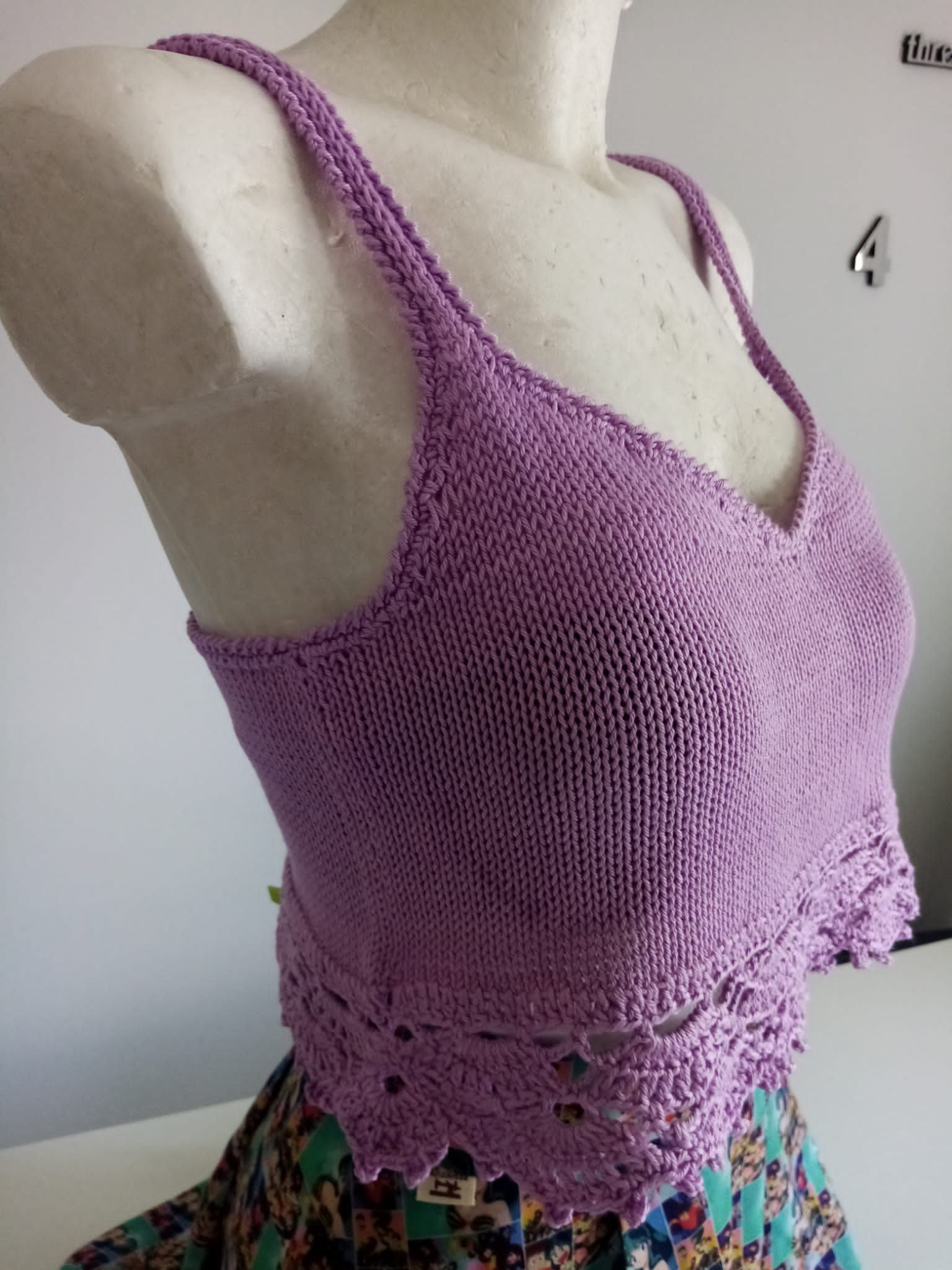Crop top in cotone realizzato ai ferri con motivo a traforo sul fondo, spalline sottili, rifinito all'uncinetto