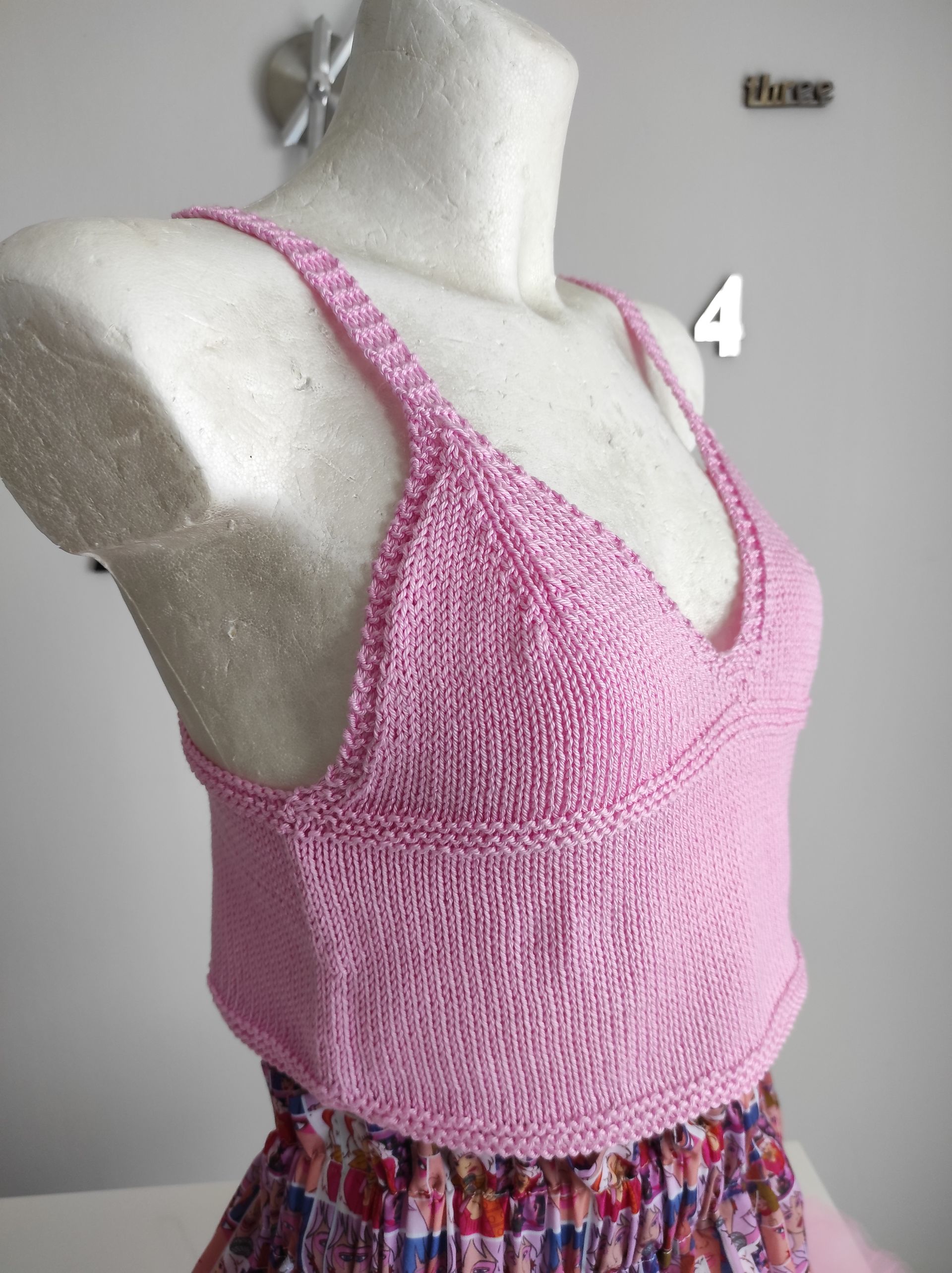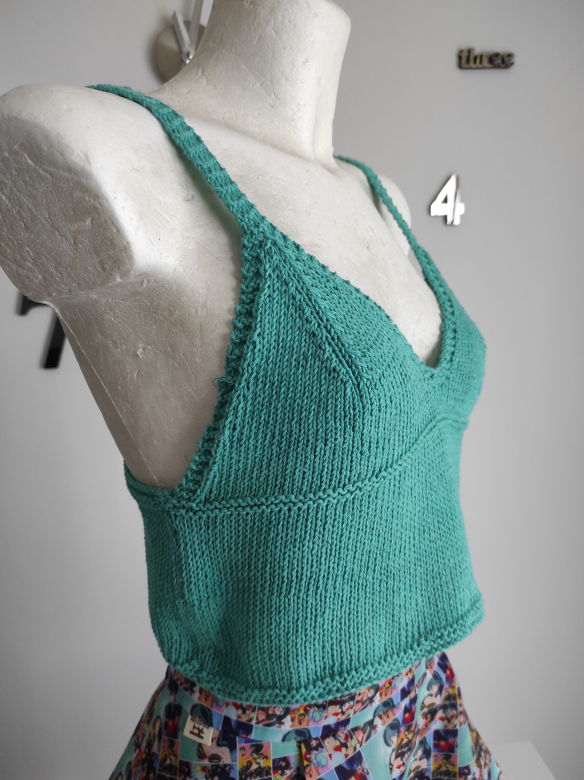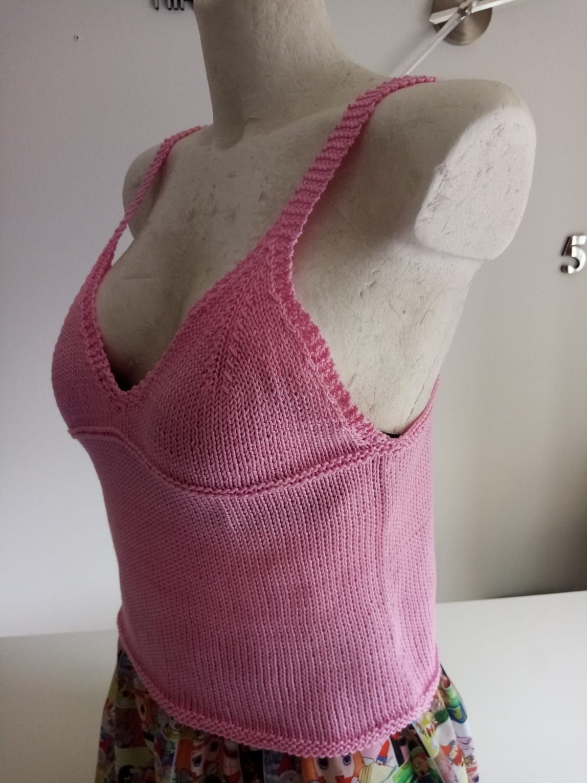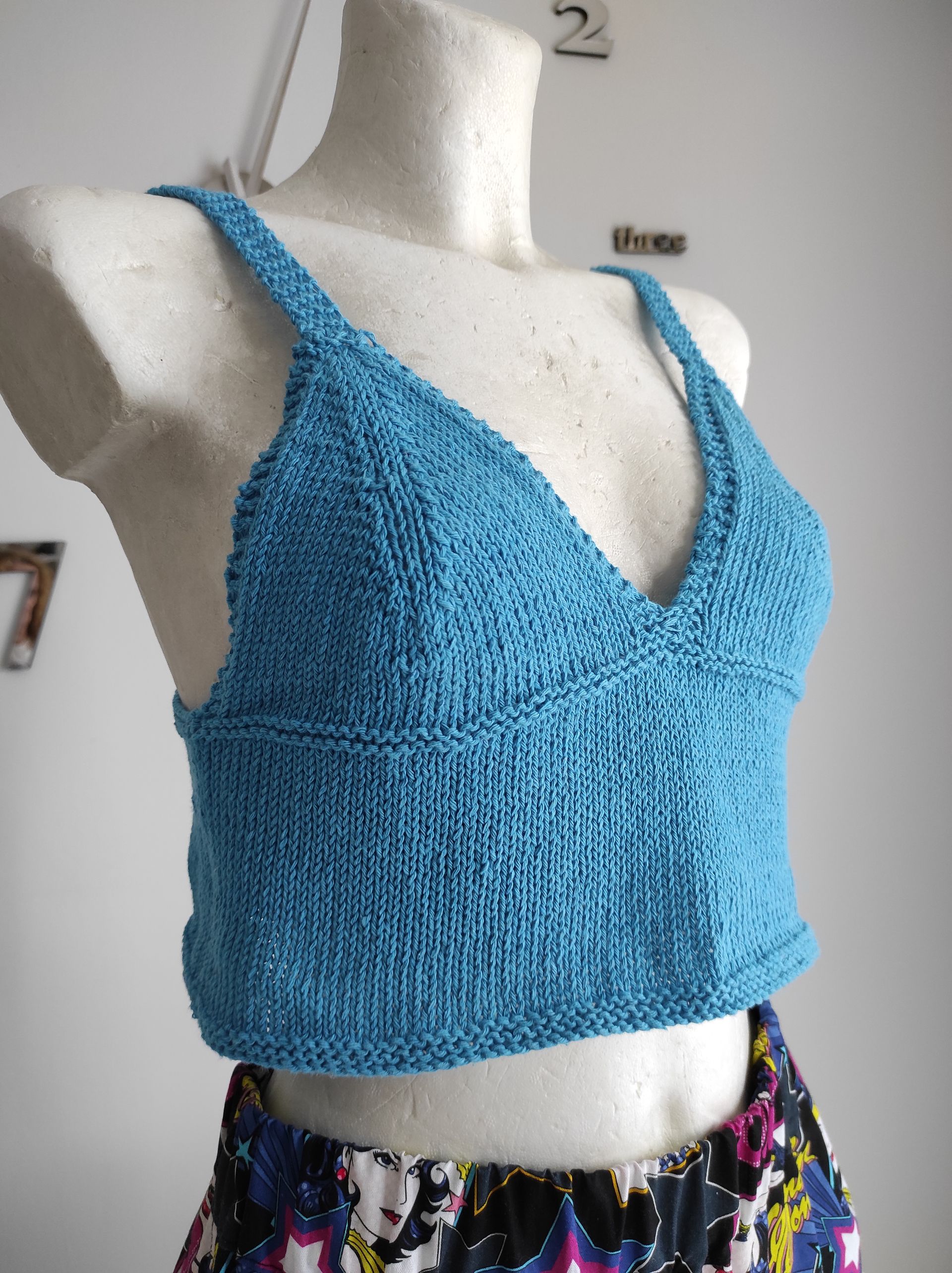 Top corto in colori moda, realizzato in cotone, lavorato ai ferri a maglia rasata, scollo a V con spalline sottili e schiena scoperta